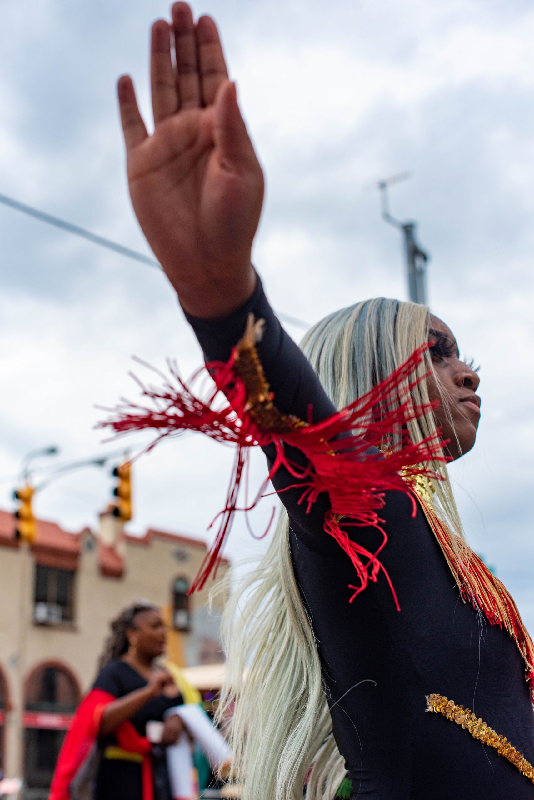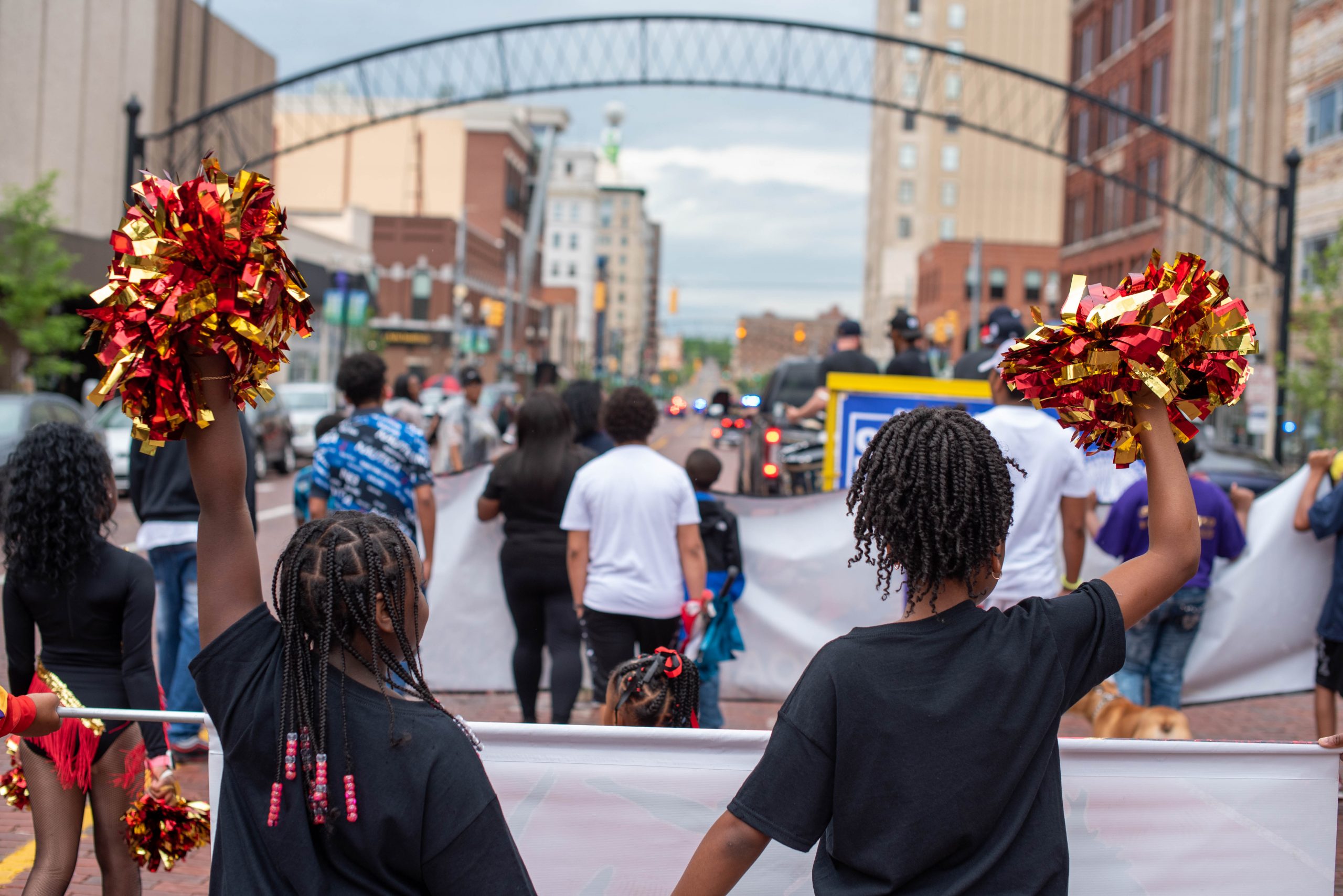 Two members of the Champions Parade hold up two pom poms while making their way down Saginaw Street on Saturday, June 19. (Santiago Ochoa | Flint Beat)