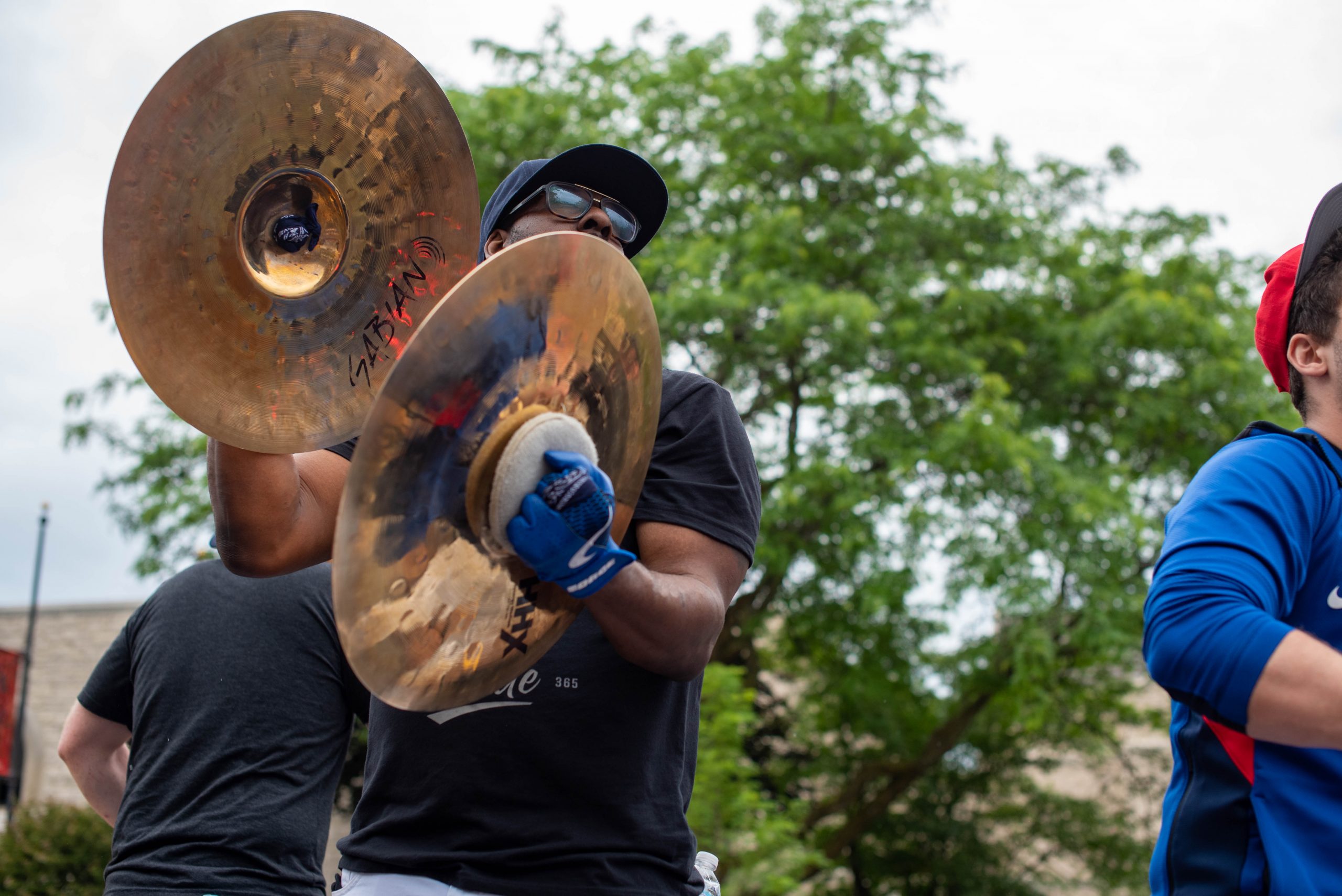 Deanto Townsend, a member of the Pistons Drumline crashes his cymbals together to the beat of the music while travelling down Saginaw Street on Saturday, June 19. (Santiago Ochoa | Flint Beat)