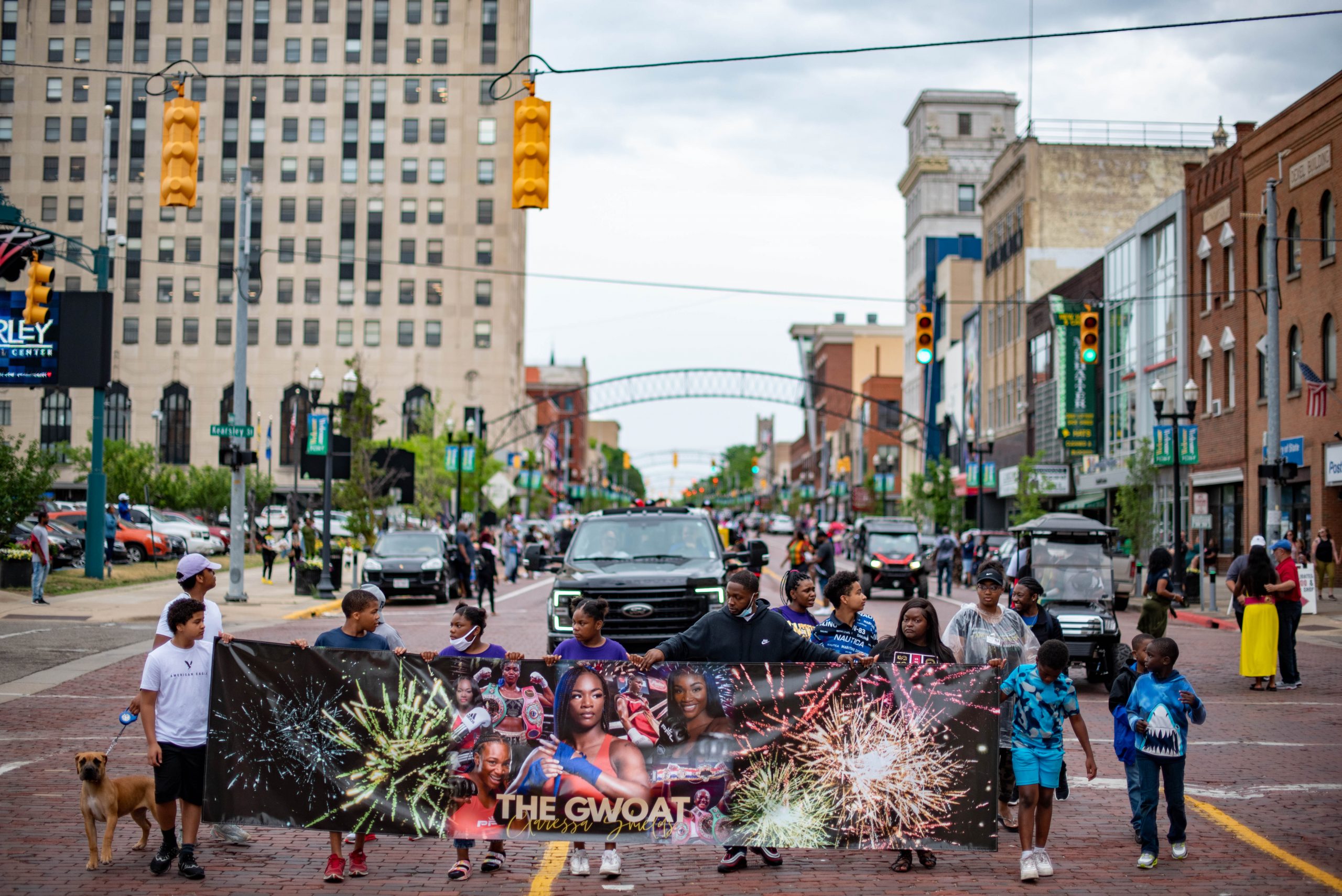 Claressa Shields, 26 world boxing champion and Flint native leads the Champions Parade march organized in her honor on Saturday, June 19. (Santiago Ochoa | Flint Beat)