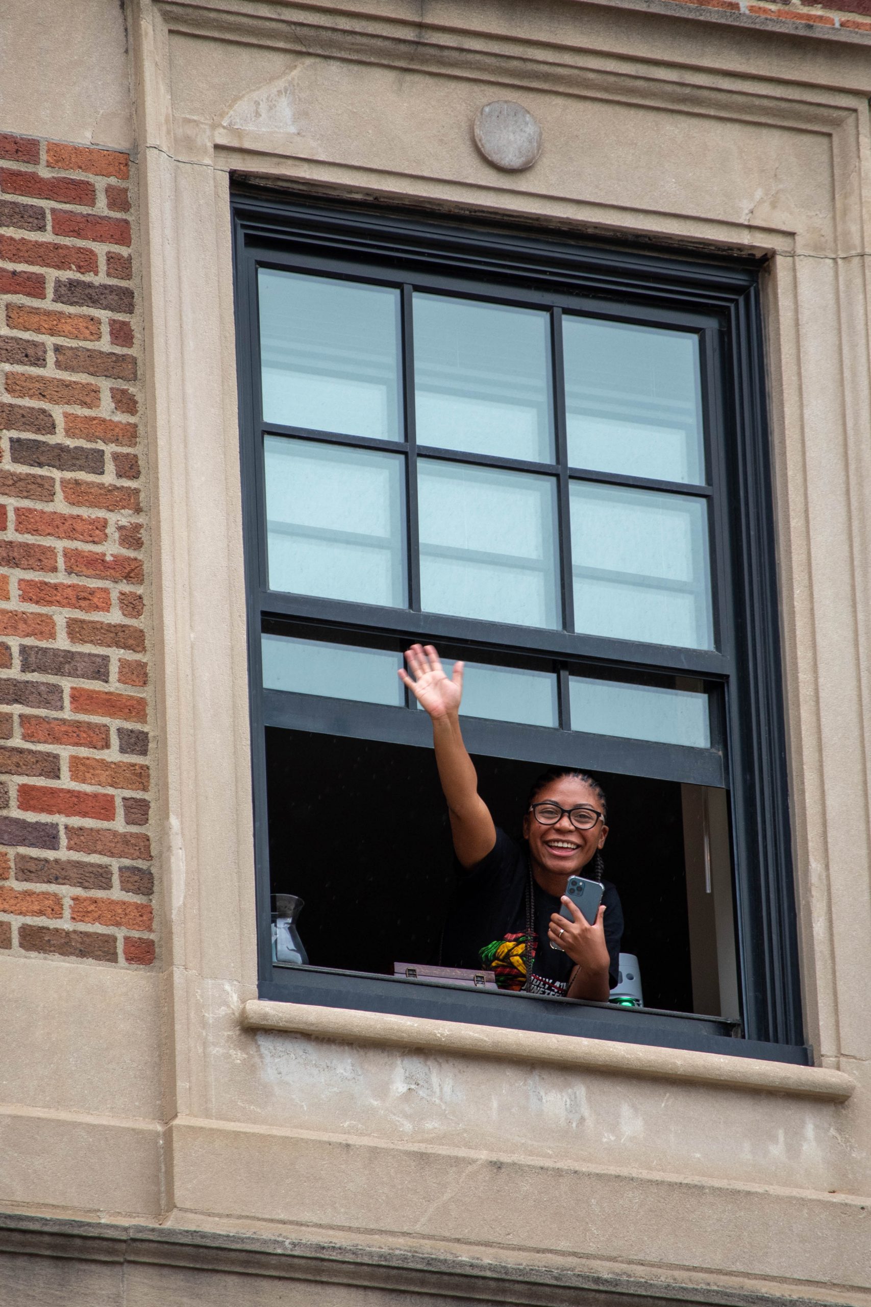 A resident of the Durant apartment building in downtown Flint waves at Claressa Shields as she passes by on Saturday, June 19. (Santiago Ochoa | Flint Beat)