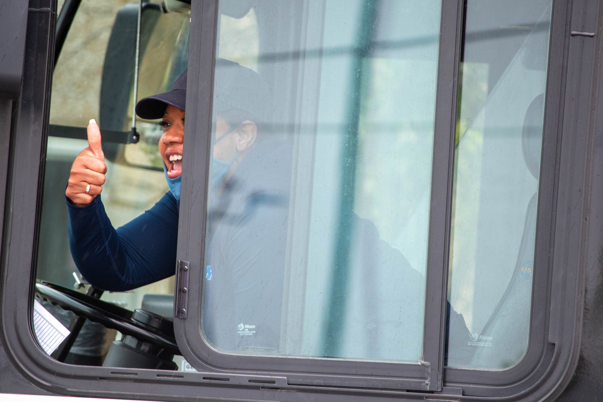 An MTA bus driver gives Claressa Shields a thumbs-up as she drives past the Champions Parade on Saturday, June 19. (Santiago Ochoa | Flint Beat)