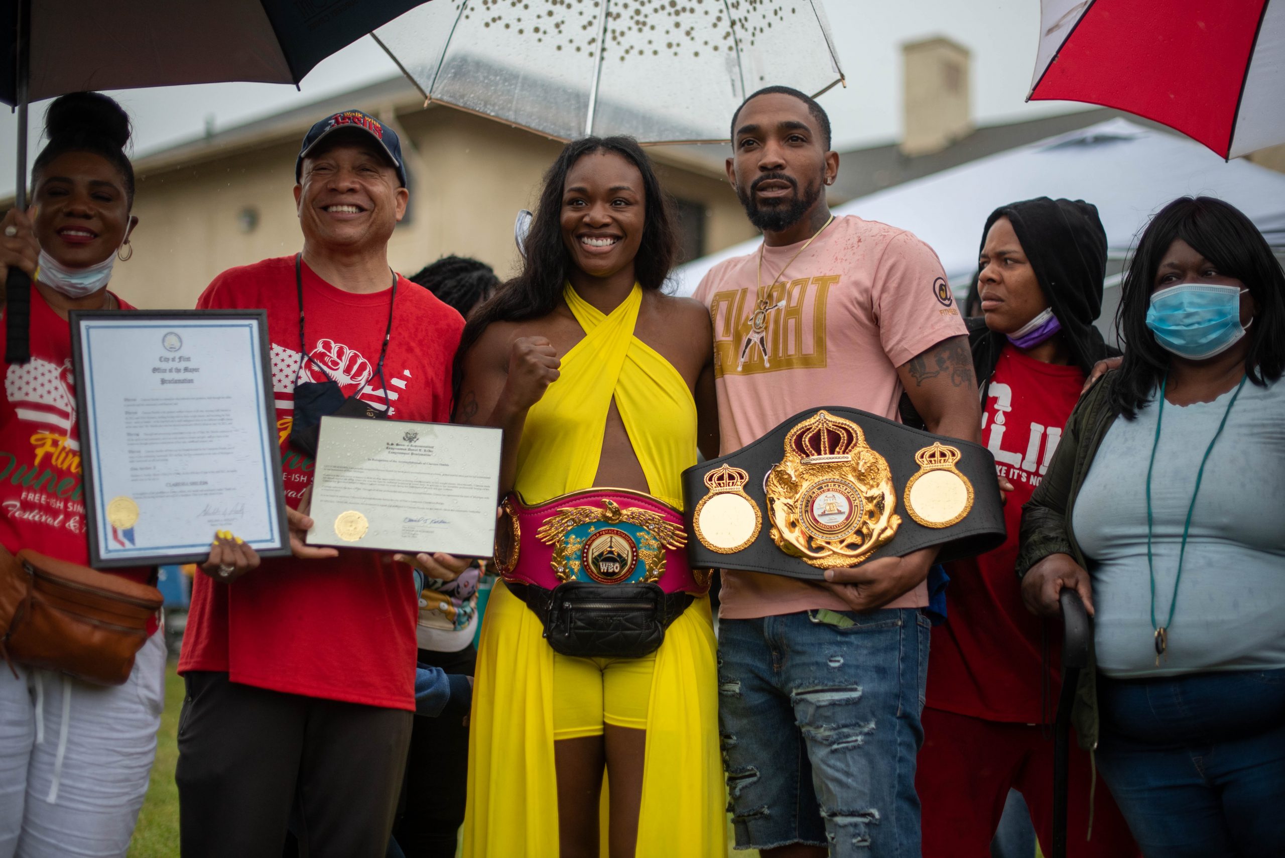 Claressa Shields, 26 stands alongside Mayor Sheldon Neely, 52 and her boyfriend, Tony Richardson, 34 as she receives a certificiate from the city announcing an offical Claressa Shields day on Saturday, June 19. (Santiago Ochoa | Flint Beat)