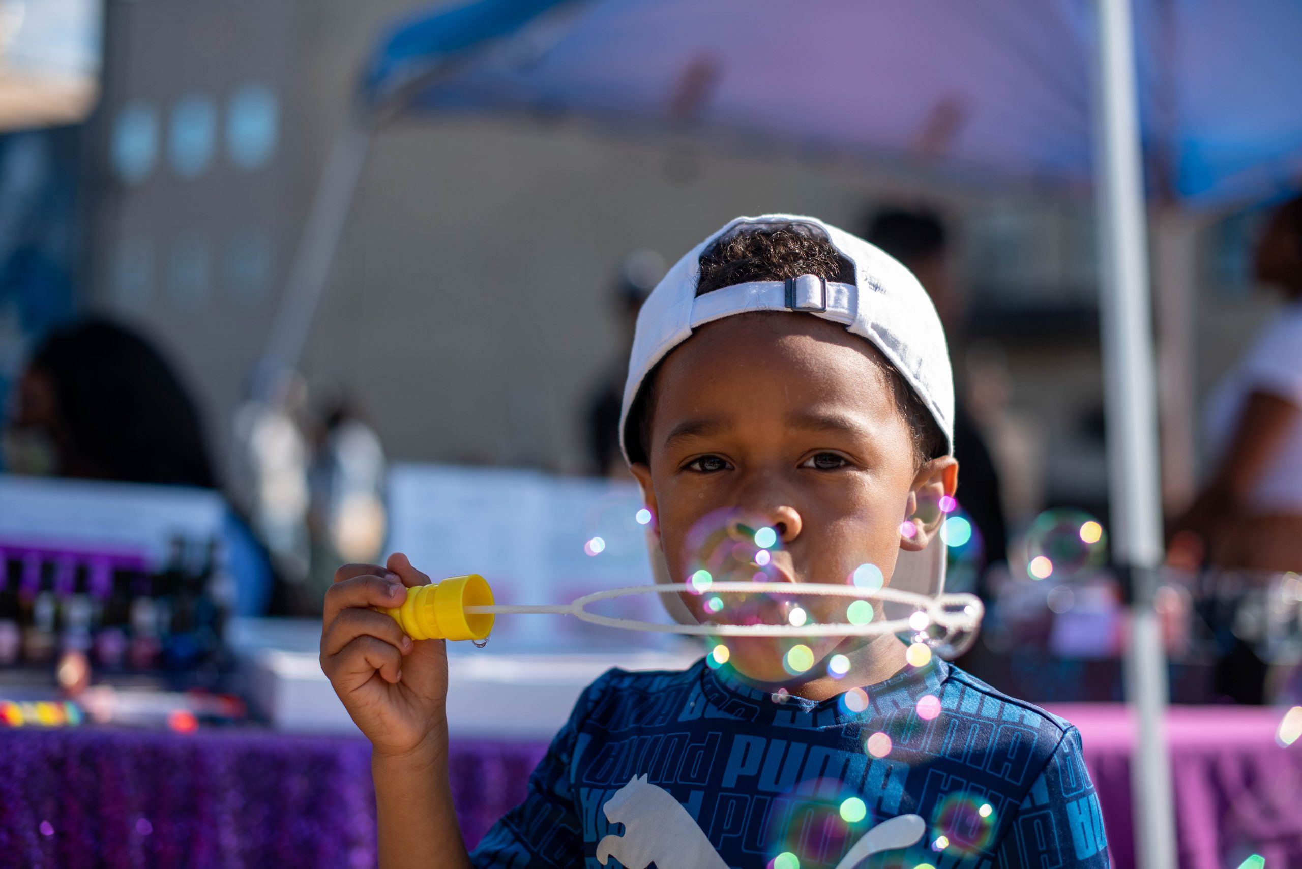 Quandell Brown, 6, blows bubbles at the Brush Park Juneteenth celebration on Saturday, June 19. (Santiago Ochoa | Flint Beat)
