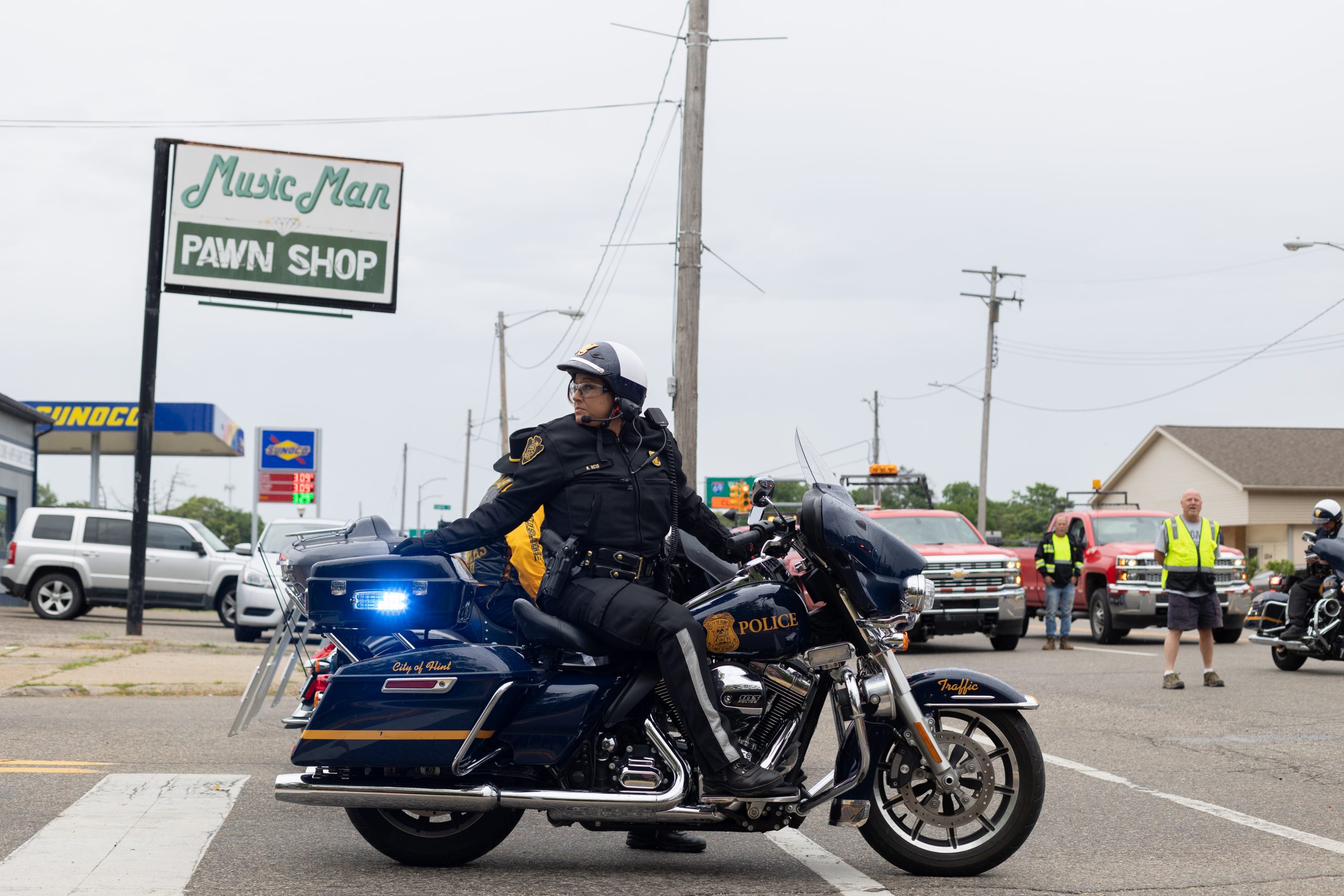 A Flint police officer prepares to escort the Champions Parade celebrating Juneteenth in Flint, Mich, on June 19, 2021. (KT Kanazawich | Flint Beat)