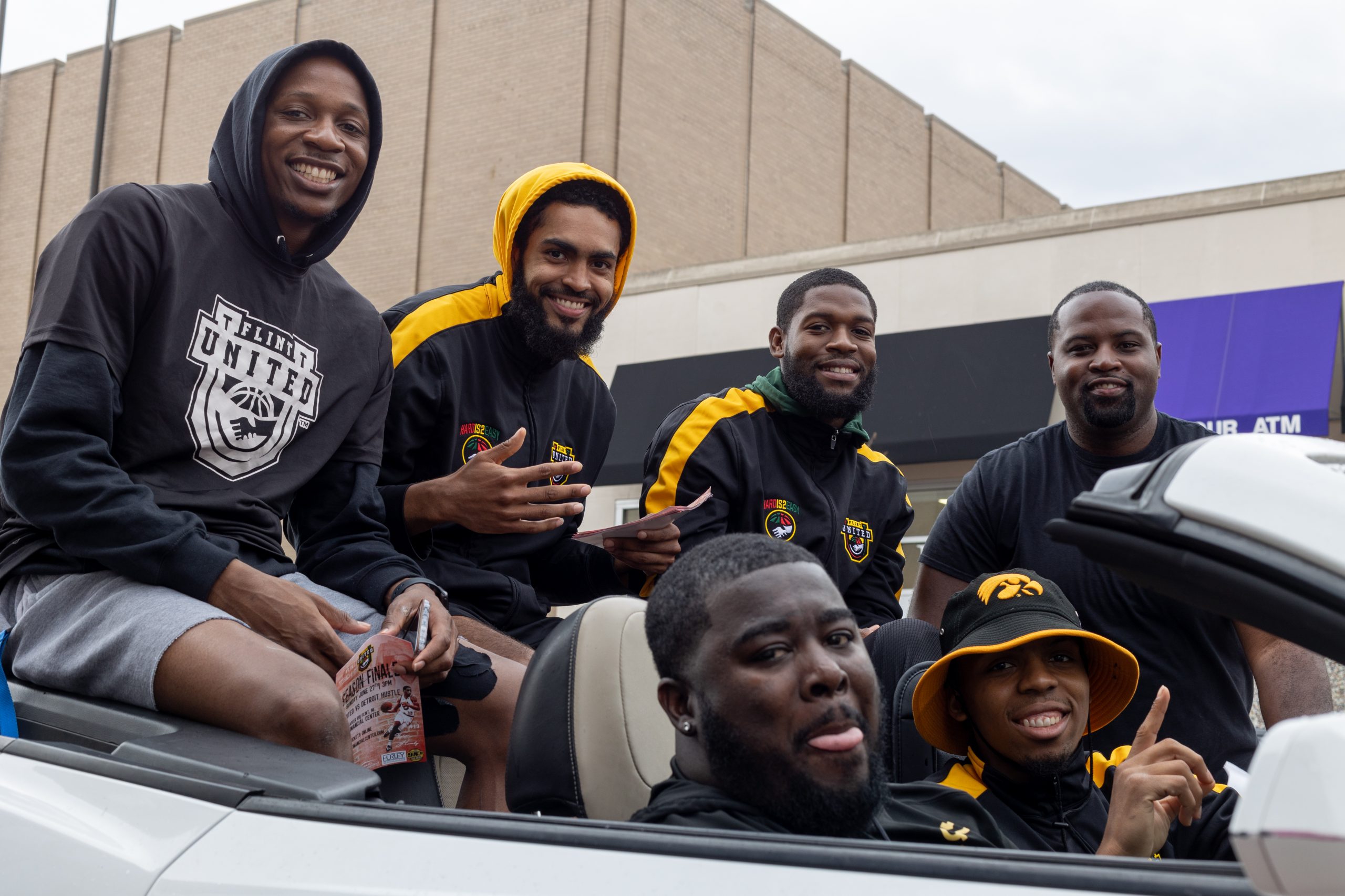 Members of the Flint United Basketball team and Team Market Owner Kevin Mays (right) drive down Saginaw Street for the Champions Parade celebrating Juneteenth on June 19, 2021. (KT Kanazawich | Flint Beat)