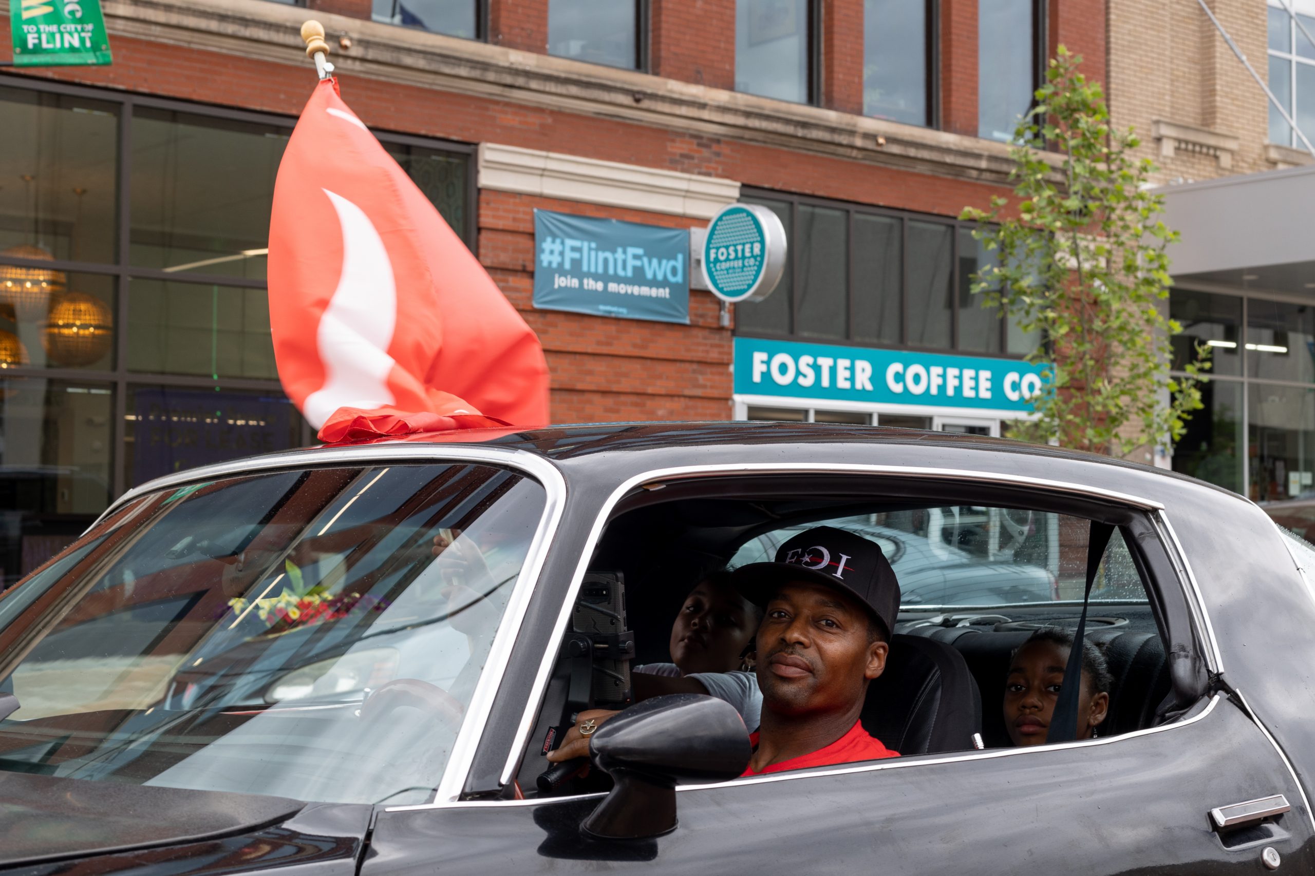 Jalil Carter of Flint represents the Nation of Islam while cruising up Saginaw Street during the Champions Parade celebrating Juneteenth on June 19, 2021.