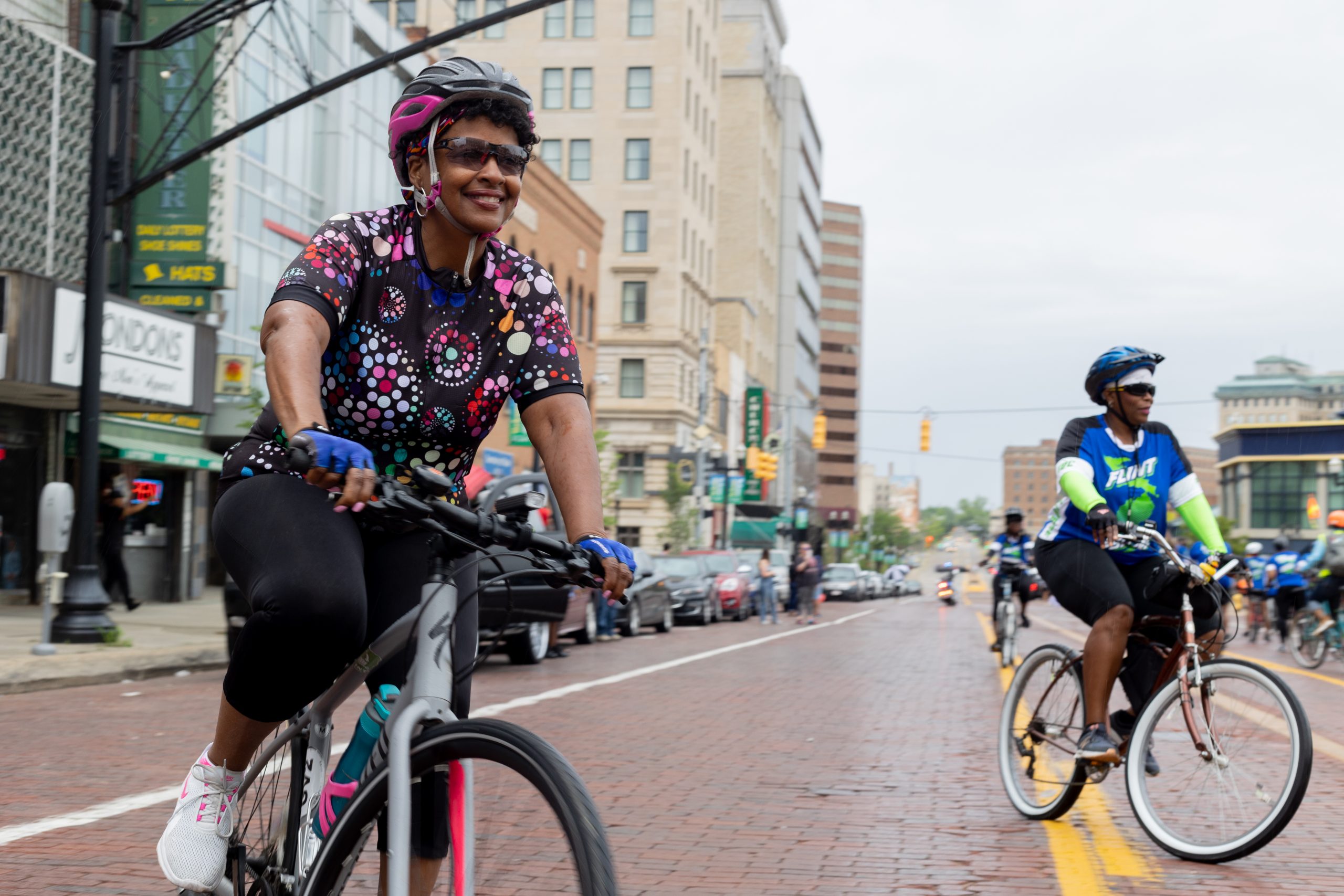 The Flint Faith Riders bicycle up Saginaw Street in Downtown Flint during the Champions Parade celebrating Juneteenth on June 19, 2021. (KT Kanazawich |Flint Beat)
