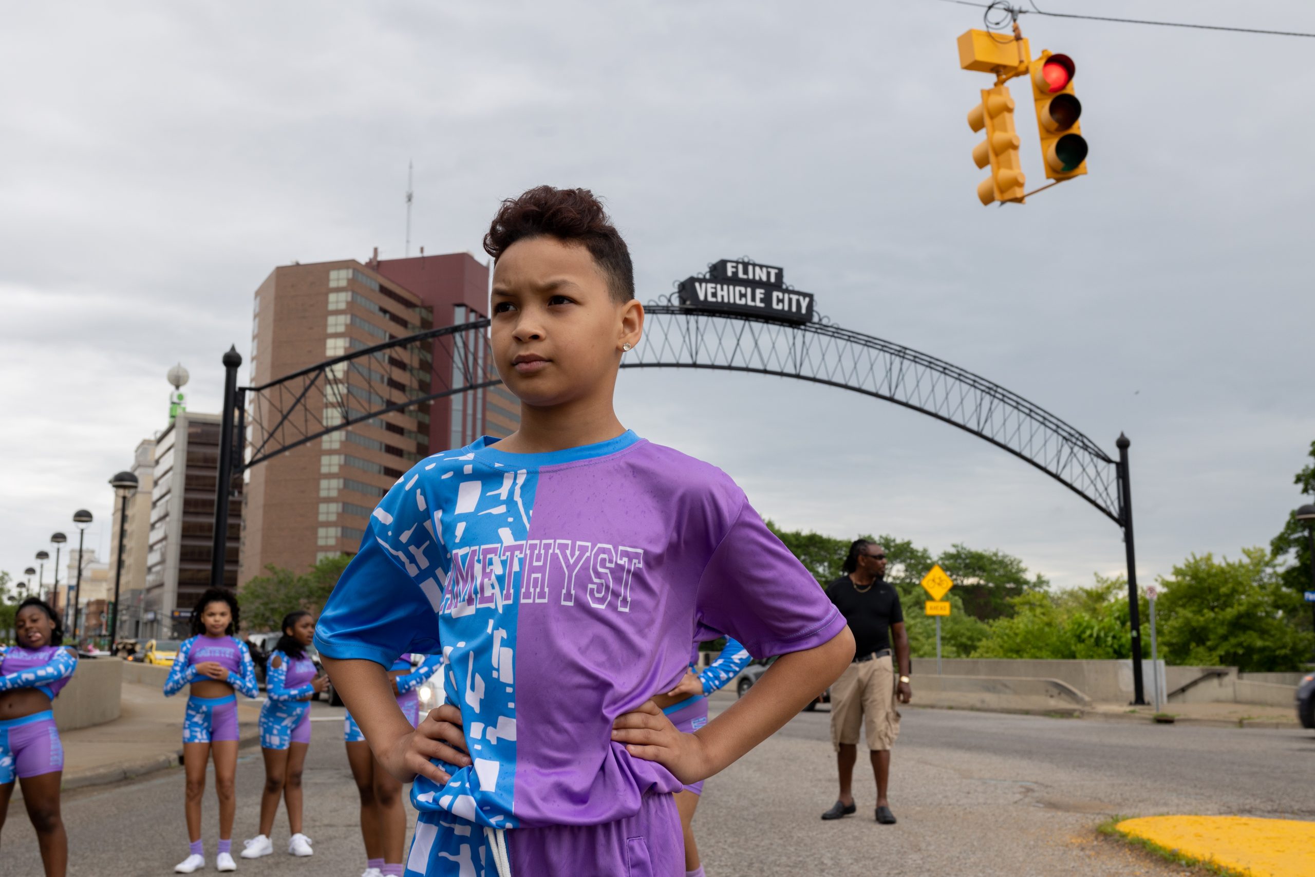 Jakobe Fields, 11, of Flint performs as part of the Amethyst Elite Dance Company team during the Champions Parade celebrating Juneteenth on June 19, 2021. (KT Kanazawich | Flint Beat)