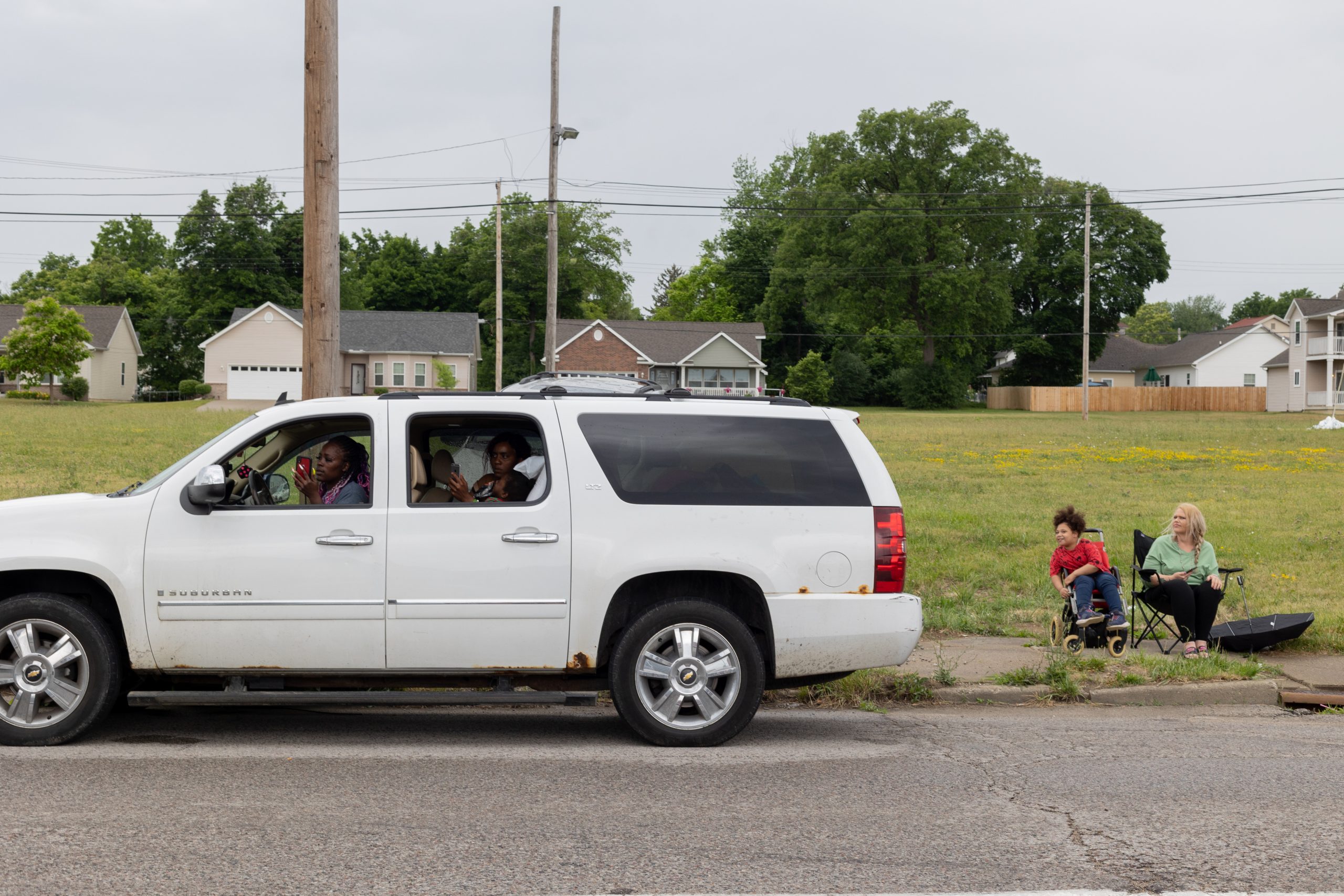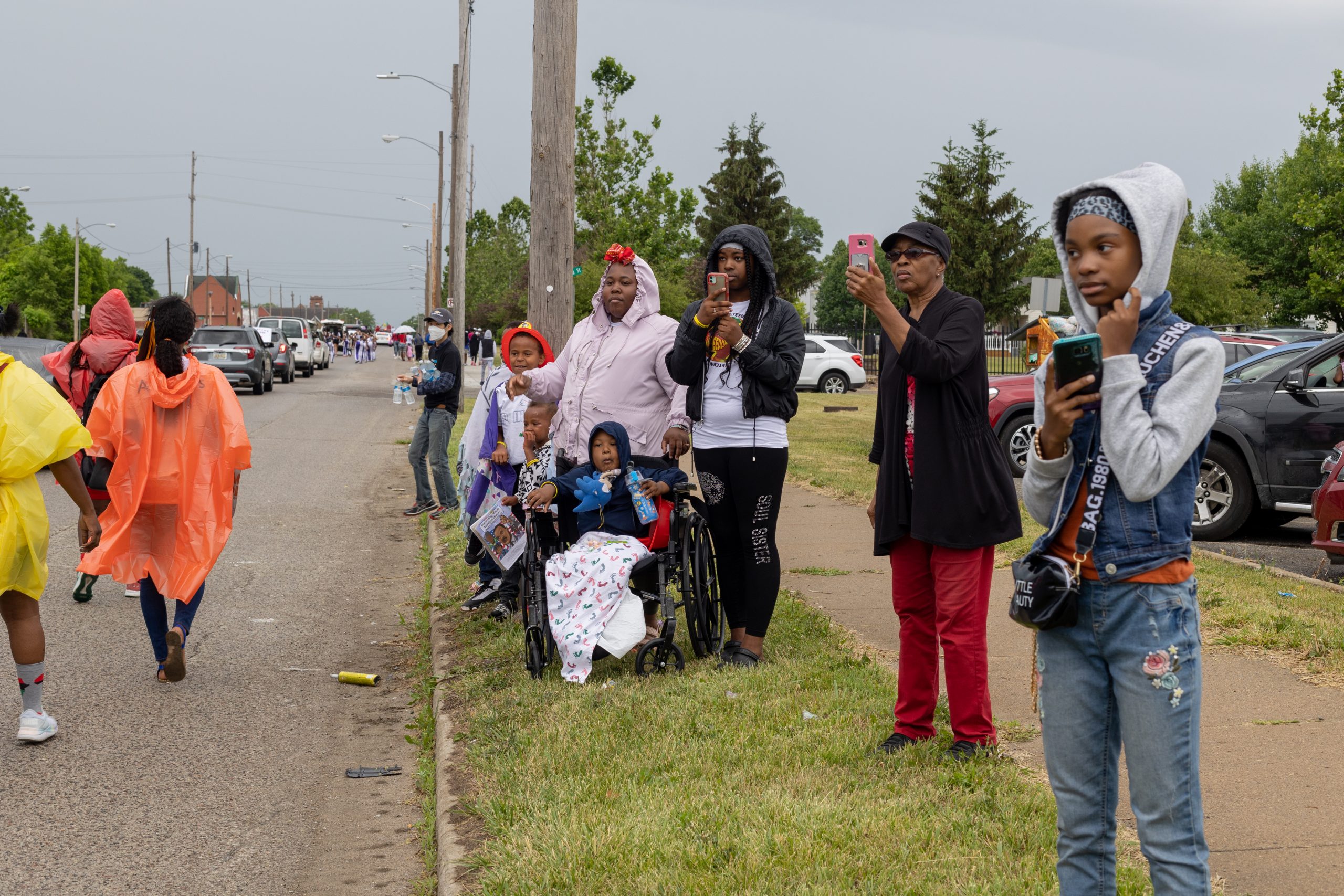 Parade goers stick it out on the sidewalks of N. Saginaw Street throughout the rainy afternoon to watch the Champions Parade celebrating Juneteenth on June 19, 2021 in Flint, Mich. (KT Kanazawich | Flint Beat)
