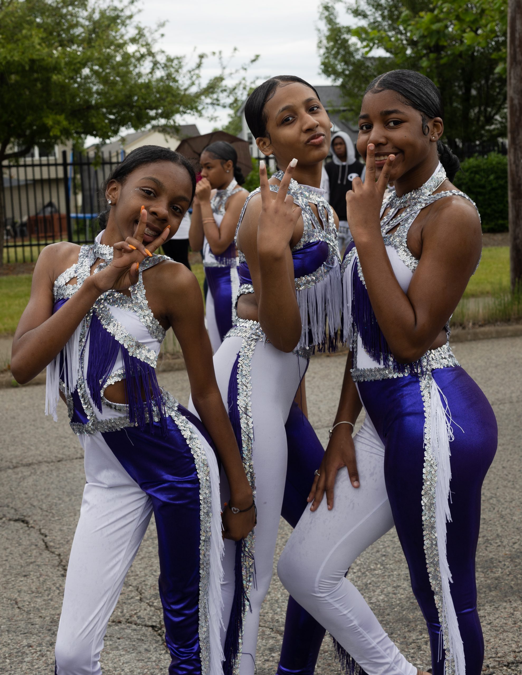 Kamazing Angels Dance Factory dancers (from left) Naenae Veal, 13, Arielle Nelson, 14, and My’Angel Johnson, 14, of Flint pose for a photo on N. Saginaw Street during the Champions Parade celebrating Juneteenth on June, 19, 2021 in Flint, Mich. (KT Kanazawich | Flint Beat)