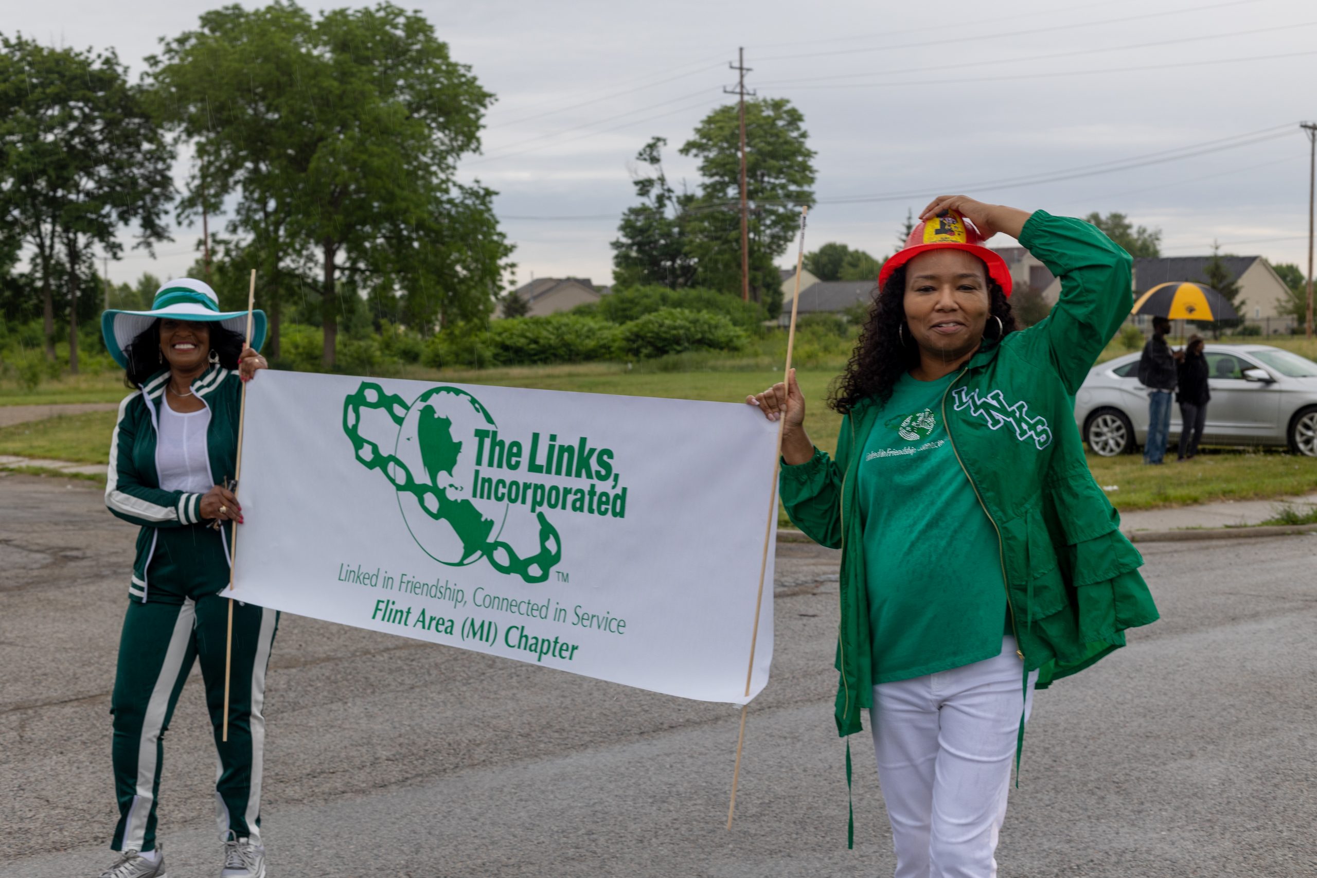 The Links, Incorperated members Chawn Greene-Farmer and Dr. Brenda Rogers-Grays carry a sign up N. Saginaw Street during the Champions Parade celebrating Juneteenth on June 19, 2021 in Flint, Mich. (KT Kanazawich | Flint Beat)