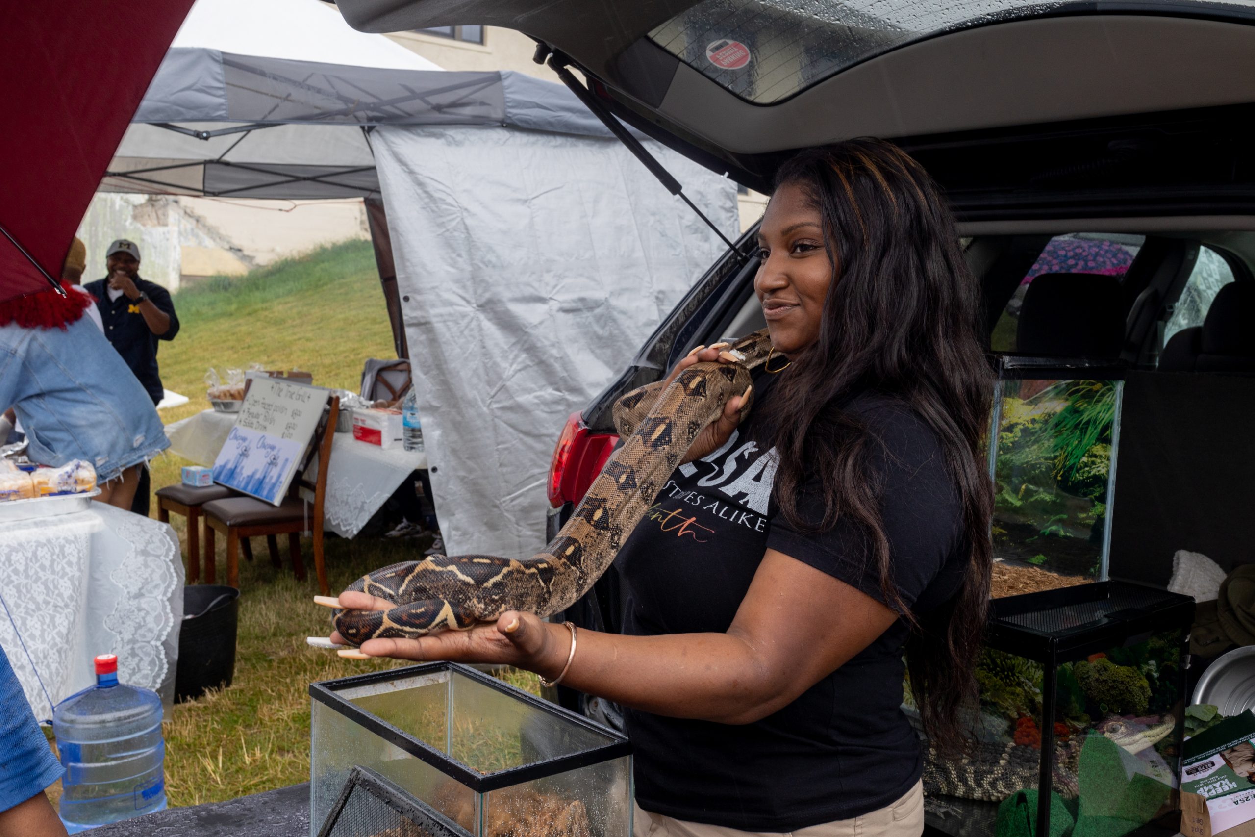 Zoologist Shekinah Wagner Lee brought her snake and other reptiles and insects to educate the community at the Black Wall Street Juneteenth event at the Berston Field House in Flint, Mich. on June 19, 2021. (KT Kanazawich | Flint Beat)