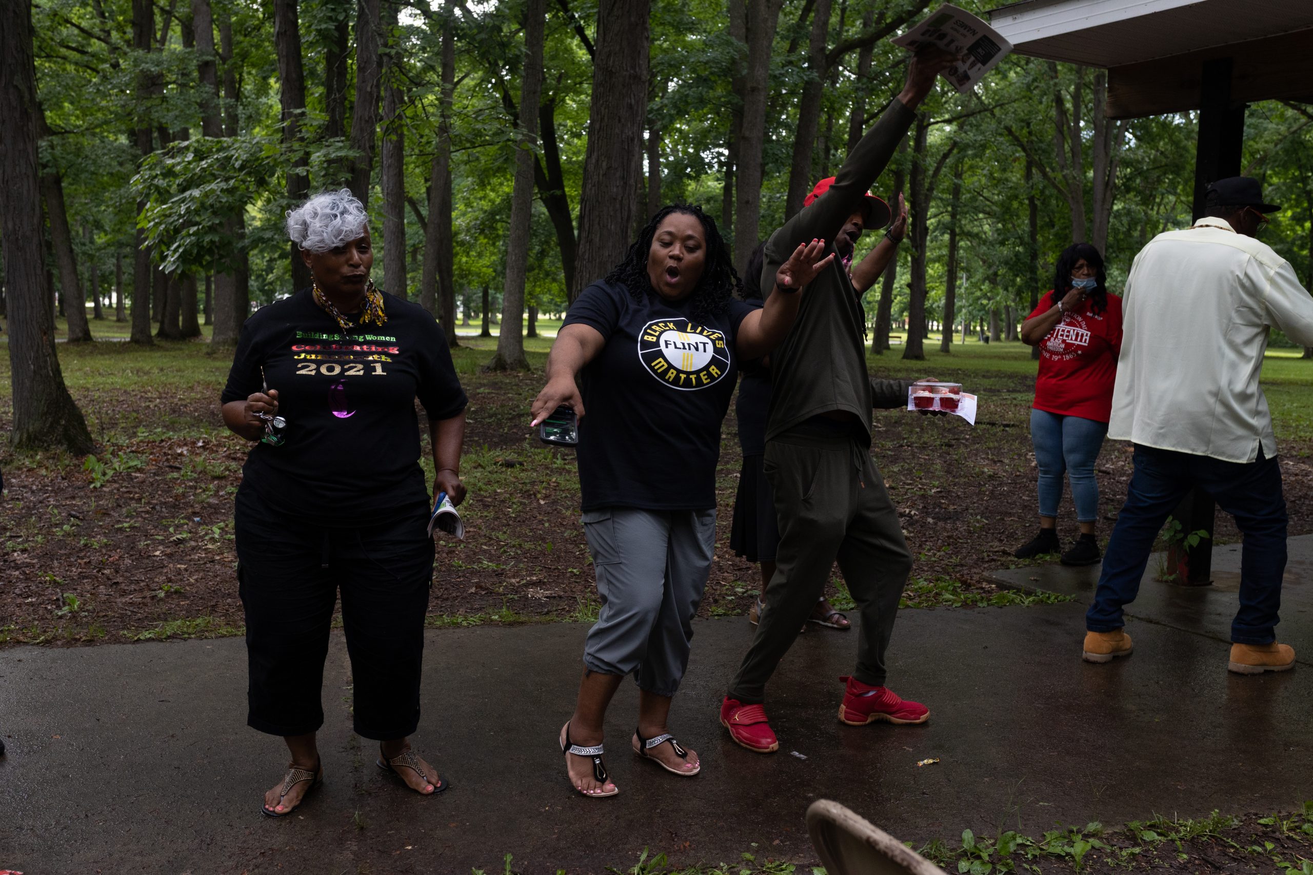 Attendees of the Traditional Juneteenth Celebration at Max Brandon Park in Flint, Mich. dance to the TBR Music Group on June 19, 2021. (KT Kanazawich | Flint Beat)