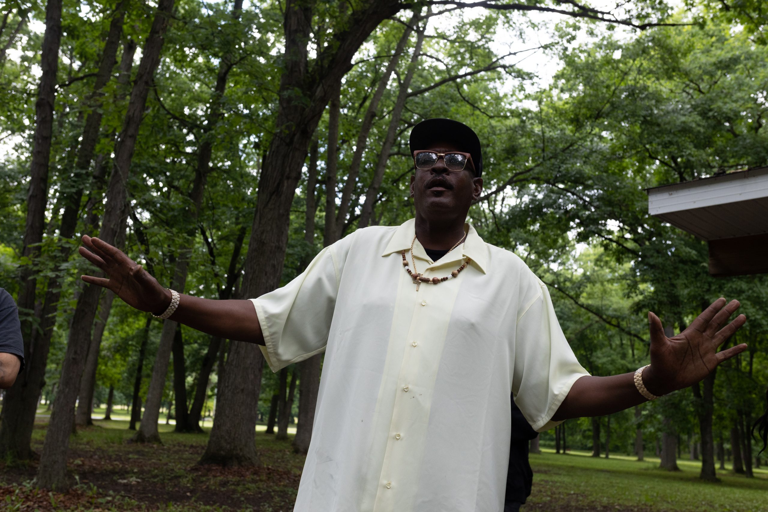 Rich Jones of Flint dances to the sounds of the TBR Music Group at the Traditional Juneteenth Celebration at Max Brandon Park in Flint, Mich. on June 19, 2021. (KT Kanazawich | Flint Beat)
