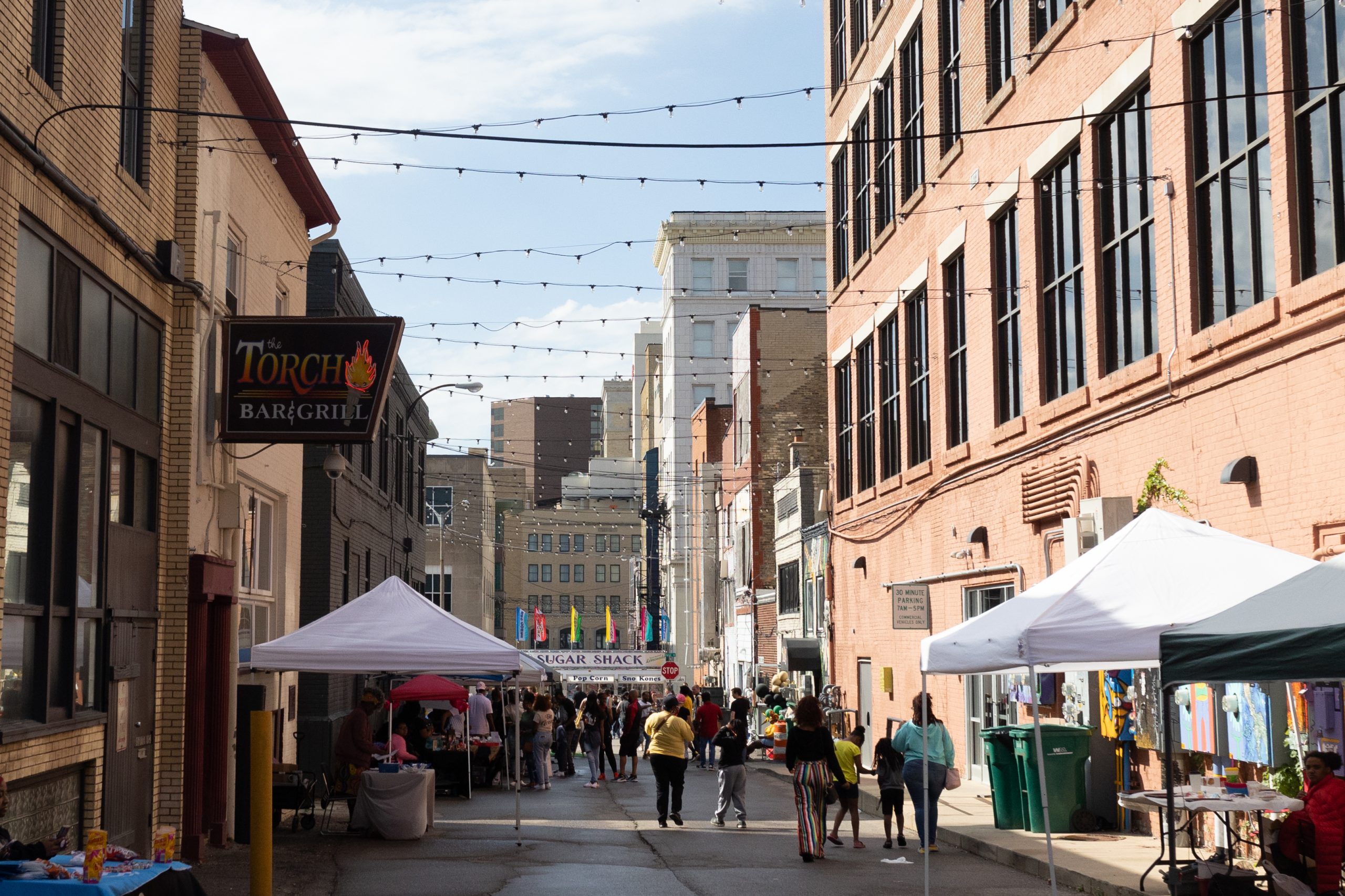 Buckham Alley in Downtown Flint is filled with vendors and bounce houses for the Black Buckham Juneteenth event on June 19, 2021. (KT Kanazawich | Flint Beat)