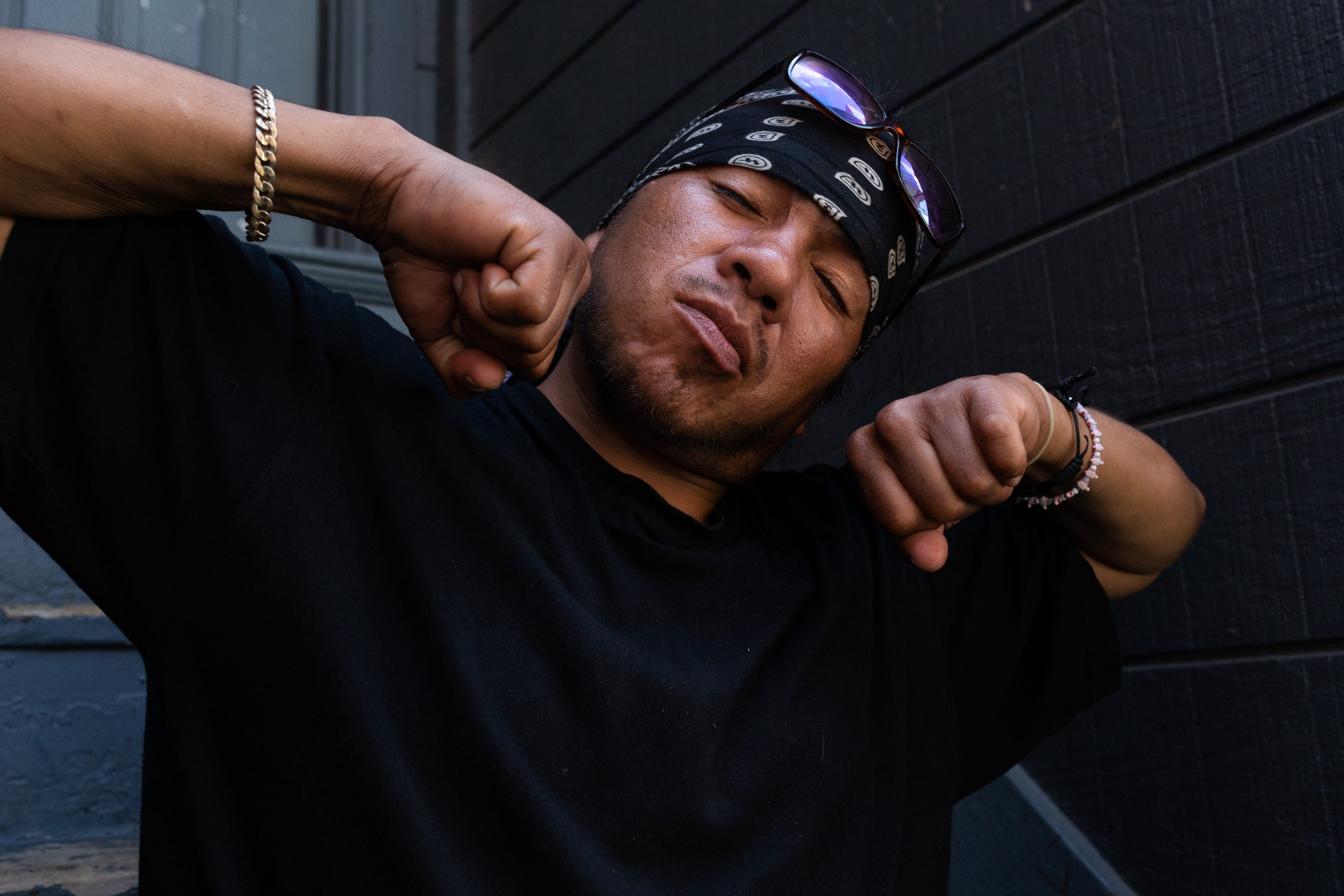 Activist Chasing Hawk, 26, of South Dakota, hangs out at the Poet for Hire booth during the Black Buckham Juneteenth Event in Buckham Alley in Downtown Flint on June 19, 2021. (KT Kanazawich | Flint Beat)