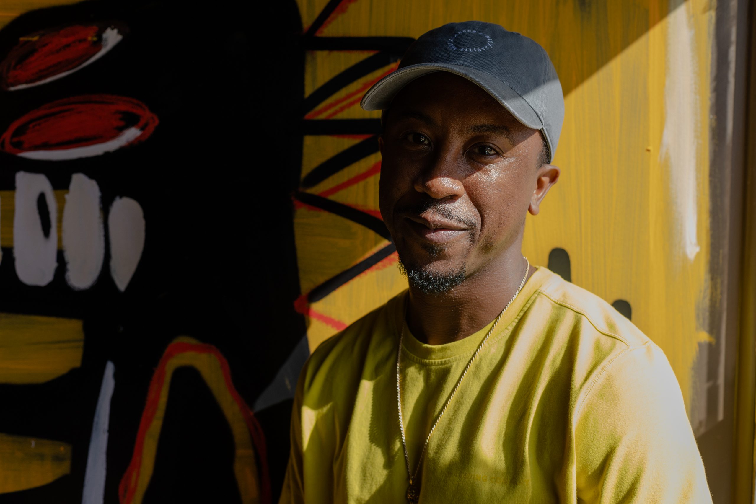 Lee Grant Allen Jr. poses for a photo in front of a Pauly M. Everett painting inside his new space in Buckham Alley in Downtown Flint, Sol Collaborative during the Black Buckham Juneteenth event on June 19, 2021. The space will host pop-ups featuring local artists and designers and will eventually become a streetwear and sneaker store. (KT Kanazawich | Flint Beat)