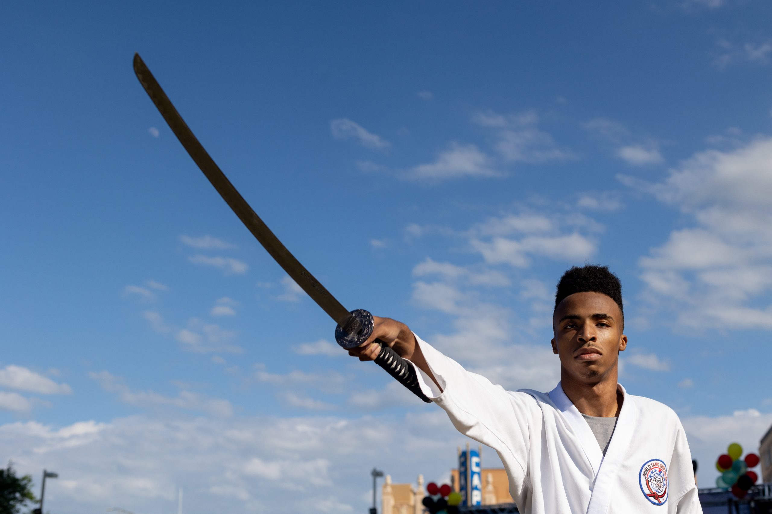Student from Double Dragon Tang Soo Do studio, Corey Straham, 17, of Flint, raises his sword in Brush Park during the Juneteenth celebrations on June 19, 2021. (KT Kanazawich | Flint Beat)
