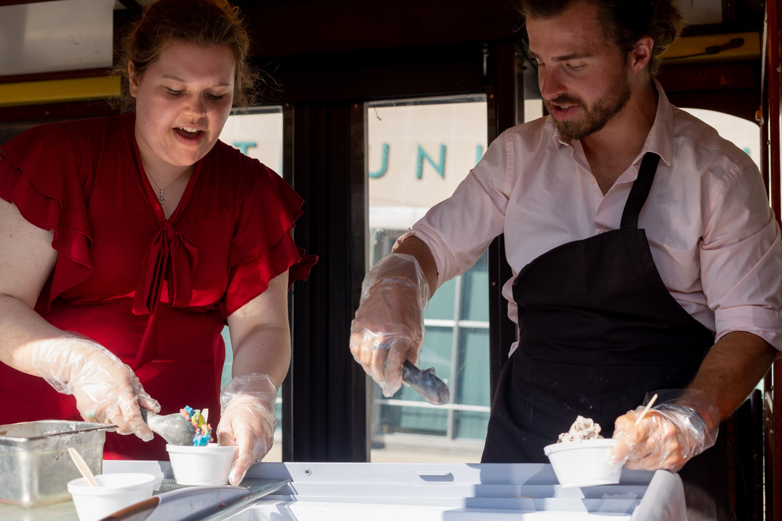Flint Trolley Ice Cream & Cafe workers scoop ice cream at the Juneteeth celebration in Brush Park in Downtown Flint, Mich. on June 19, 2021. (KT Kanazawich | Flint Beat)