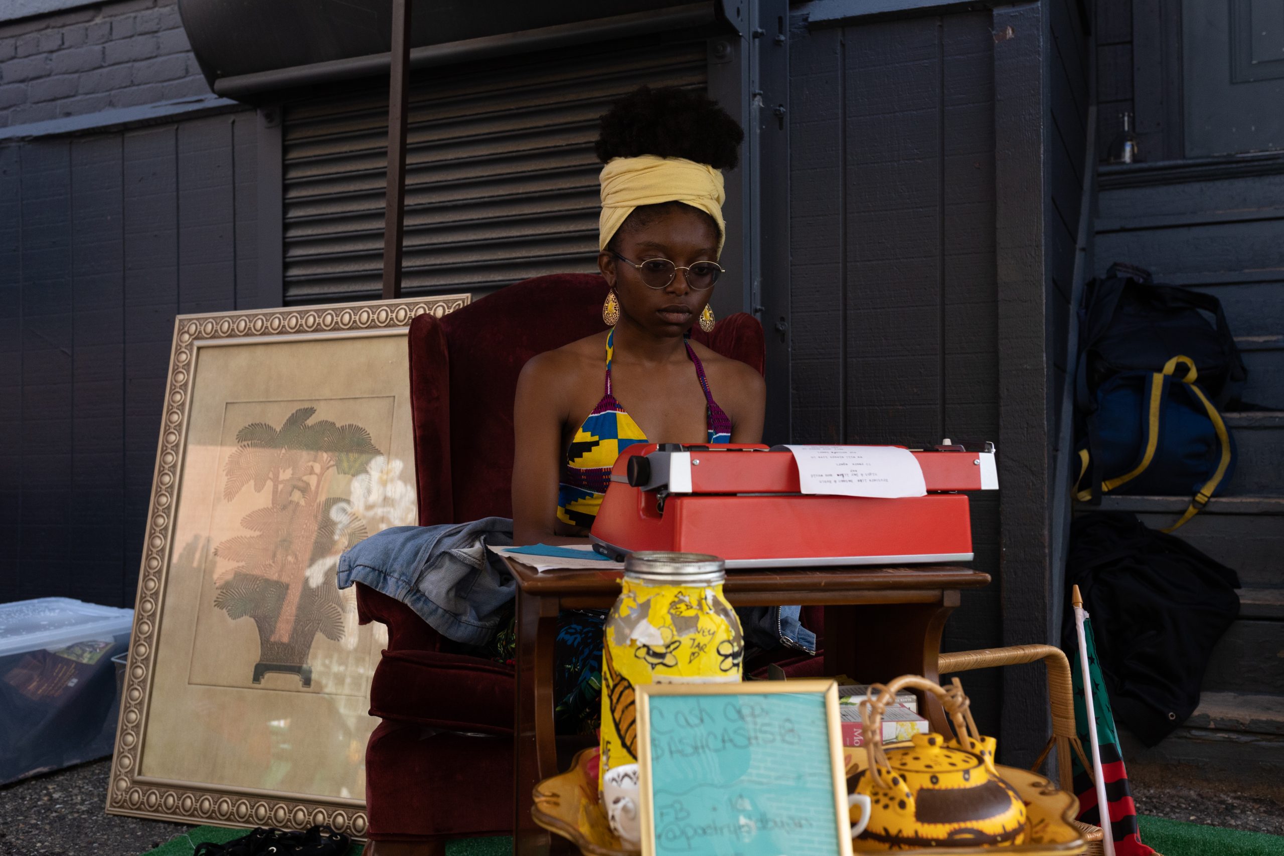 Poet Frankie Mcintosh, 22, sits at the Poet for Hire tent at the Black Buckham Juneteenth Festival in Buckham Alley in Downtown Flint on June 19, 2021. (KT Kanazawich | Flint Beat)