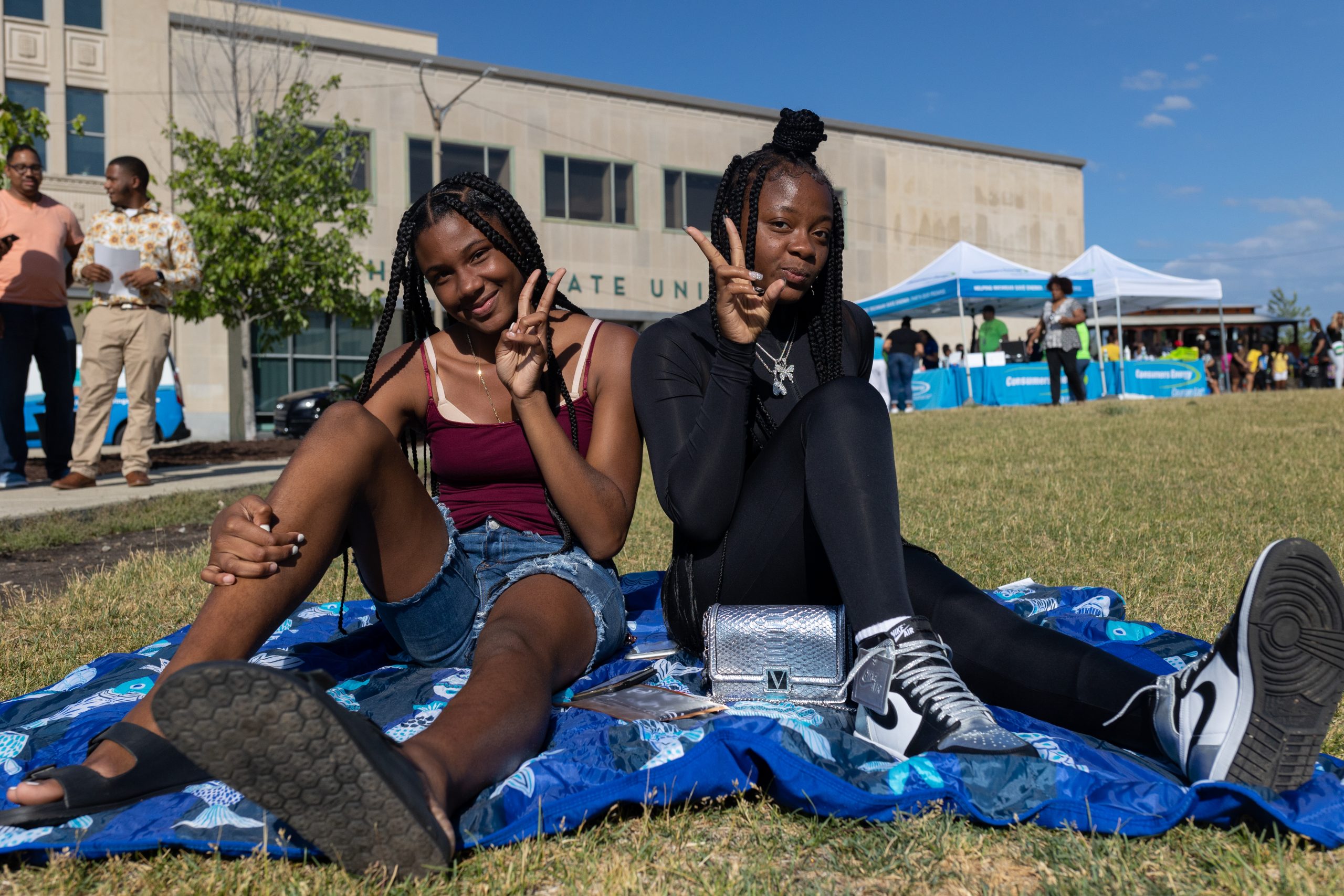 Laayla Strong, 14, and Antinyah Williams, 14, of Flint sit on a picnic blanket in Brush Park in downtown Flint for the Juneteenth Festival on June 19, 2021. (KT Kanazawich | Flint Beat)