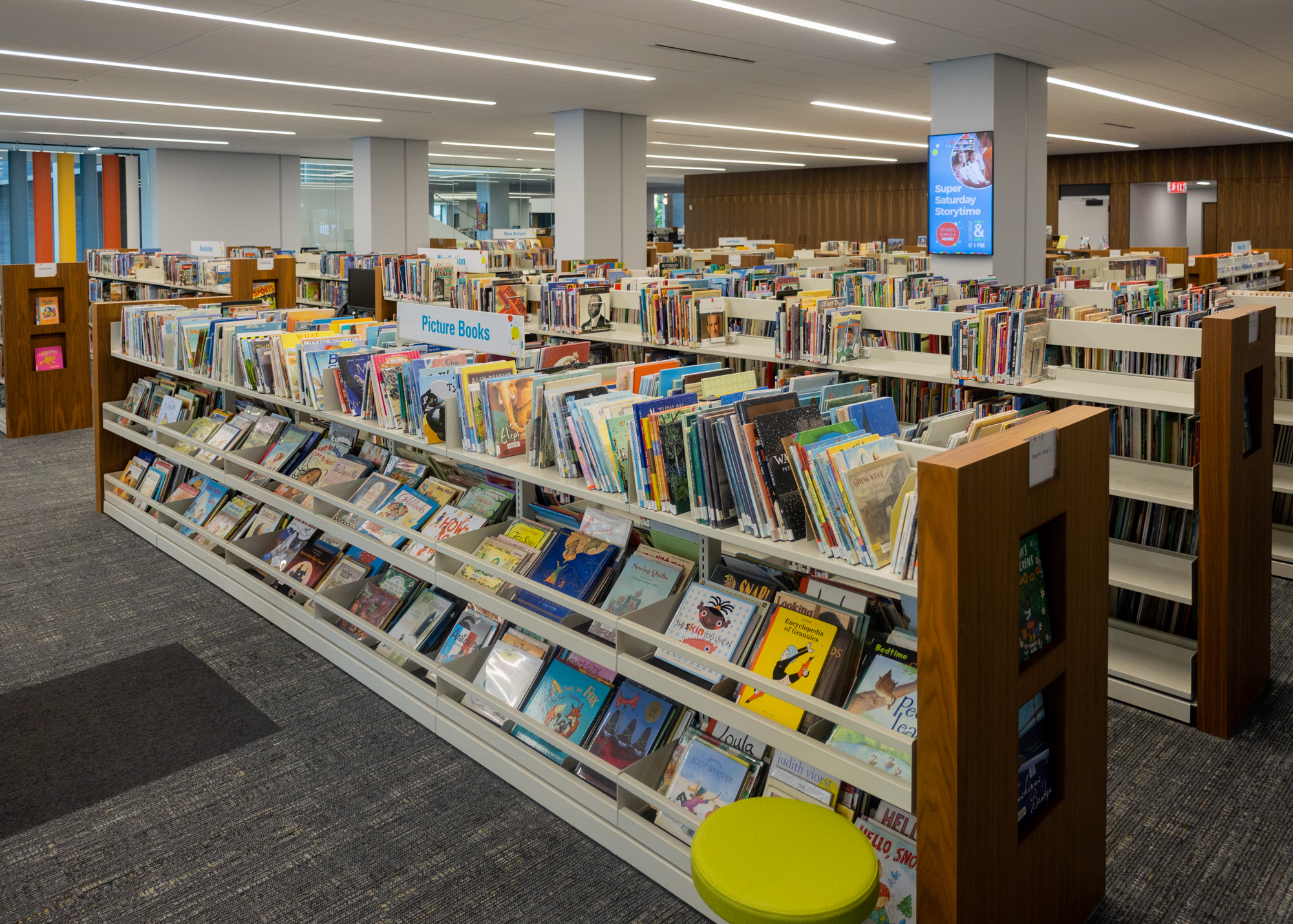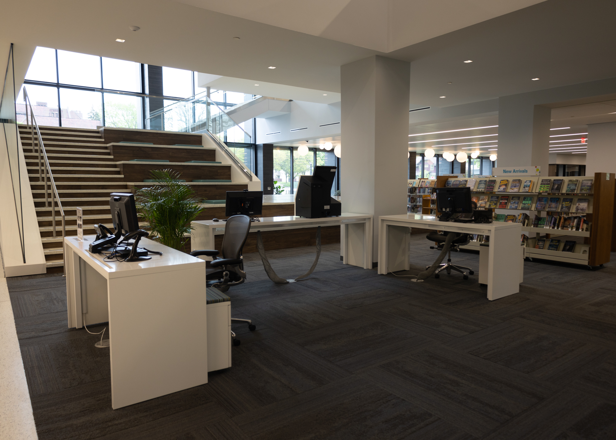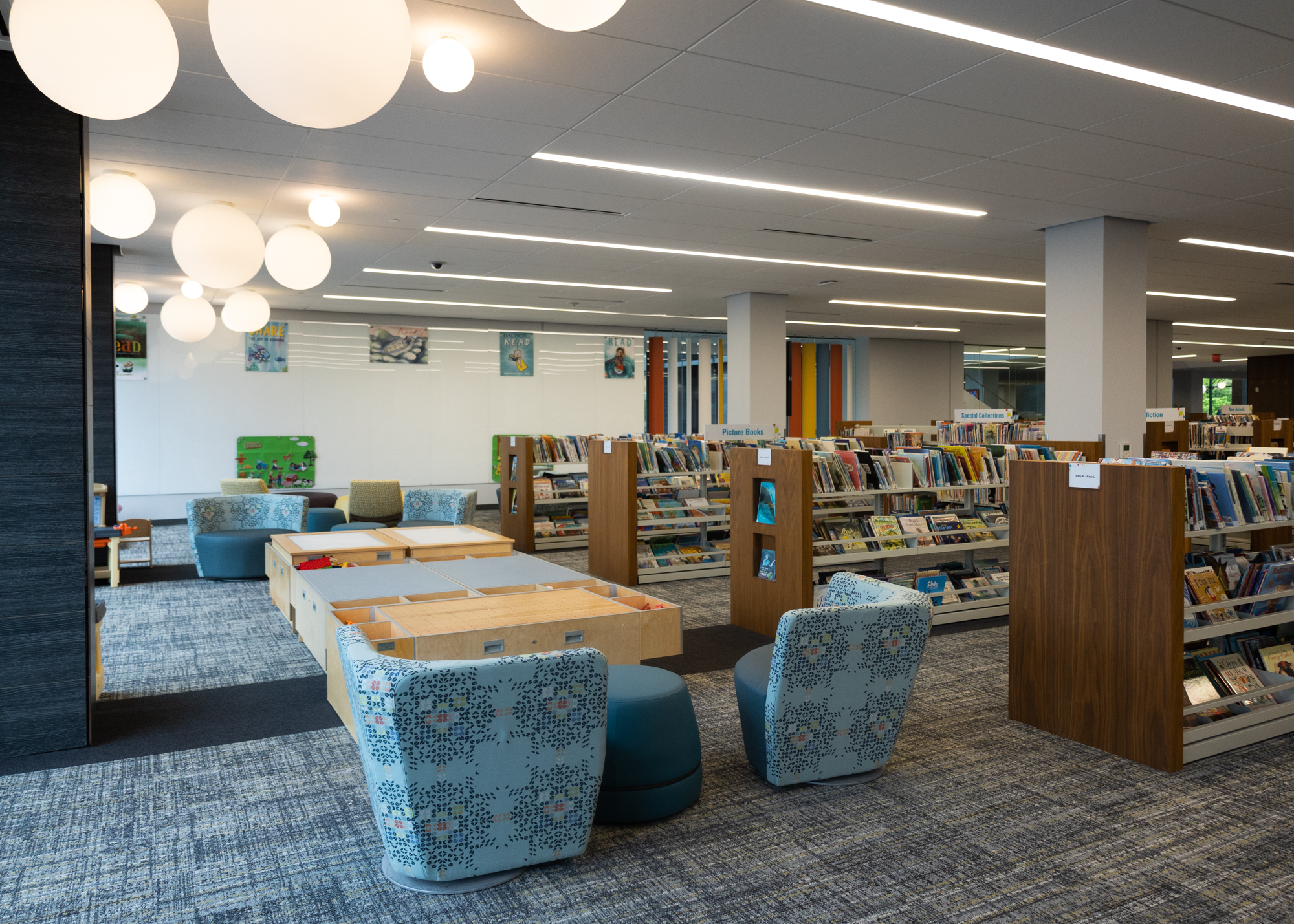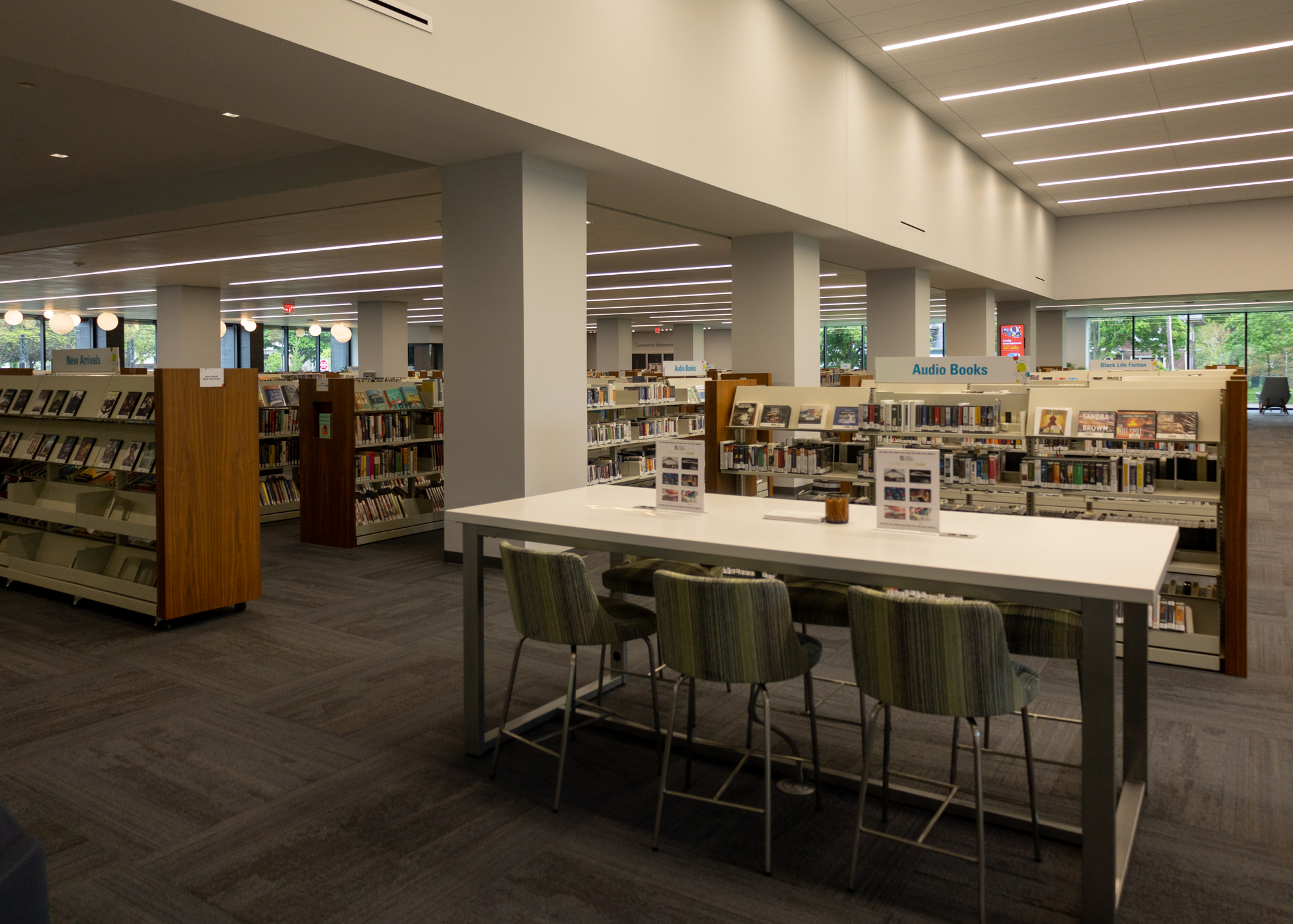 Inside, the space is equipped with plenty of comfortable seating, conference rooms, desktop computers and laptops, self-checkout stations, sensory areas for children, filtered water stations, and, of course, the library’s expansive collection of books, microfilm, DVDs, and CDs.
