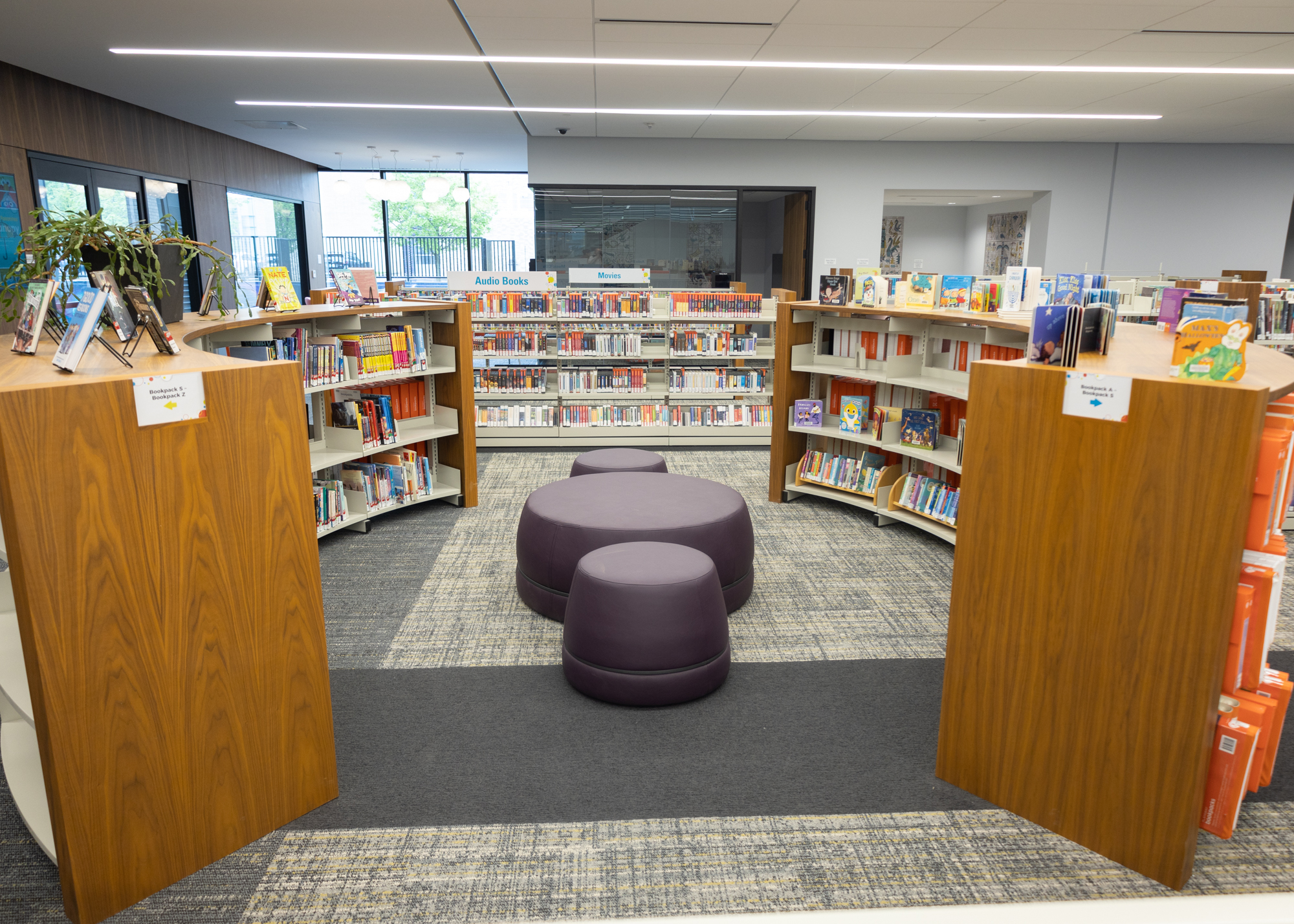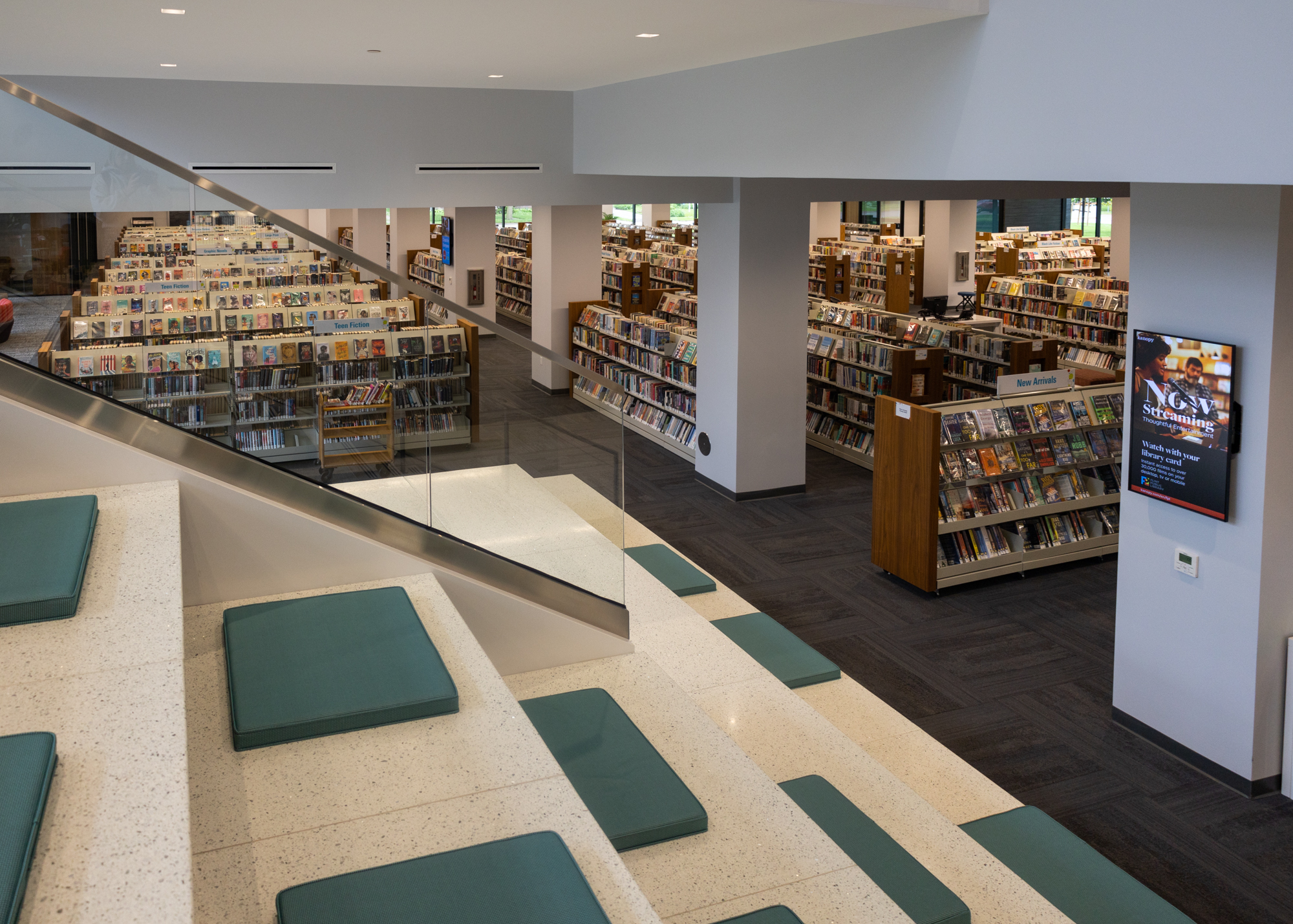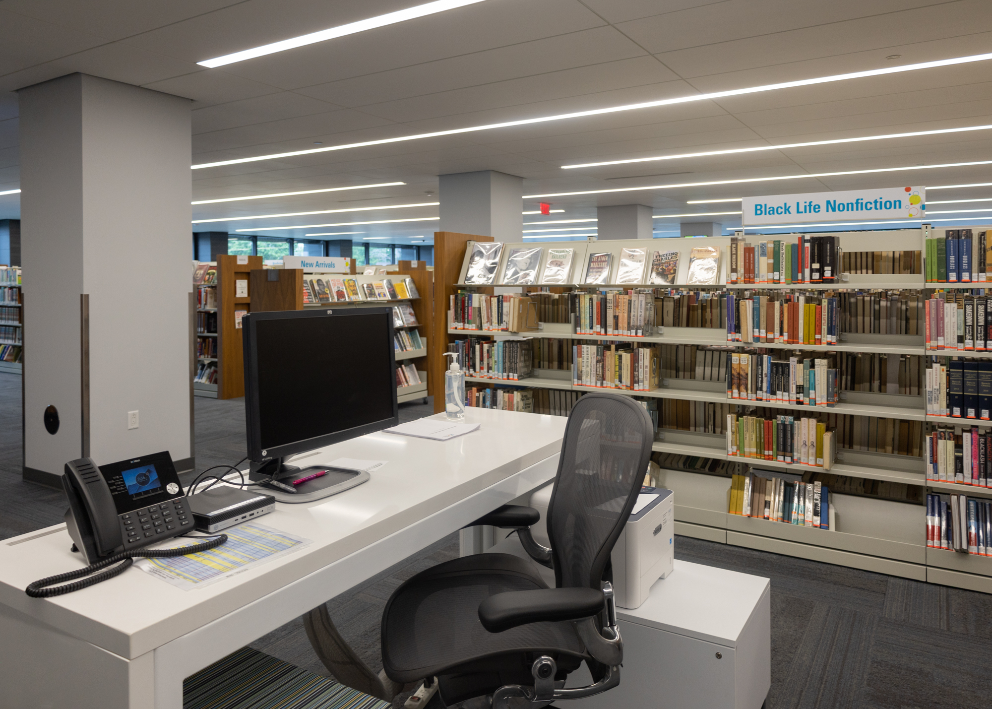Inside, the space is equipped with plenty of comfortable seating, conference rooms, desktop computers and laptops, self-checkout stations, sensory areas for children, filtered water stations, and, of course, the library’s expansive collection of books, microfilm, DVDs, and CDs.