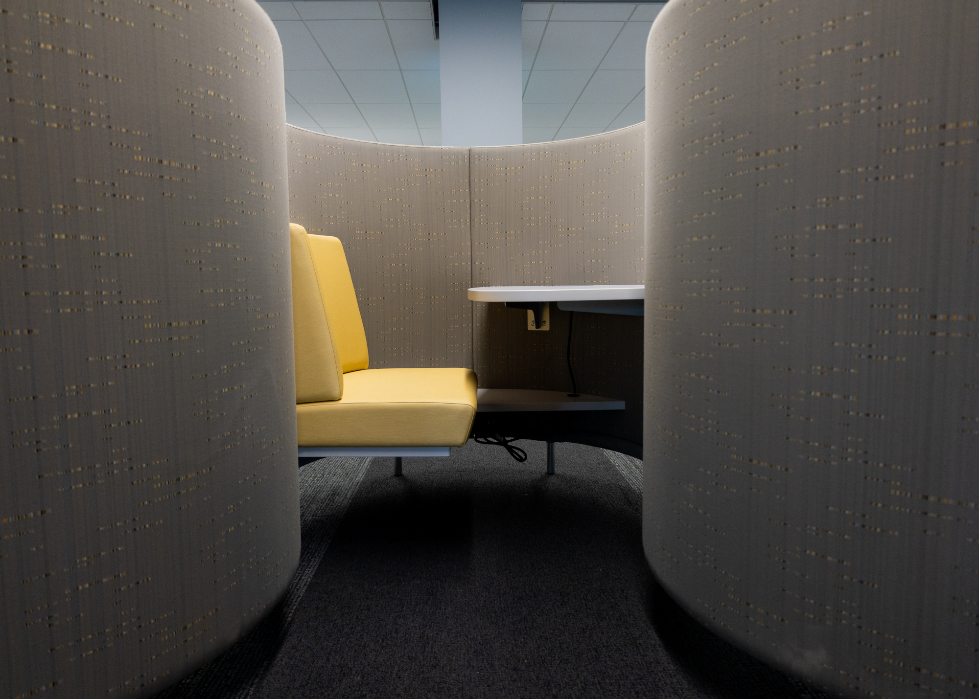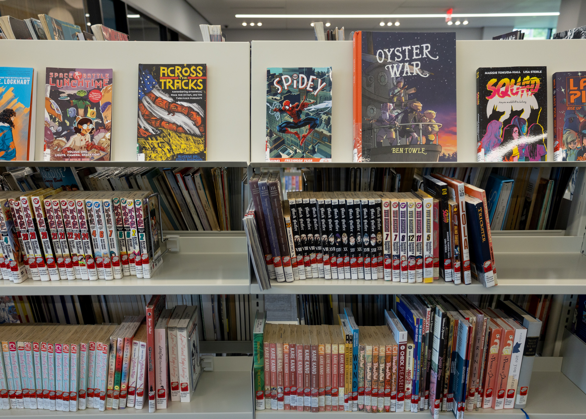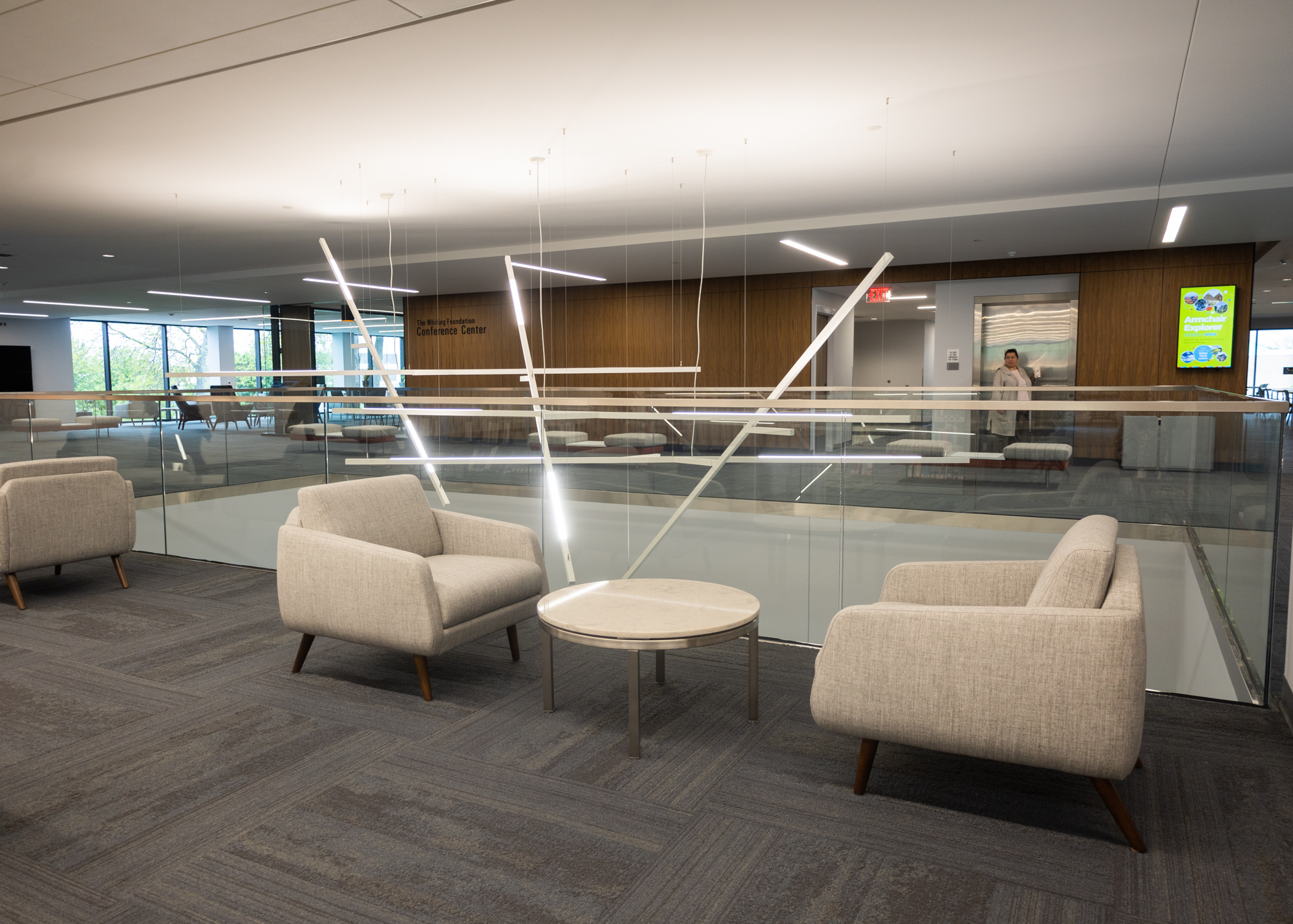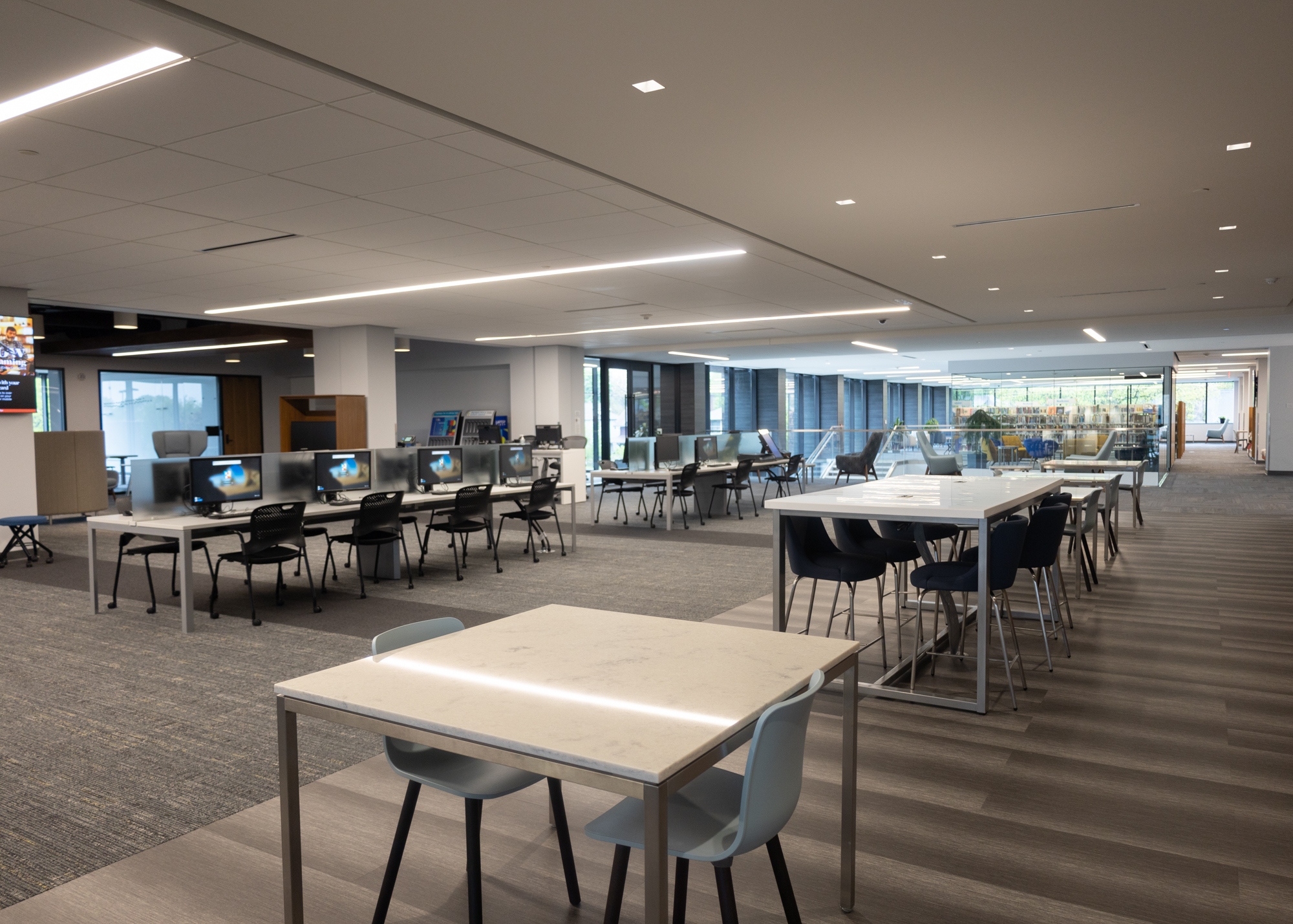 Inside, the space is equipped with plenty of comfortable seating, conference rooms, desktop computers and laptops, self-checkout stations, sensory areas for children, filtered water stations, and, of course, the library’s expansive collection of books, microfilm, DVDs, and CDs.