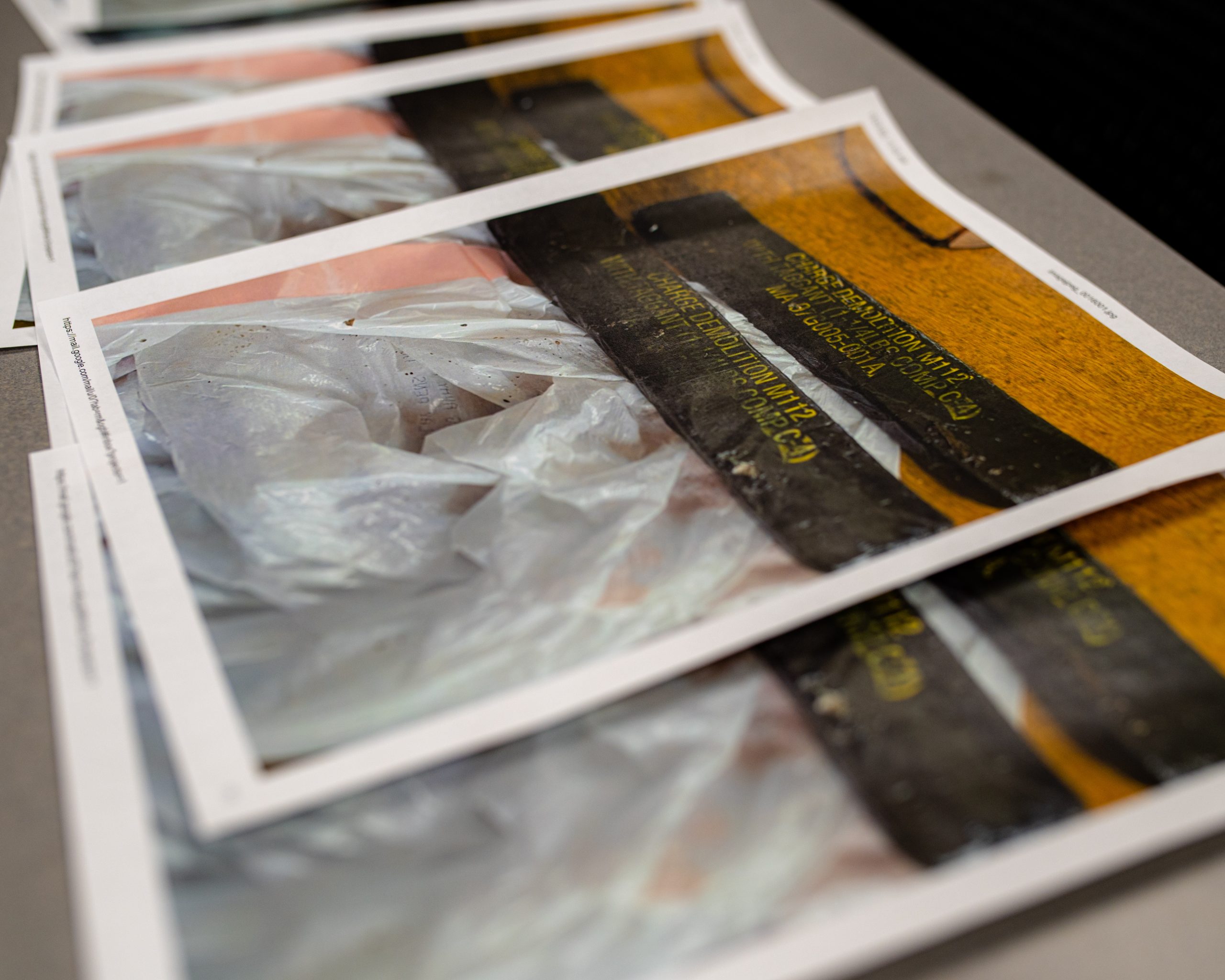 Photos of military-grade explosives found in the city of Flint, Mich., rest on a table during a press conference at the Flint Police Department Headquarters in Downtown Flint on Monday, Nov. 21, 2022. A Flint resident found the explosives in a car door part he purchased from outside the city, Green said, and called 911 to report them. (Michael Indriolo | Flint Beat)