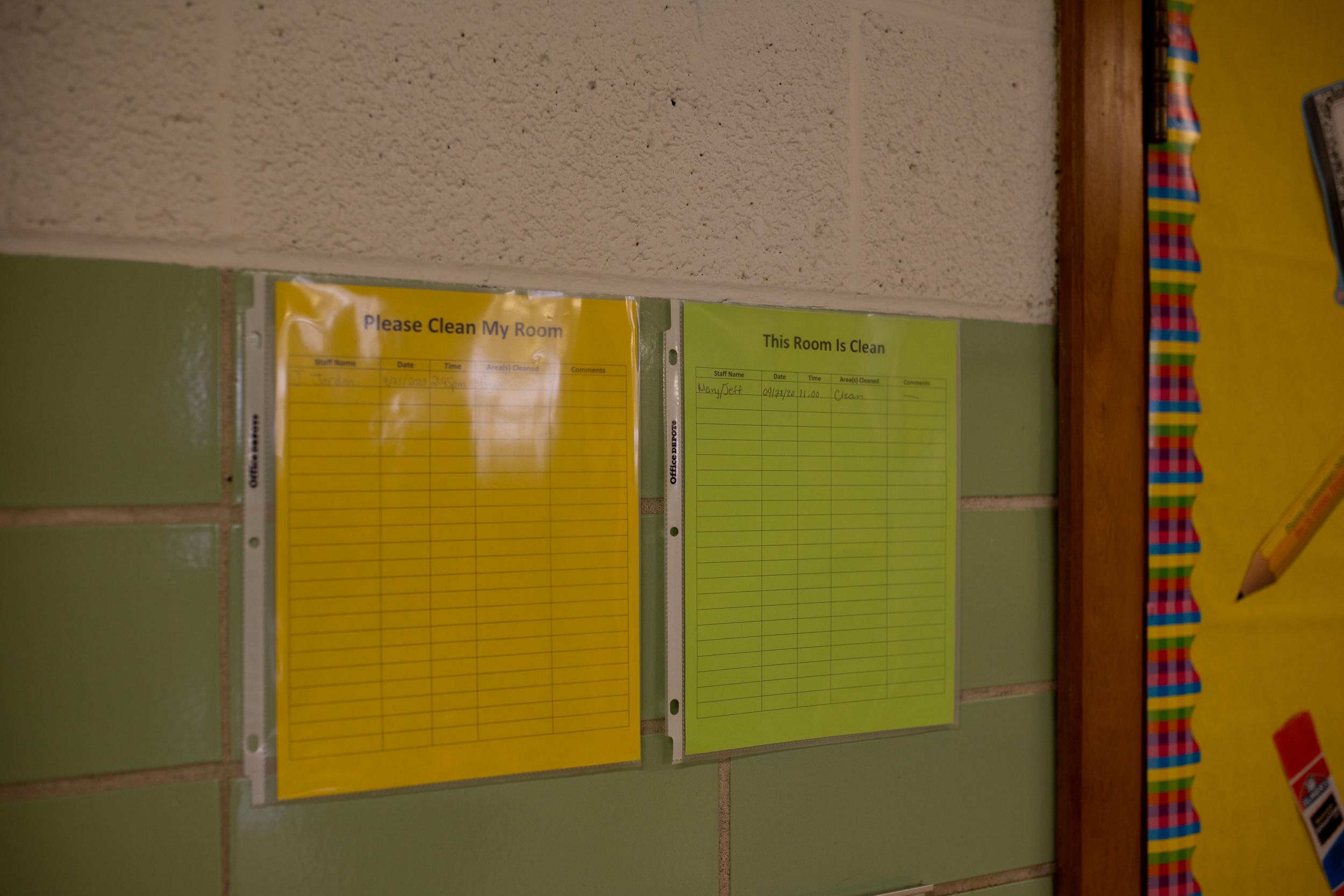 Classrooms and commonly touched surfaces are sanitized every hour. Janitorial staff must sign their name and note the time on record logs to ensure they are being cleaned frequently.