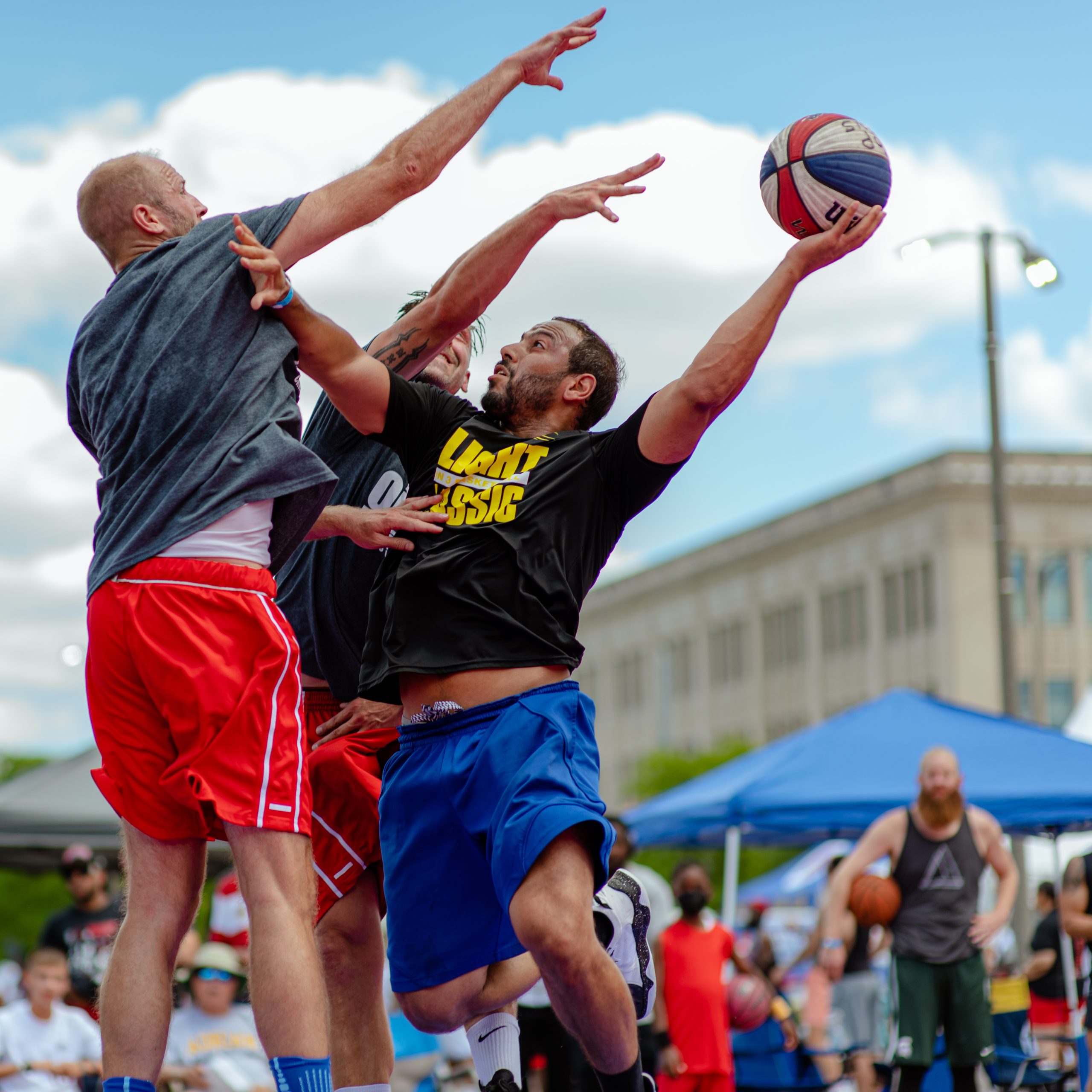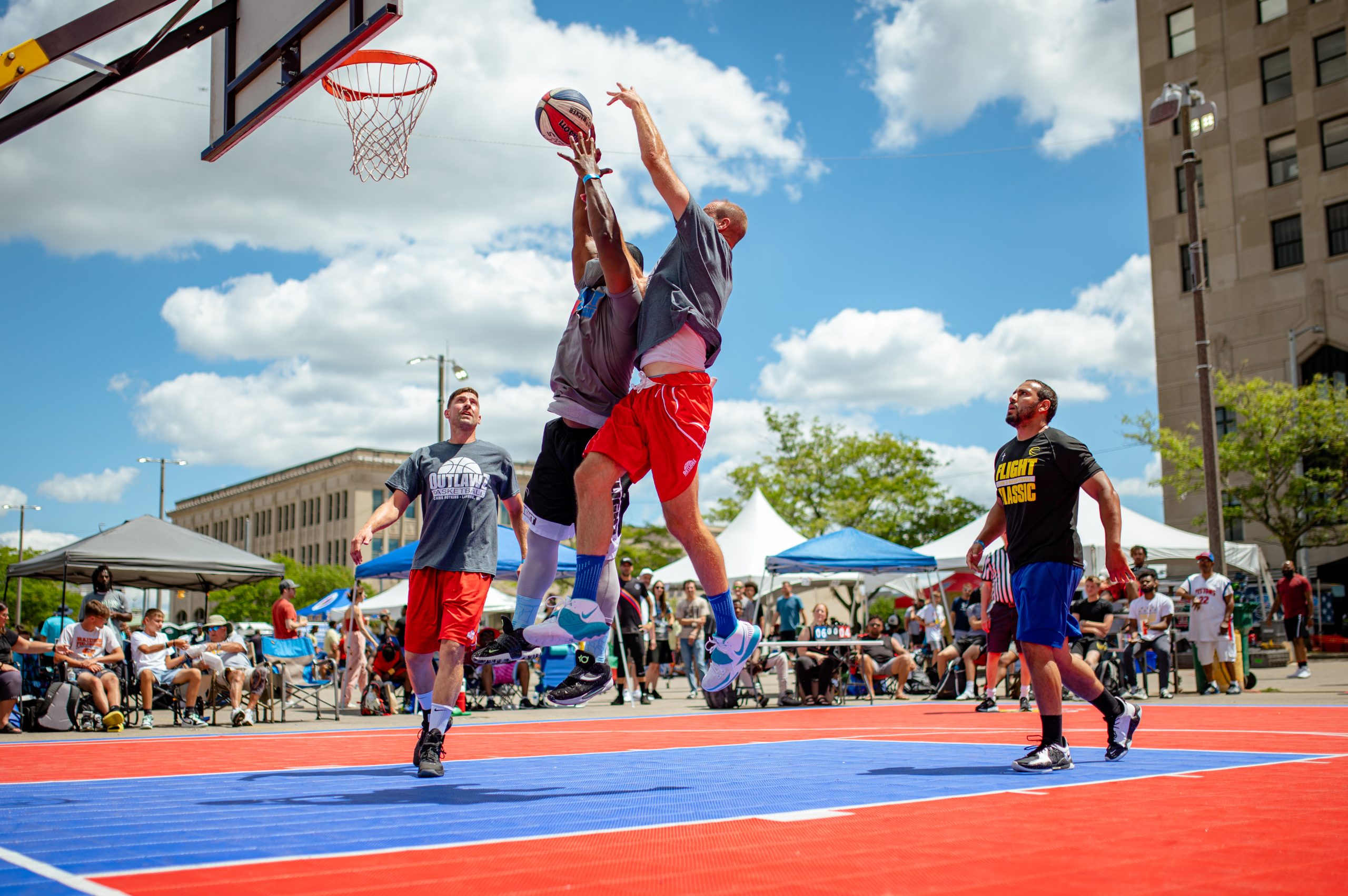 Two Toon Squad players collide while reaching for a rebound during the Gus Macker three-on-three basketball tournament in the Flat Lot in Flint, Mich., on July 30, 2022. (Michael Indriolo | Flint Beat)