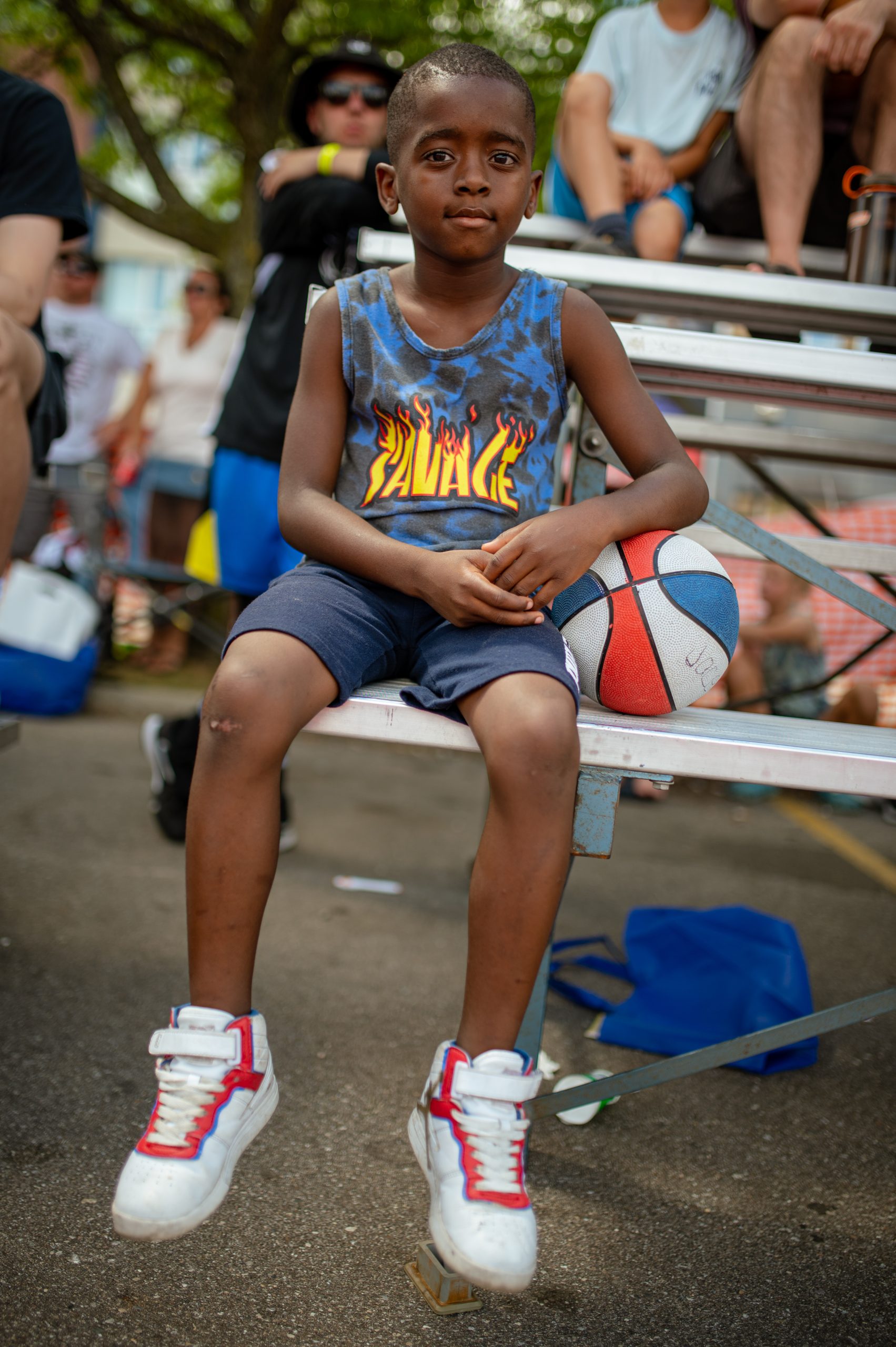 Jacione Whitehead poses for a portrait while watching the Outlawz versus Flight Classic game during the Gus Macker three-on-three basketball tournament in the Flat Lot in Flint, Mich., on July 30, 2022. (Michael Indriolo | Flint Beat)