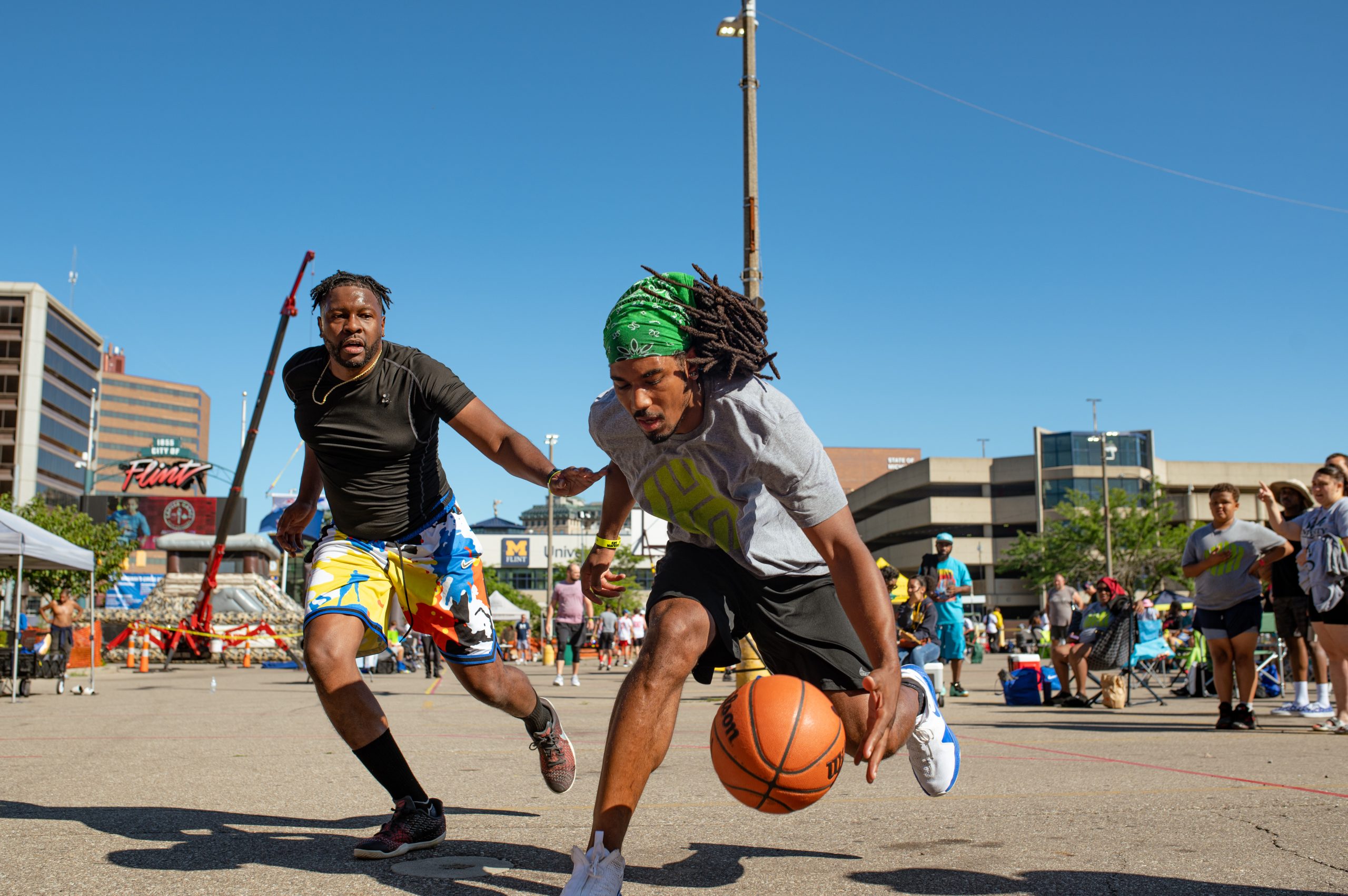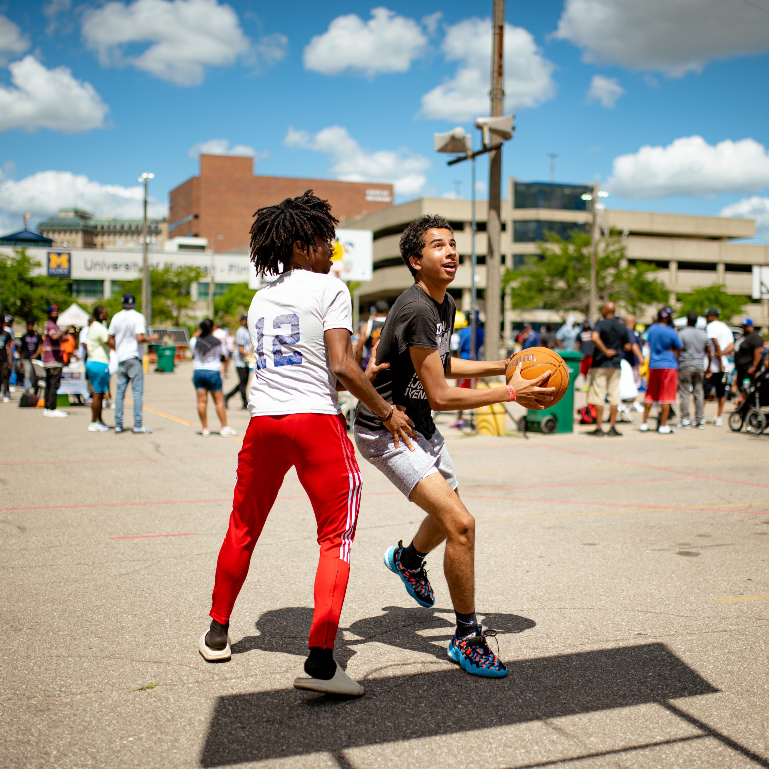 Armoni Portis and Tyvon Boston pose for a portrait during the Gus Macker three-on-three basketball tournament in the Flat Lot in Flint, Mich., on July 30, 2022. (Michael Indriolo | Flint Beat)Malachi Pearson finds an opening in Kaleb Thompson’s defense while they shoot around during the Gus Macker three-on-three basketball tournament in the Flat Lot in Flint, Mich., on July 30, 2022. (Michael Indriolo | Flint Beat)