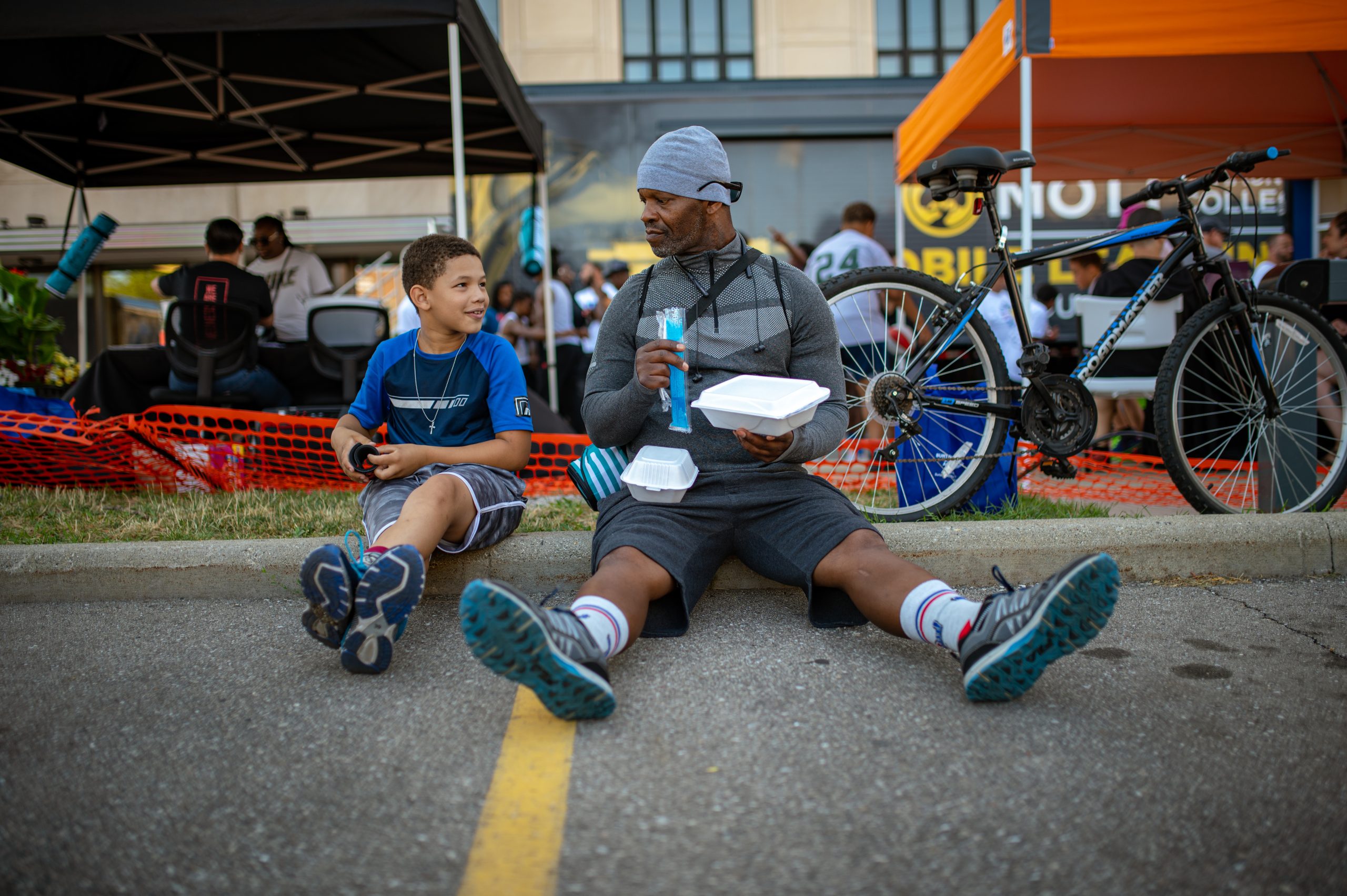 A player on Huntington Bank’s team lunges for the ball in a game his team played against Chase Bank’s team during the Gus Macker three-on-three basketball tournament in the Flat Lot in Flint, Mich., on July 30, 2022. (Michael Indriolo | Flint Beat)Marcus Davis and Mason Davis sit down in the shade for lunch during the Gus Macker three-on-three basketball tournament in the Flat Lot in Flint, Mich., on July 30, 2022. (Michael Indriolo | Flint Beat)