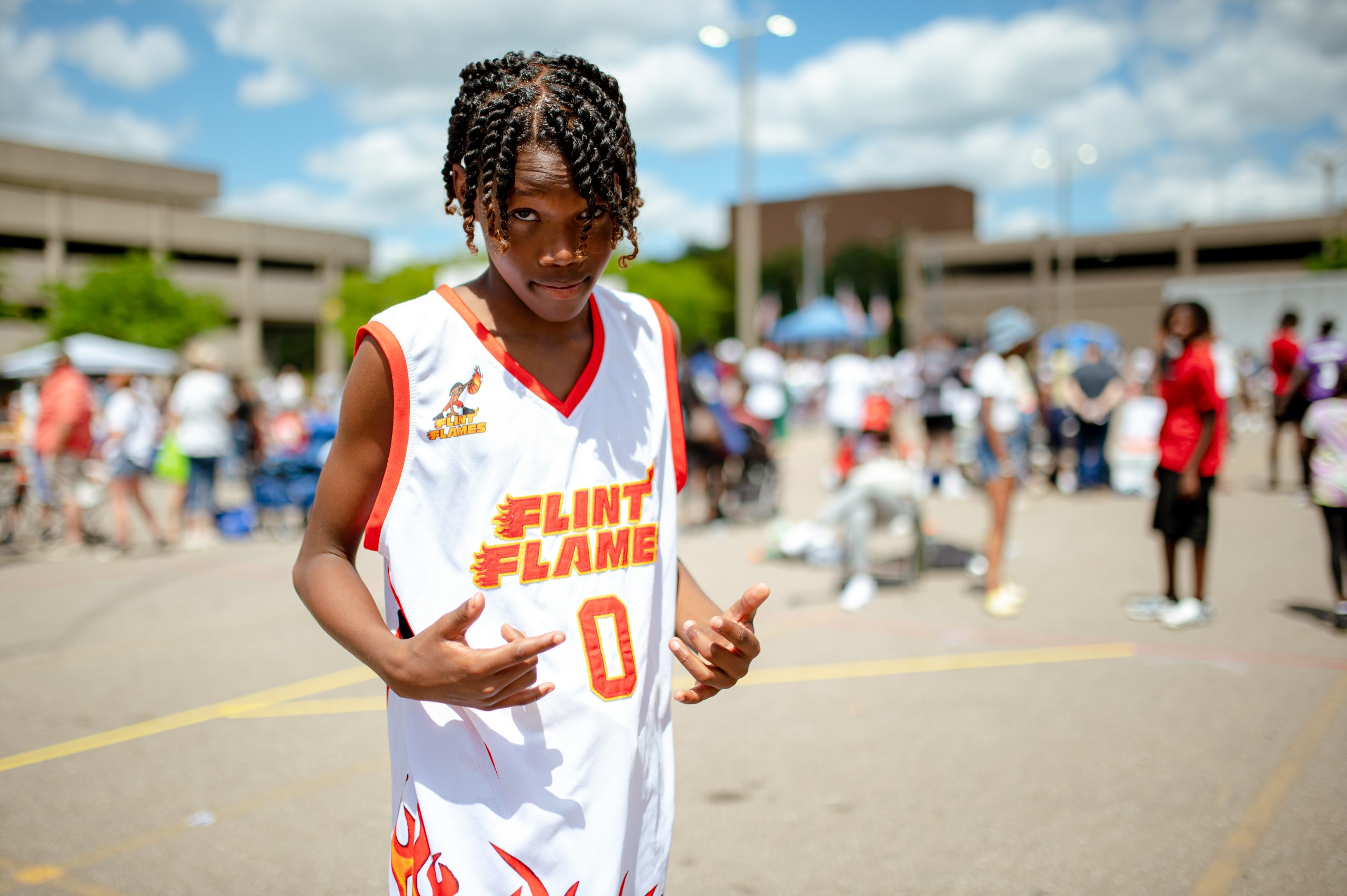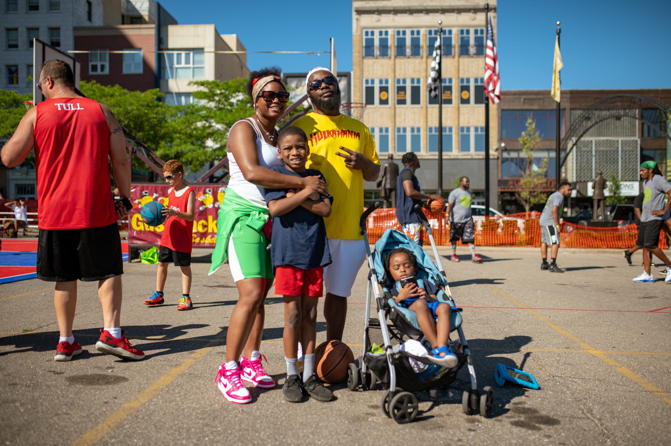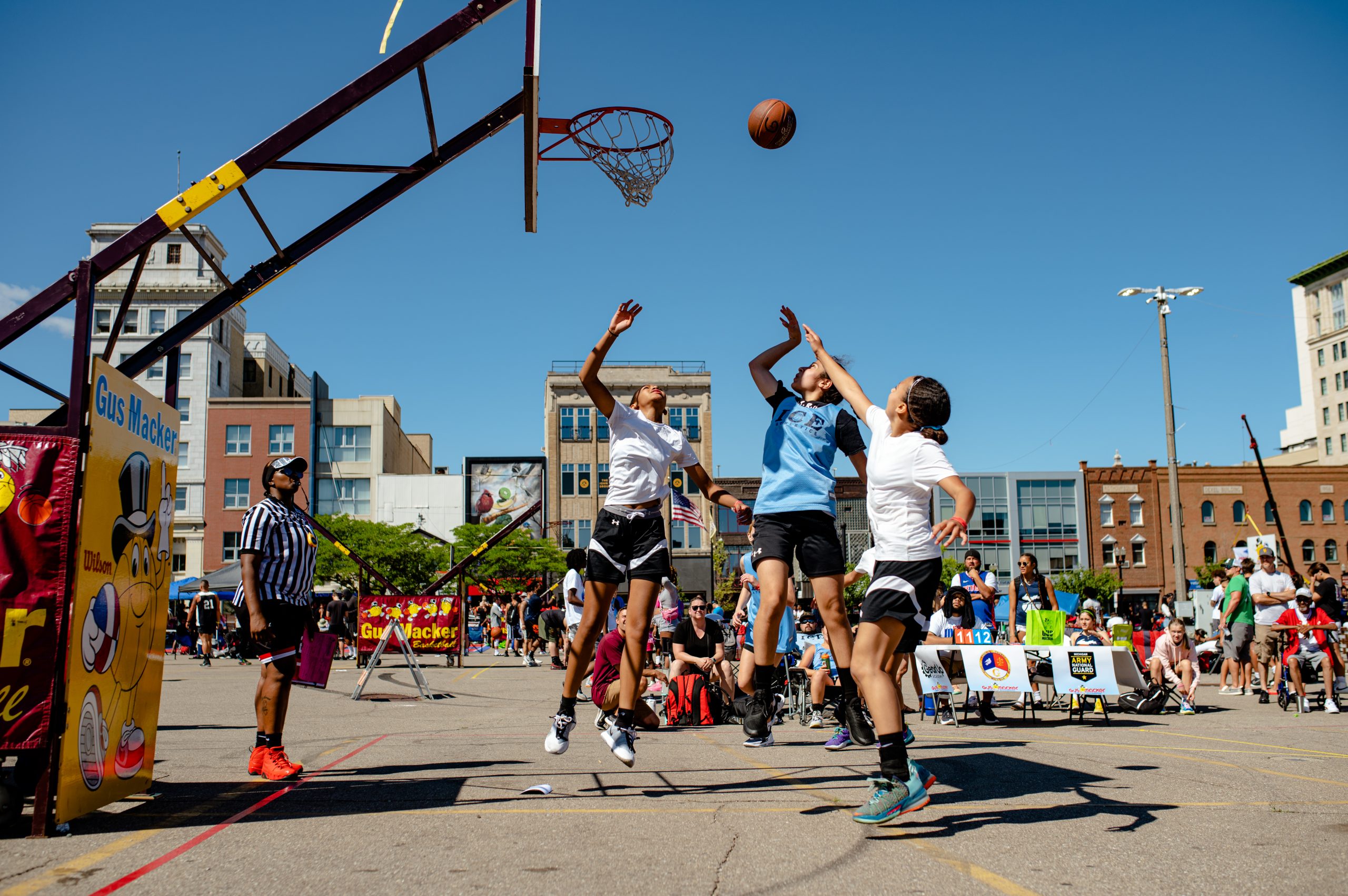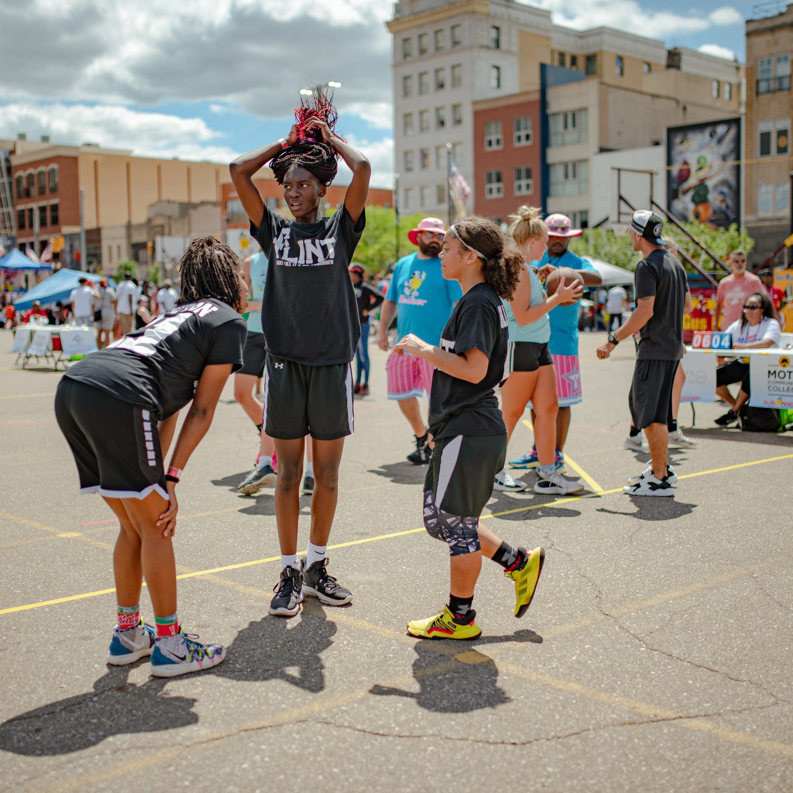 Borris Porras of the Operating Engineers 324 union poses for a portrait during the Gus Macker three-on-three basketball tournament in the Flat Lot in Flint, Mich., on July 30, 2022. (Michael Indriolo | Flint Beat)Quay Humphries, James Williams, Dwight Williams, Makhi McCombs and Nate Brown pose for a portrait during the Gus Macker three-on-three basketball tournament in the Flat Lot in Flint, Mich., on July 30, 2022. (Michael Indriolo | Flint Beat)Flint Northern High School basketball star Taleesha Hardy takes a shot in the three-point contest during the Gus Macker three-on-three basketball tournament in the Flat Lot in Flint, Mich., on July 30, 2022. Hardy won the contest, making four out of five shots. (Michael Indriolo | Flint Beat)