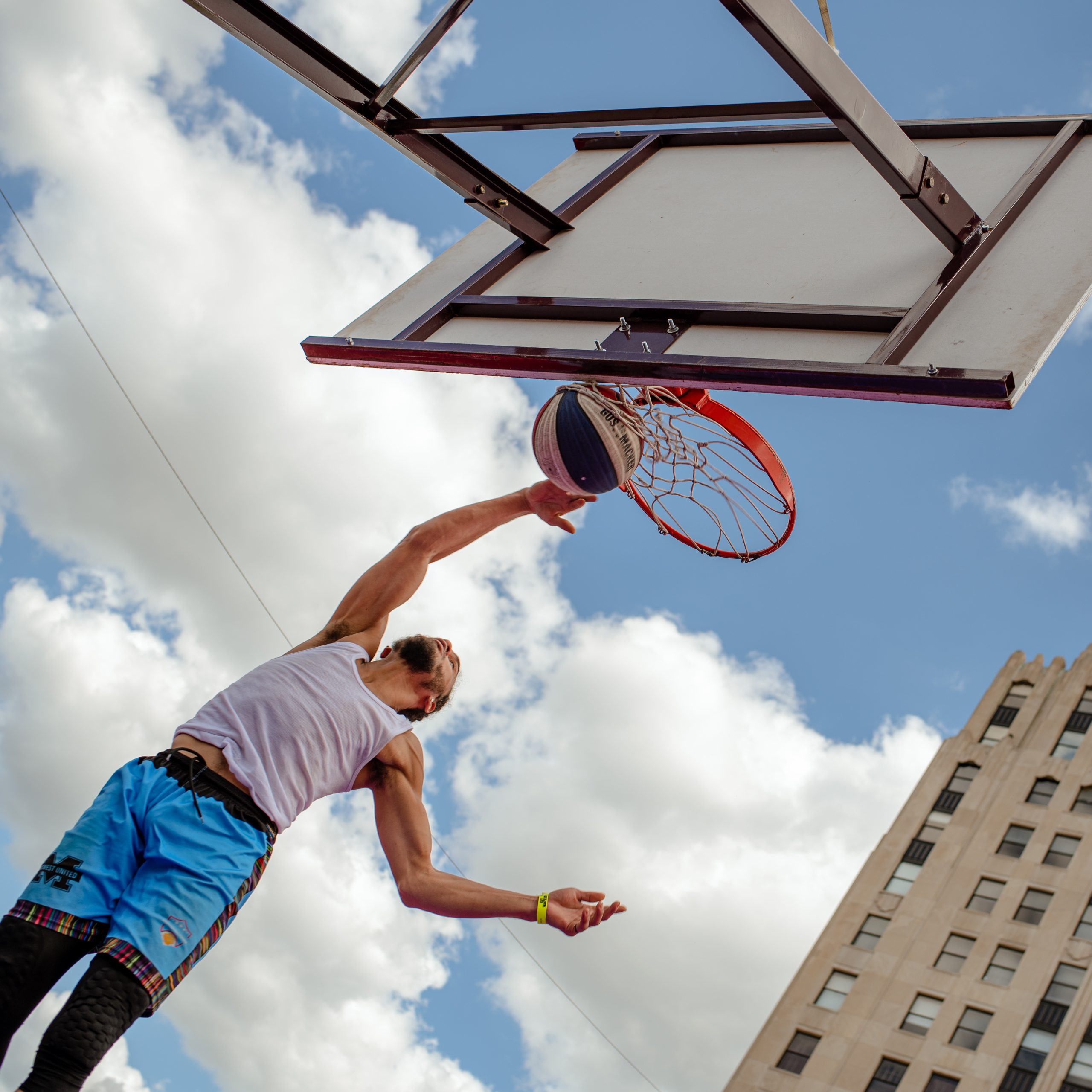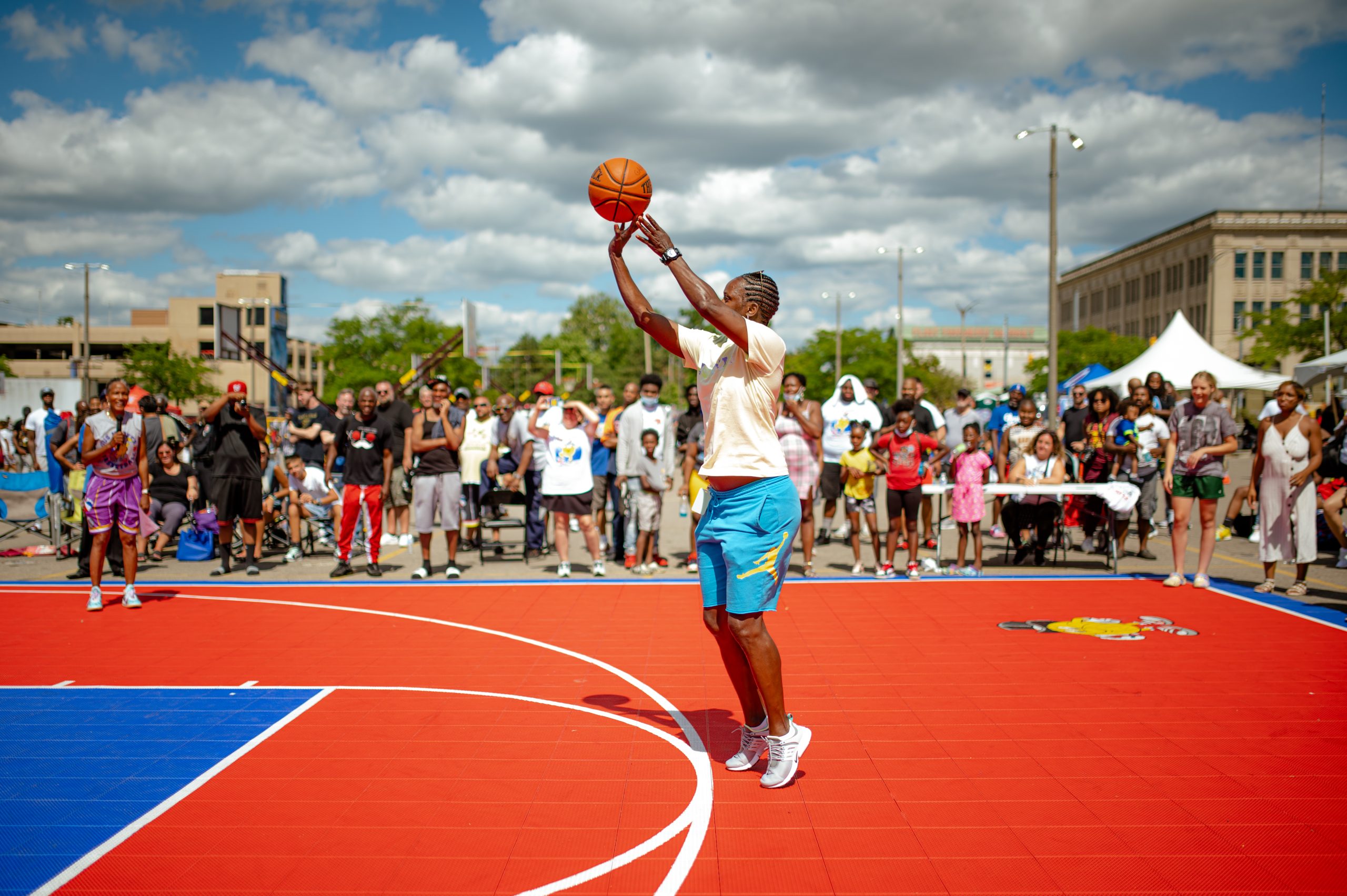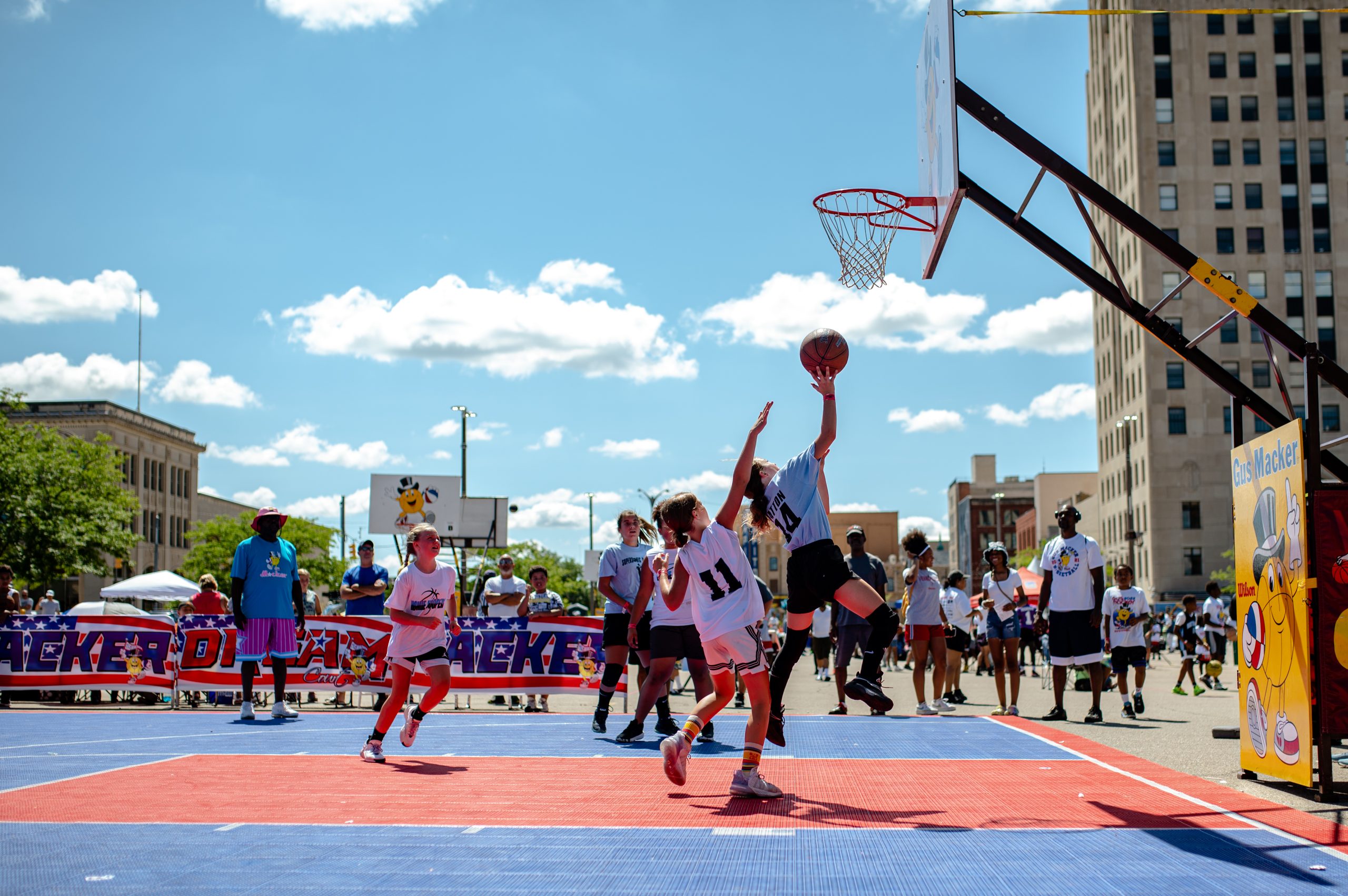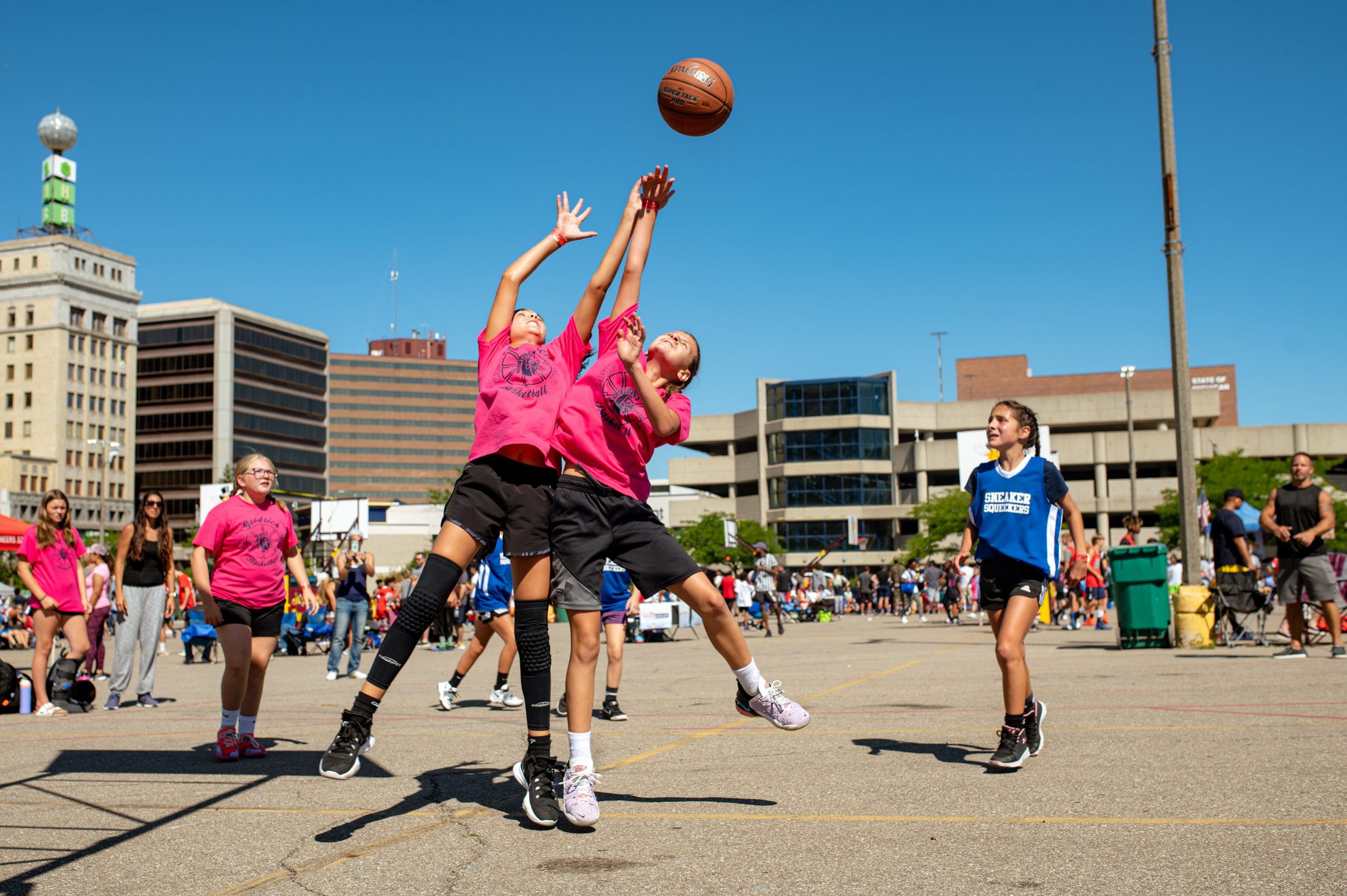 Borris Porras of the Operating Engineers 324 union poses for a portrait during the Gus Macker three-on-three basketball tournament in the Flat Lot in Flint, Mich., on July 30, 2022. (Michael Indriolo | Flint Beat)Quay Humphries, James Williams, Dwight Williams, Makhi McCombs and Nate Brown pose for a portrait during the Gus Macker three-on-three basketball tournament in the Flat Lot in Flint, Mich., on July 30, 2022. (Michael Indriolo | Flint Beat)Flint Northern High School basketball star Taleesha Hardy takes a shot in the three-point contest during the Gus Macker three-on-three basketball tournament in the Flat Lot in Flint, Mich., on July 30, 2022. Hardy won the contest, making four out of five shots. (Michael Indriolo | Flint Beat)