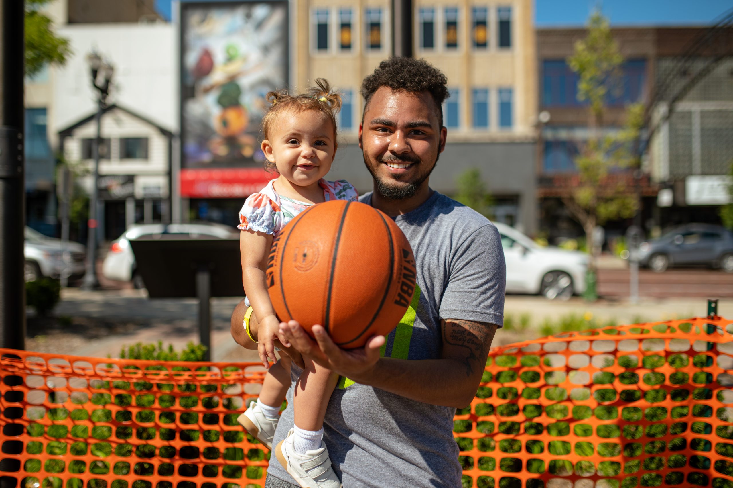 Dametreous Walton, who played for Huntington Bank’s team, poses for a portrait with Arielle Walton during the Gus Macker three-on-three basketball tournament in the Flat Lot in Flint, Mich., on July 30, 2022. (Michael Indriolo | Flint Beat)