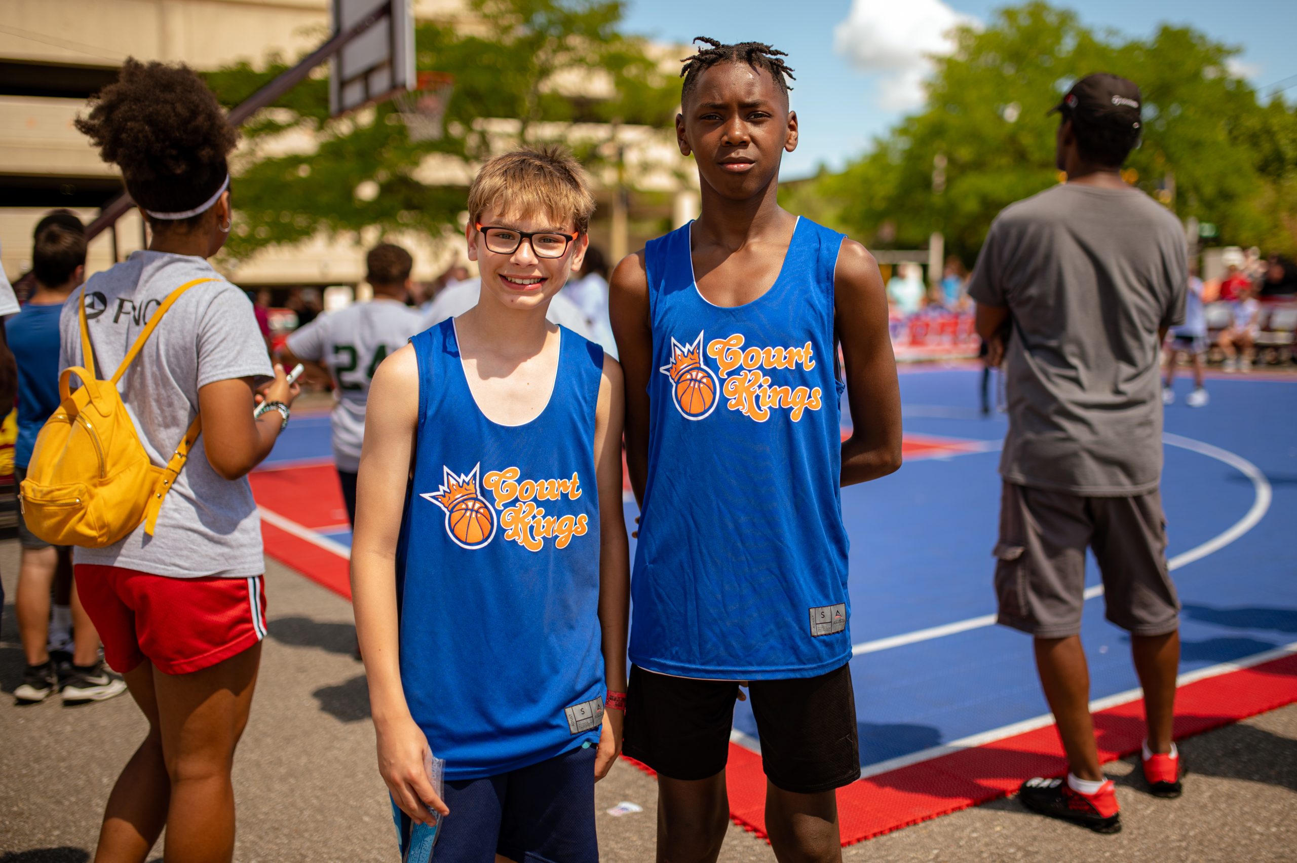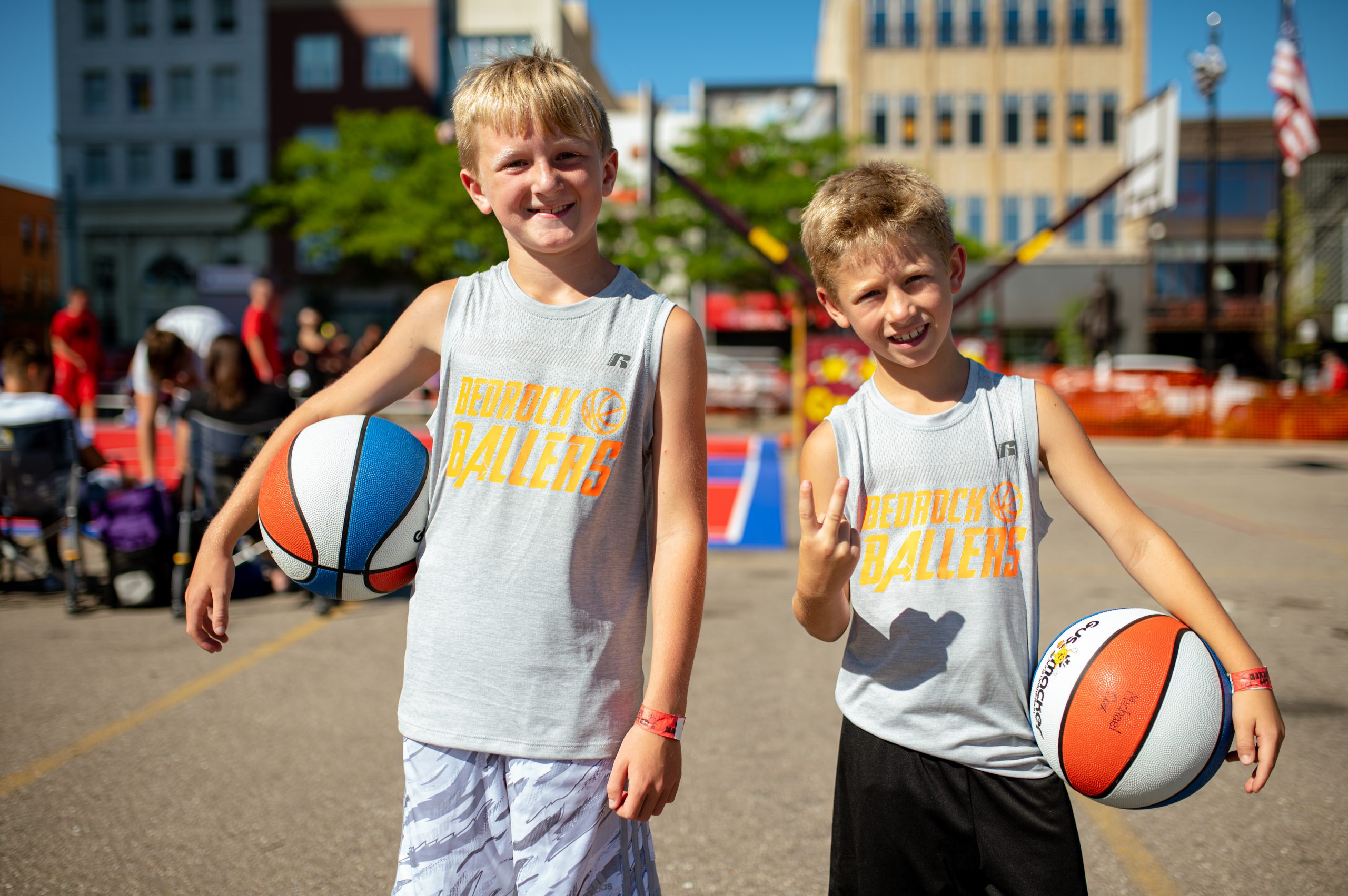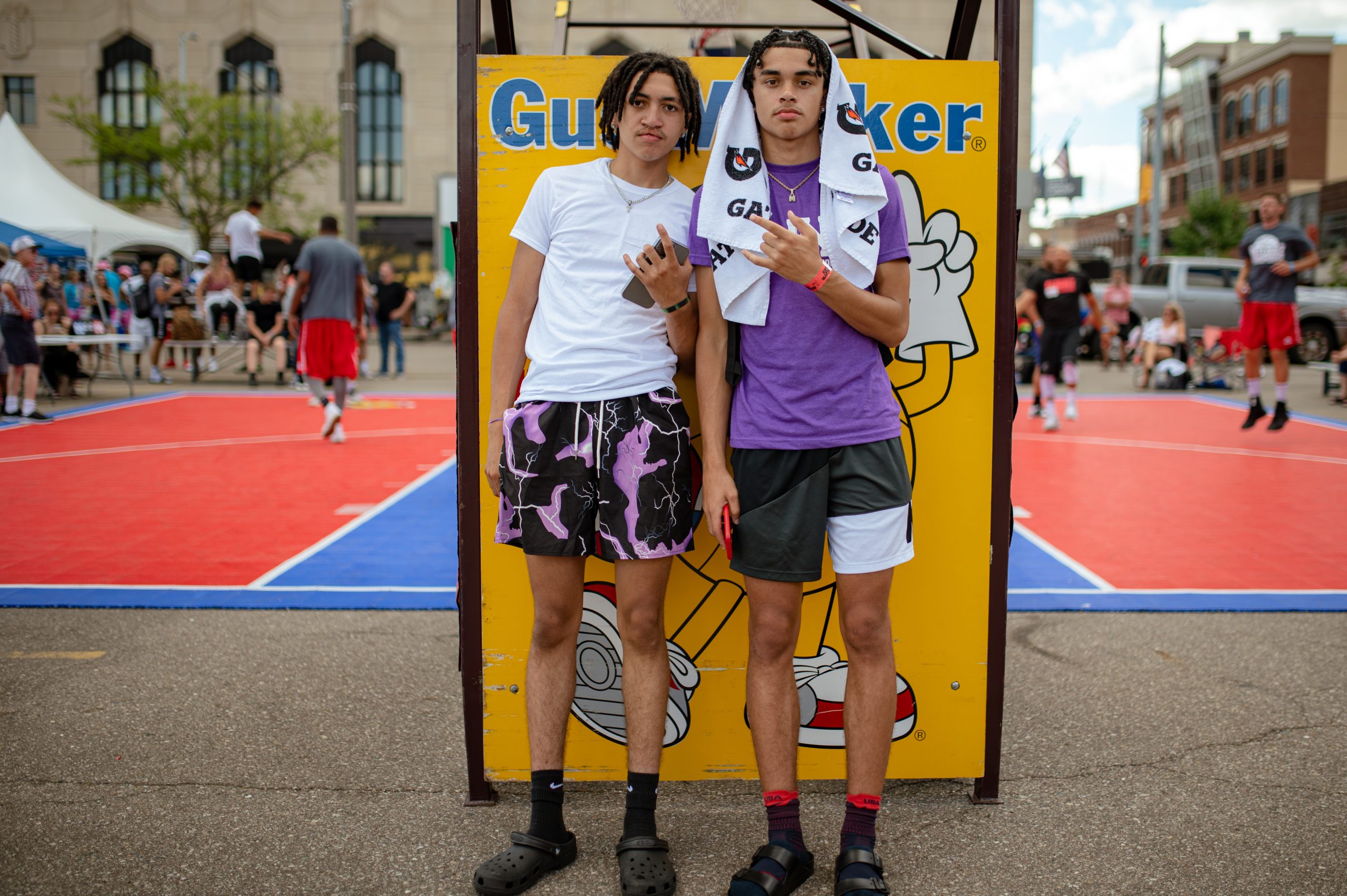 Hudson Koppela and Michael Cox pose for a portrait during the Gus Macker three-on-three basketball tournament in the Flat Lot in Flint, Mich., on July 30, 2022. (Michael Indriolo | Flint Beat)