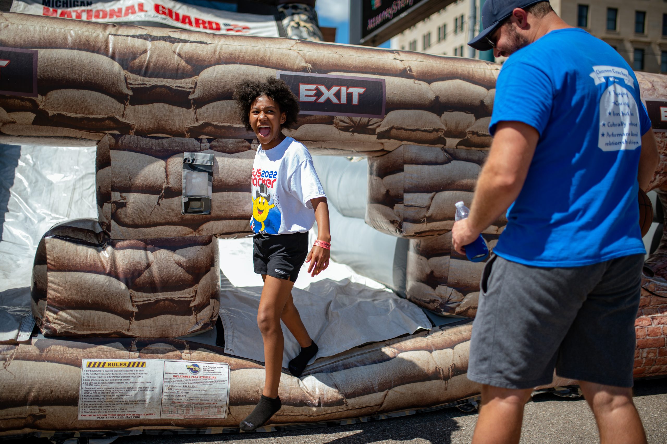 Jada Jones reacts as her coach tells her the time it took her to get through an inflatable put up by the U.S. Army National Guard during the Gus Macker three-on-three basketball tournament in the Flat Lot in Flint, Mich., on July 30, 2022. (Michael Indriolo | Flint Beat)