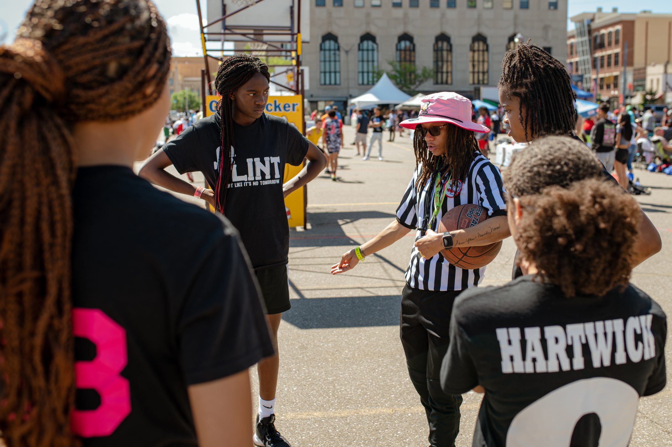 A player on 2030 Downriver Ice shoots the ball during the Gus Macker three-on-three basketball tournament in the Flat Lot in Flint, Mich., on July 30, 2022. (Michael Indriolo | Flint Beat)A referee reviews the rules with players from Flint Fight Like It’s No Tomorrow and Evolution ahead of their game during the Gus Macker three-on-three basketball tournament in the Flat Lot in Flint, Mich., on July 30, 2022. (Michael Indriolo | Flint Beat)