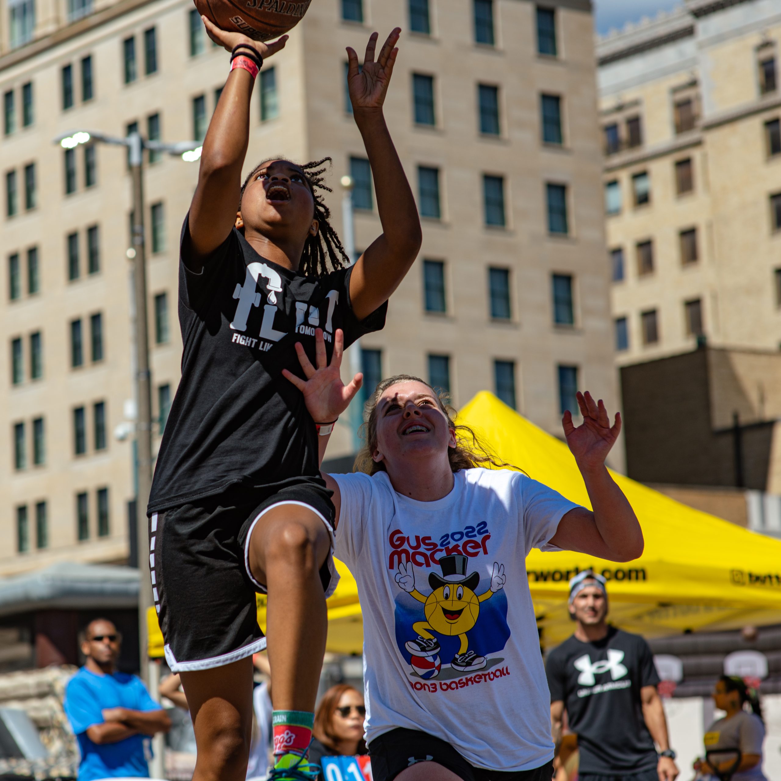 Flint Fight Like It’s No Tomorrow player Makena Newton, defended by a player from Evolution, attempts a layup during the Gus Macker three-on-three basketball tournament in the Flat Lot in Flint, Mich., on July 30, 2022. (Michael Indriolo | Flint Beat)