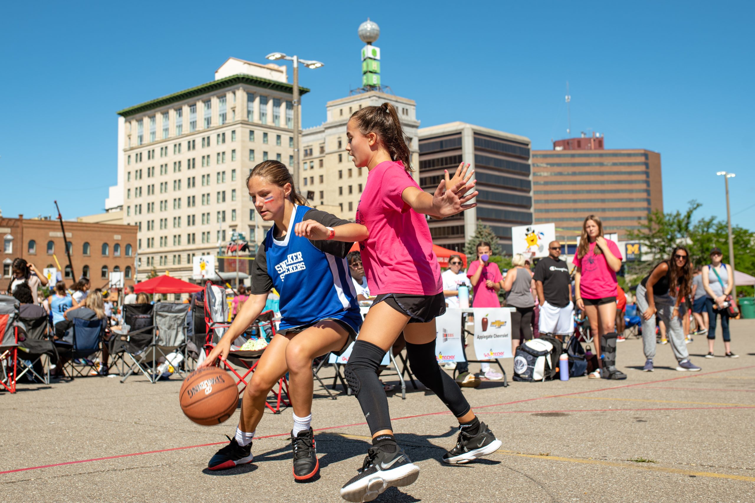 A player on the Sneaker Squeakers, defended by a player on Toon Squad, makes her way toward the basket during the Gus Macker three-on-three basketball tournament in the Flat Lot in Flint, Mich., on July 30, 2022. (Michael Indriolo | Flint Beat)