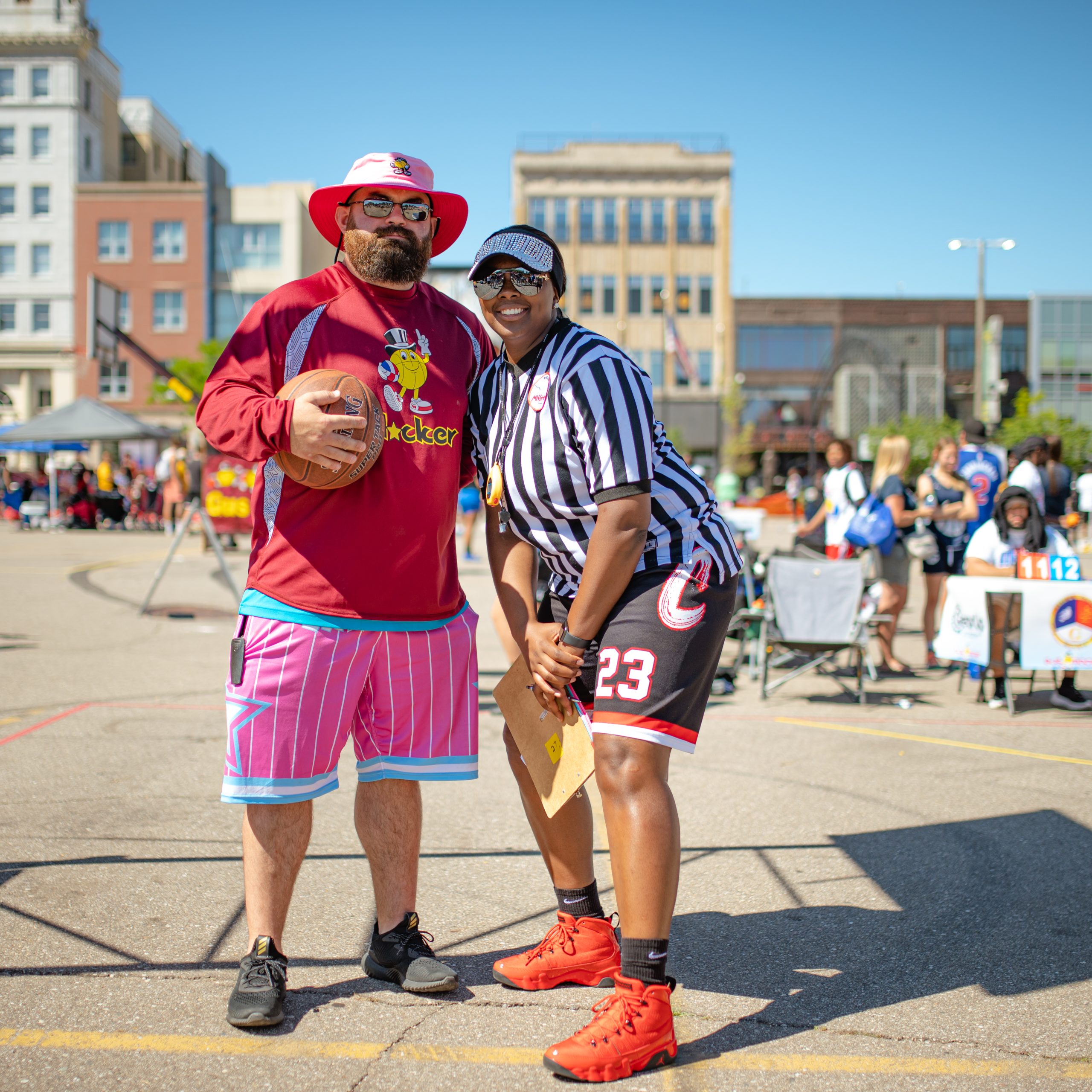 Referees Shane Taylor and Precious Pringle pose for a portrait during the Gus Macker three on three basketball tournament in the Flat Lot in Flint, Mich. on July 30, 2022. (Michael Indriolo | Flint Beat)Troy McBride, who worked at the registration table for Team Macker, speaks to a tournament attendee during the Gus Macker three on three basketball tournament in the Flat Lot in Flint, Mich. on July 30, 2022. (Michael Indriolo | Flint Beat)