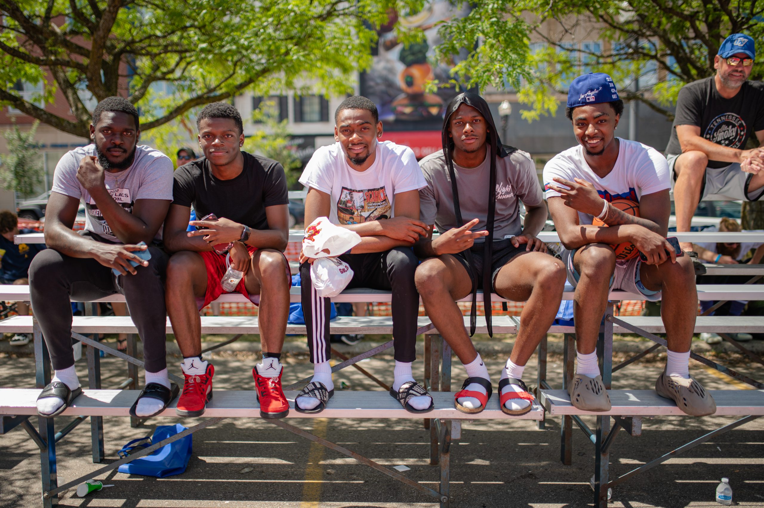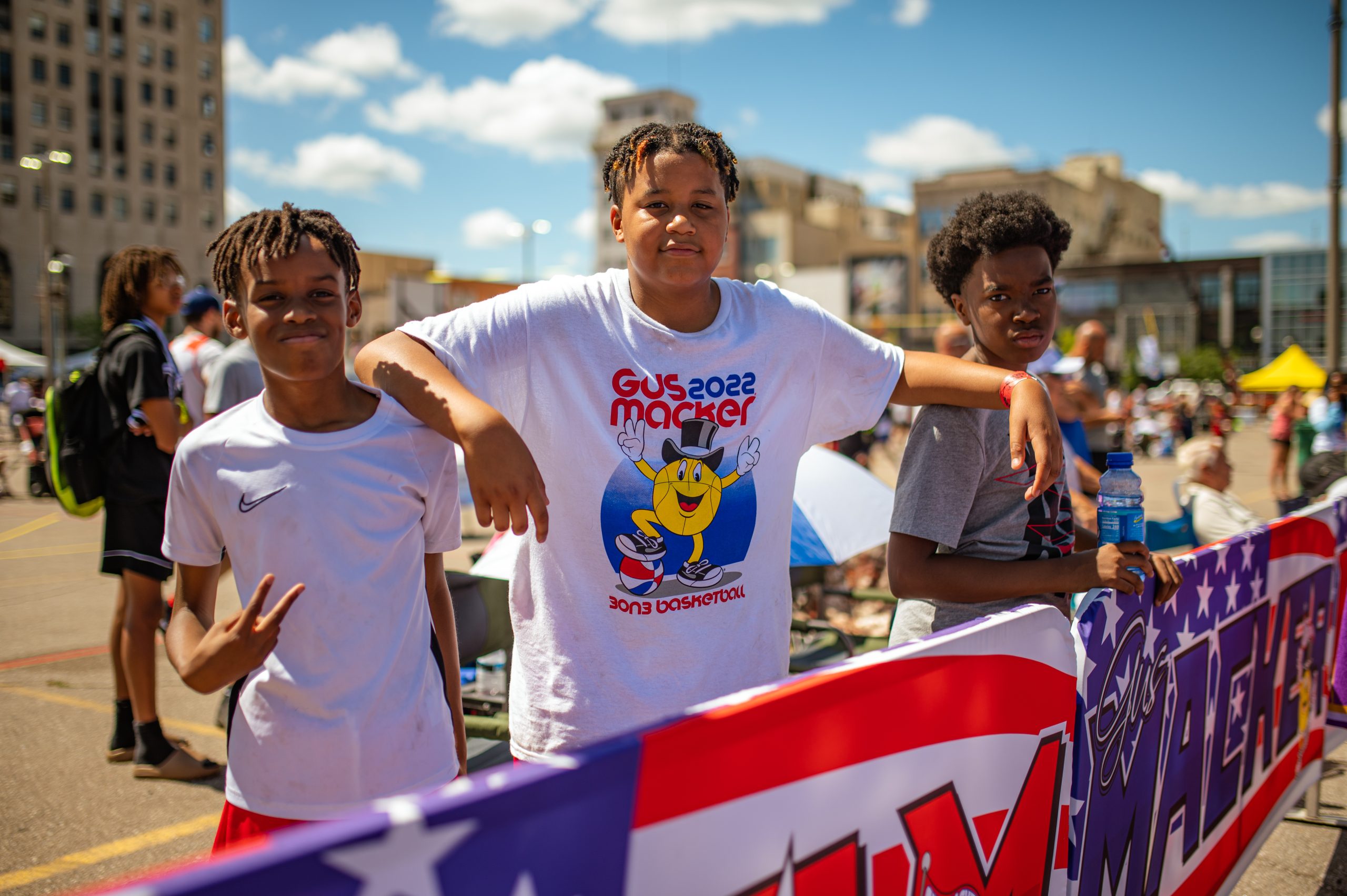 Elijah Mitchell, Nasir Cleaves and Robert Charleston pose for a portrait while watching the Homie Hoopers play the Supersonic Ballers during the Gus Macker three-on-three basketball tournament in the Flat Lot in Flint, Mich., on July 30, 2022. (Michael Indriolo | Flint Beat)
