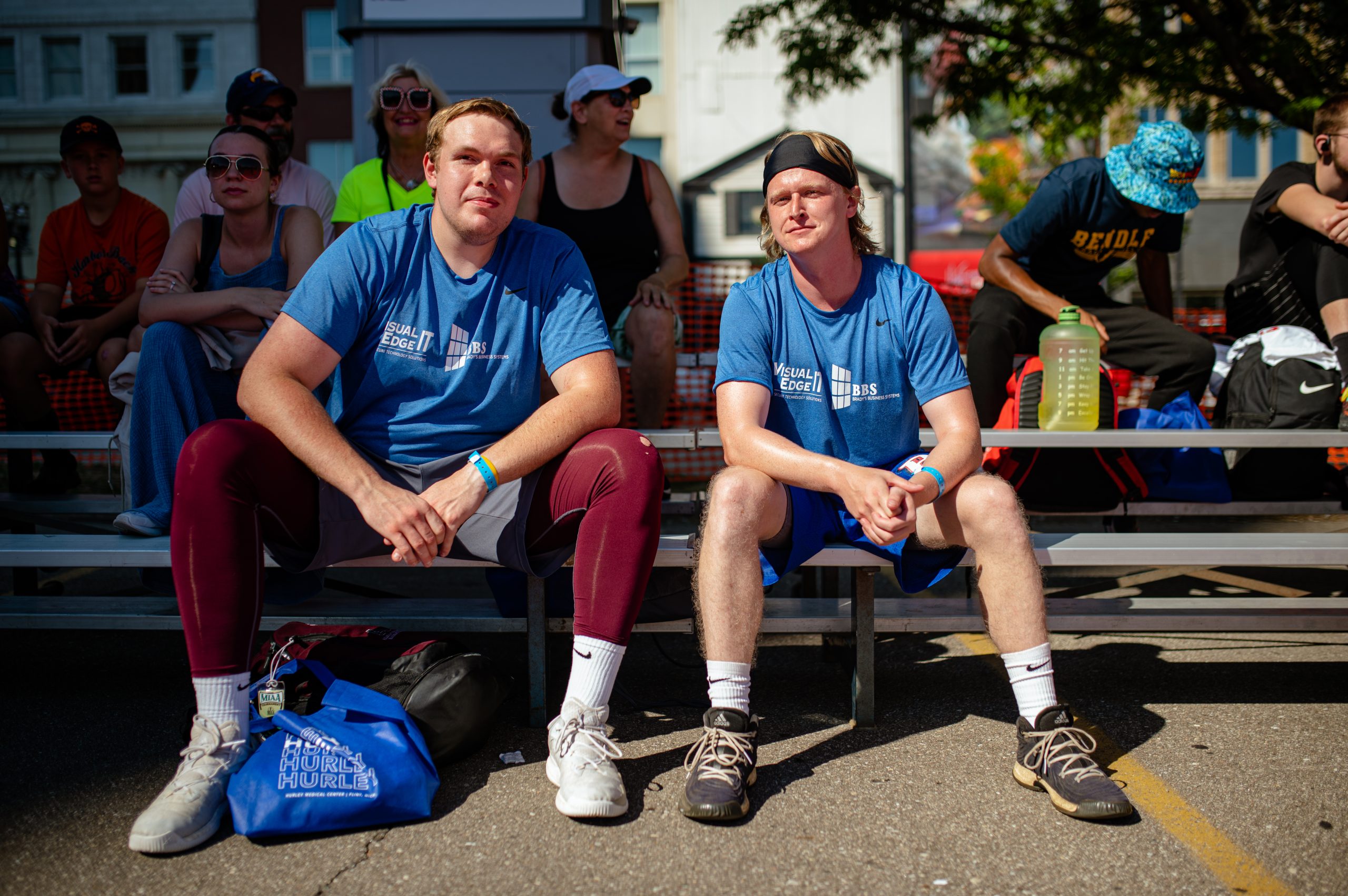 Zach Sinke and Marcus Malling pose for a portrait during the Gus Macker three-on-three basketball tournament in the Flat Lot in Flint, Mich., on July 30, 2022. (Michael Indriolo | Flint Beat)