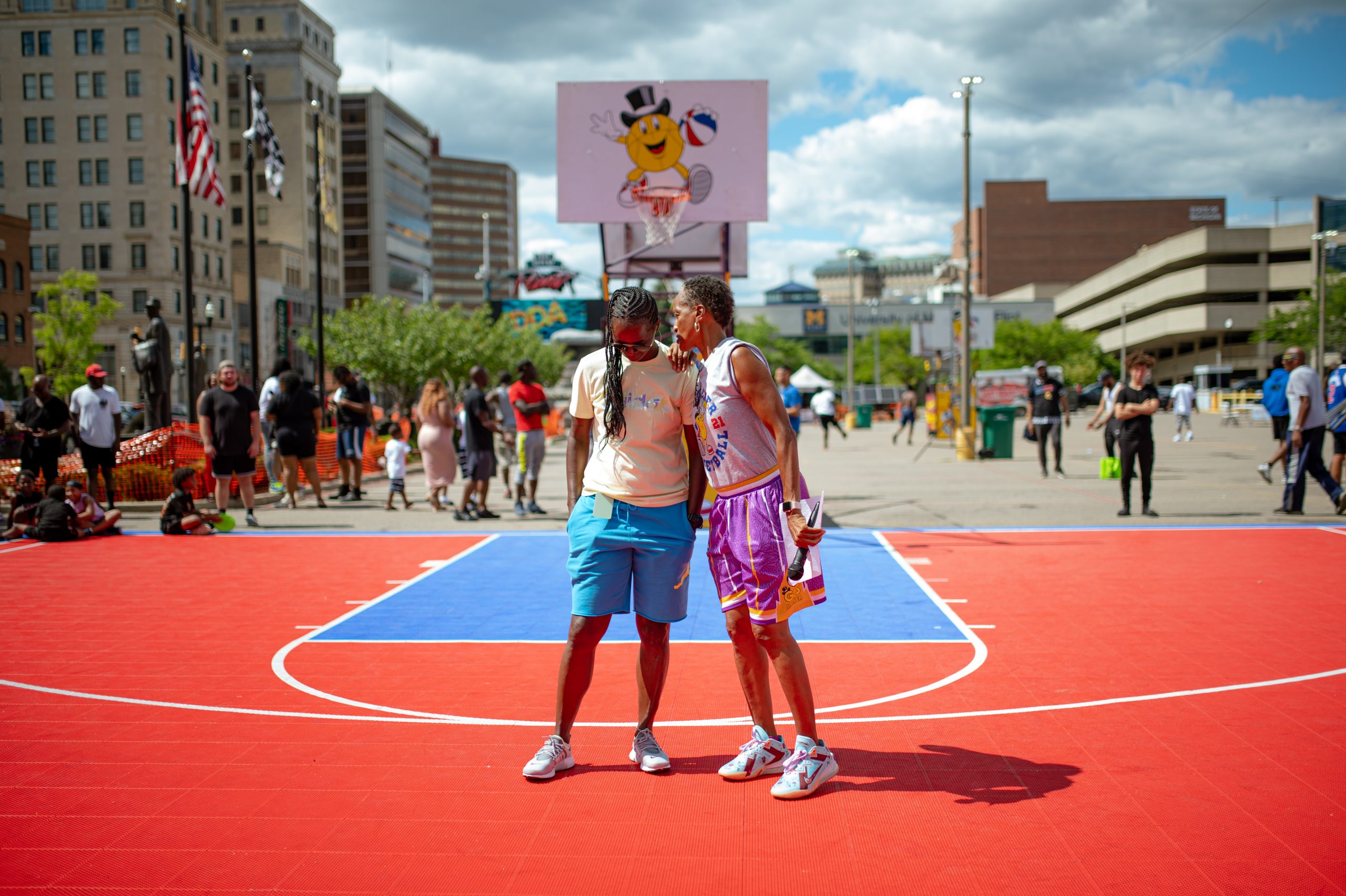 After winning the three-point contest, Taleesha Hardy hugs the runner-up while tournament coordinator Linnell Jones-McKenney waits to congratulate her during the Gus Macker three-on-three basketball tournament in the Flat Lot in Flint, Mich. on July 30, 2022. (Michael Indriolo | Flint Beat)