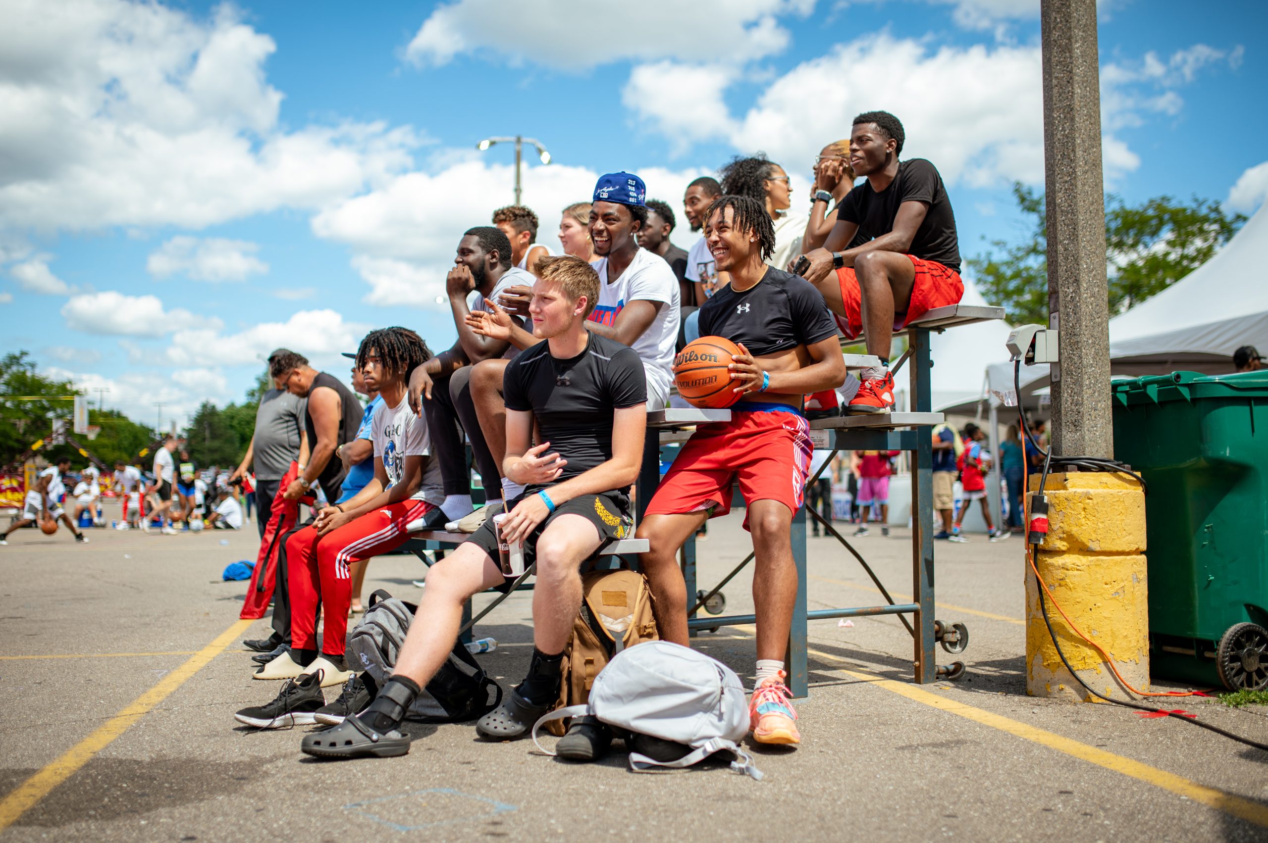Audience members watch players line up for the three-point contest during the Gus Macker three-on-three basketball tournament in the Flat Lot in Flint, Mich., on July 30, 2022. (Michael Indriolo | Flint Beat)Julianna Moncayo watches players line up for the three-point contest during the Gus Macker three-on-three basketball tournament in the Flat Lot in Flint, Mich., on July 30, 2022. (Michael Indriolo | Flint Beat)