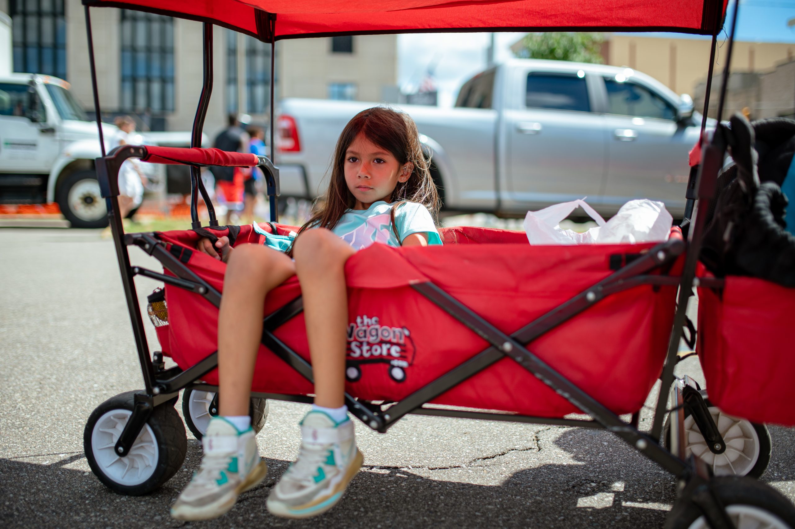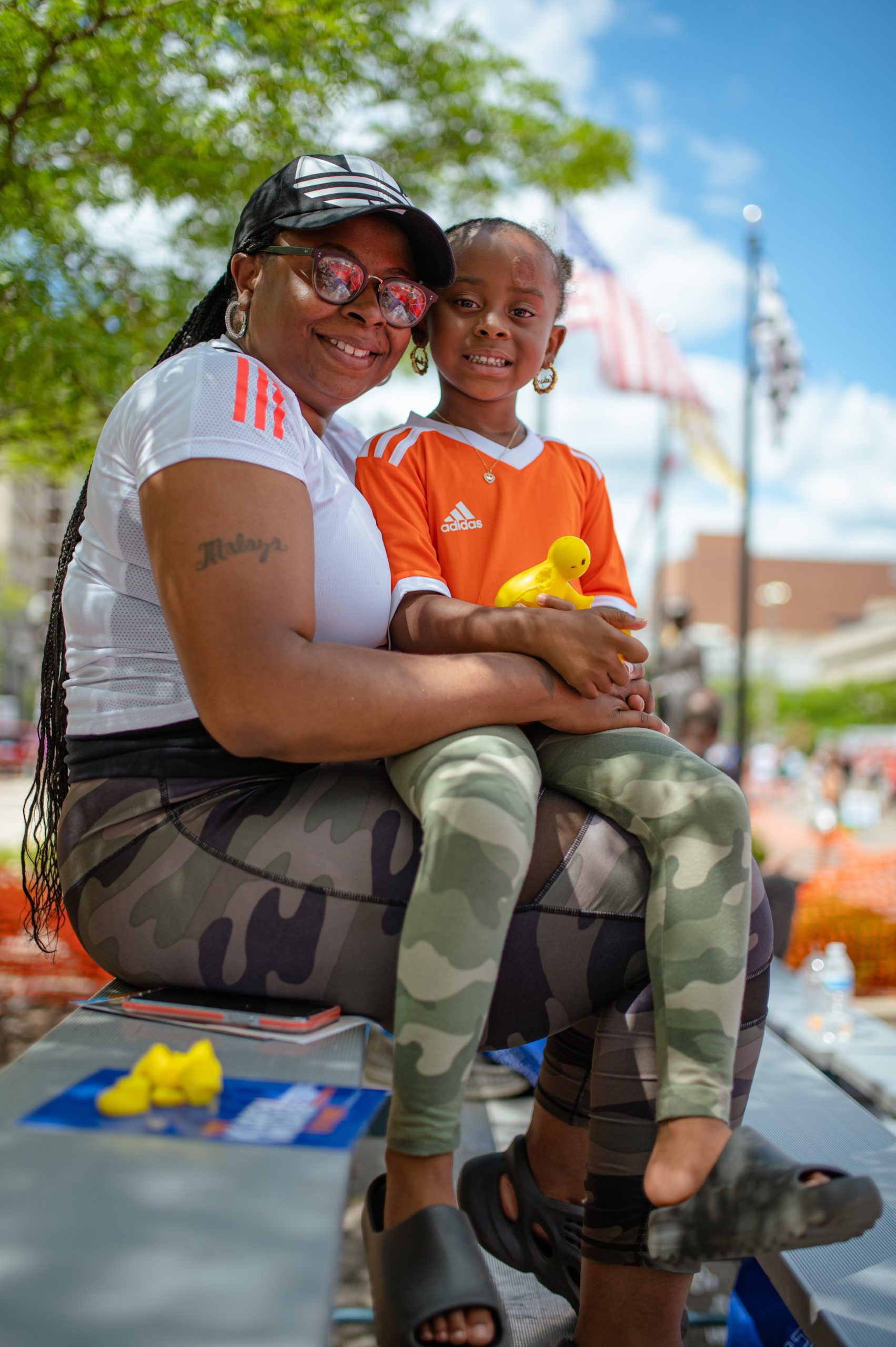 Meochee McCombs and Madisyn McCombs pose for a portrait during the Gus Macker three-on-three basketball tournament in the Flat Lot in Flint, Mich., on July 30, 2022. (Michael Indriolo | Flint Beat)