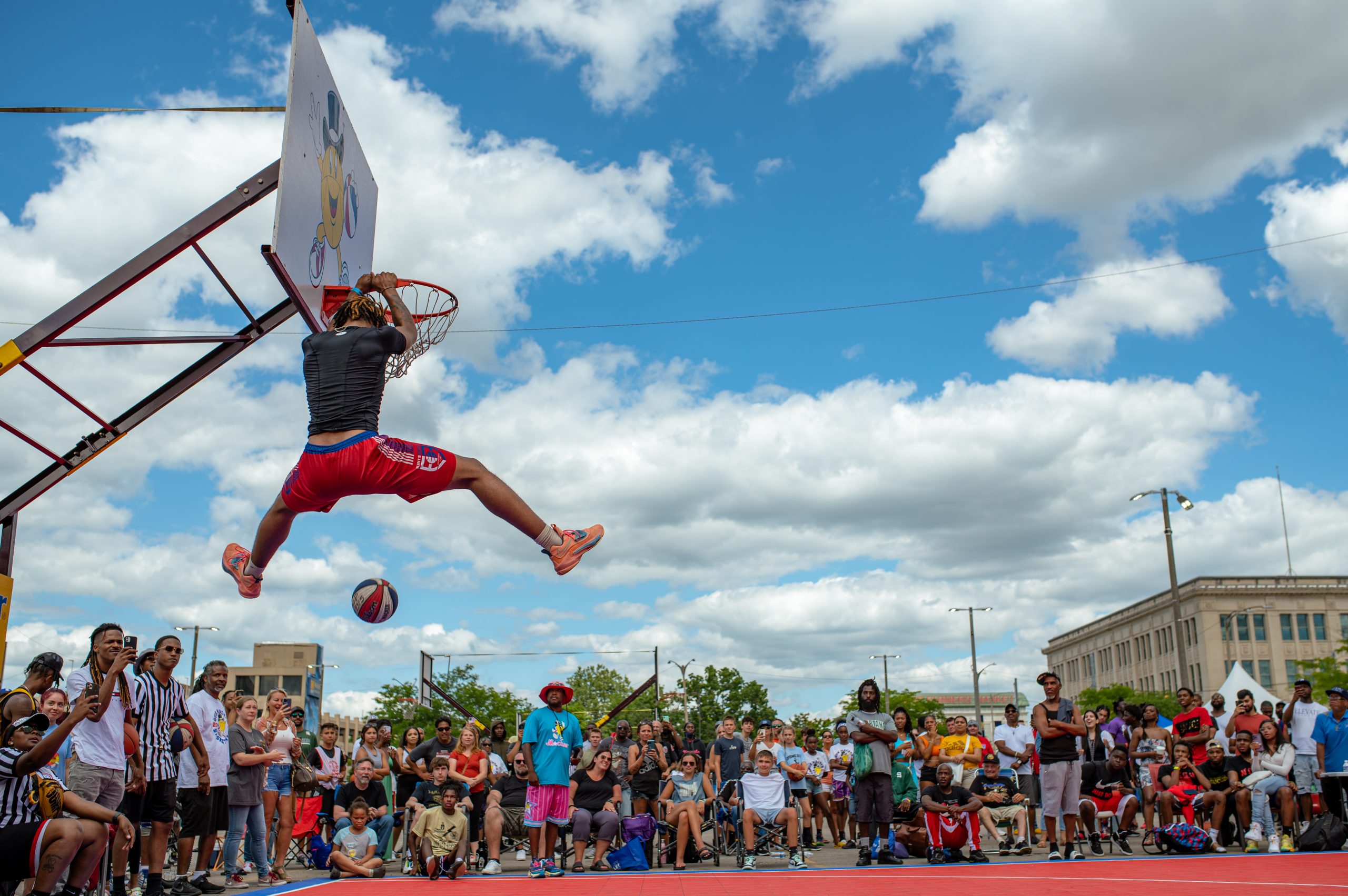 Andre Ridley competes in the dunk contest during the Gus Macker three-on-three basketball tournament in the Flat Lot in Flint, Mich., on July 30, 2022. (Michael Indriolo | Flint Beat)