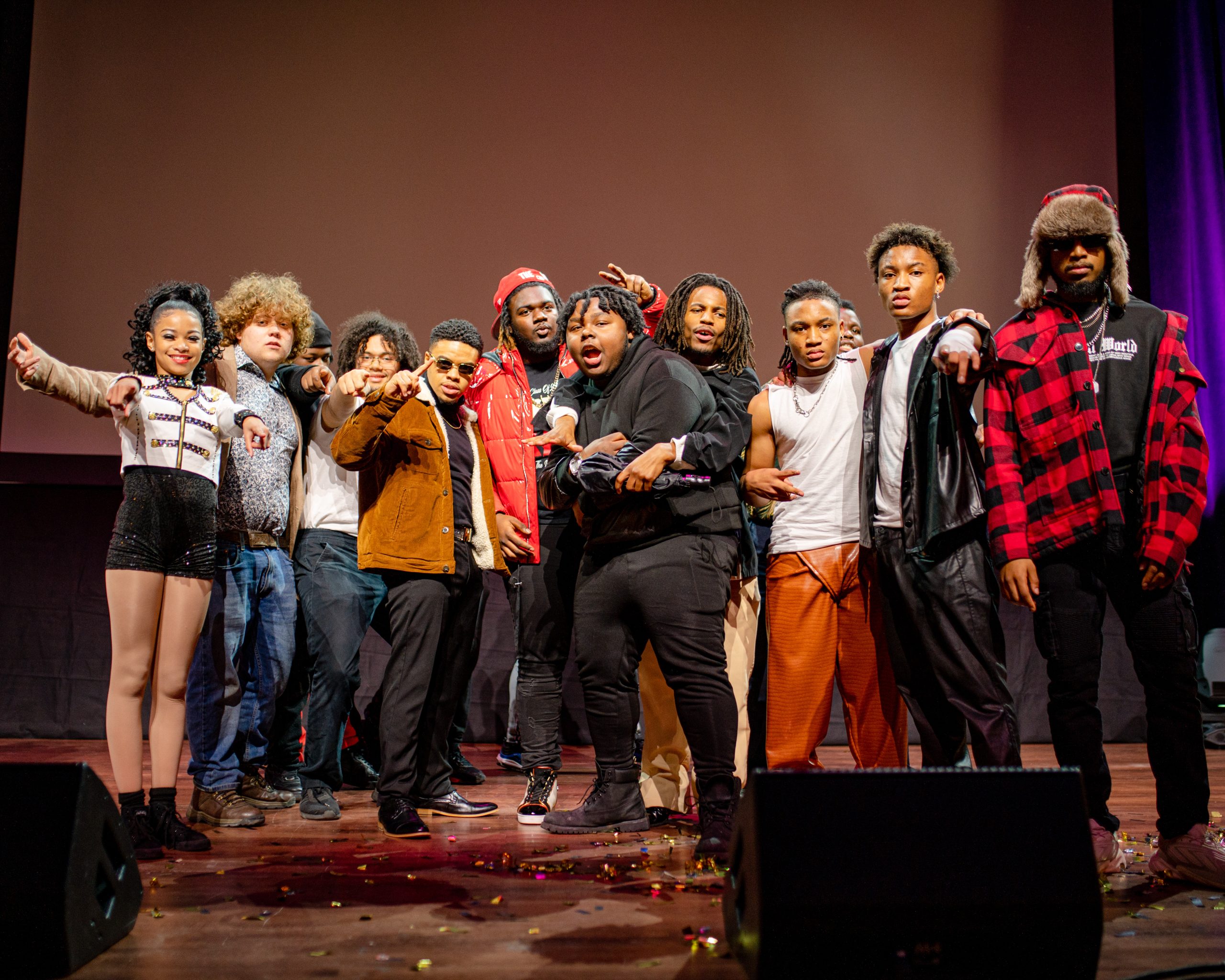 Contestants pose together for a picture on stage after WOW Outreach’s Flint’s Got Talent showcase at the Capitol Theatre in Flint, Mich. on Friday, Dec. 16, 2022. (Michael Indriolo | Flint Beat)